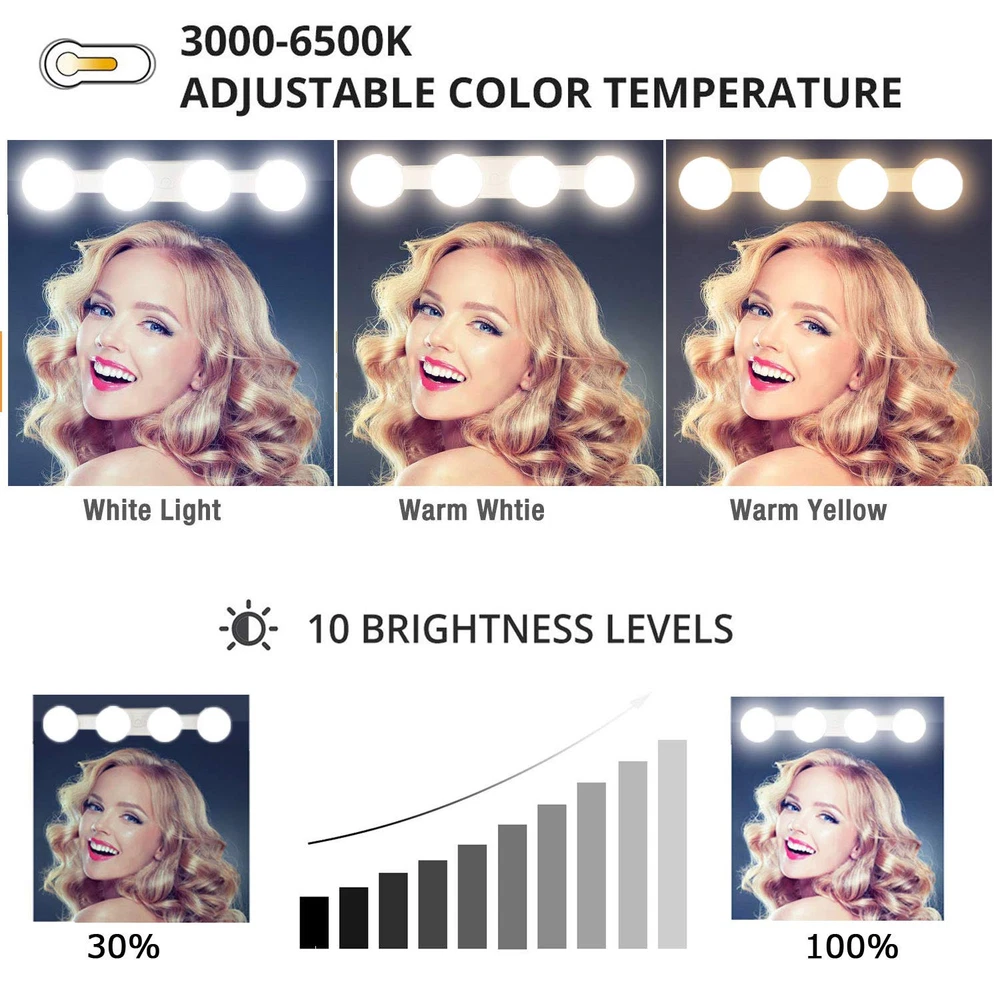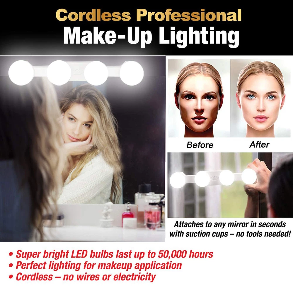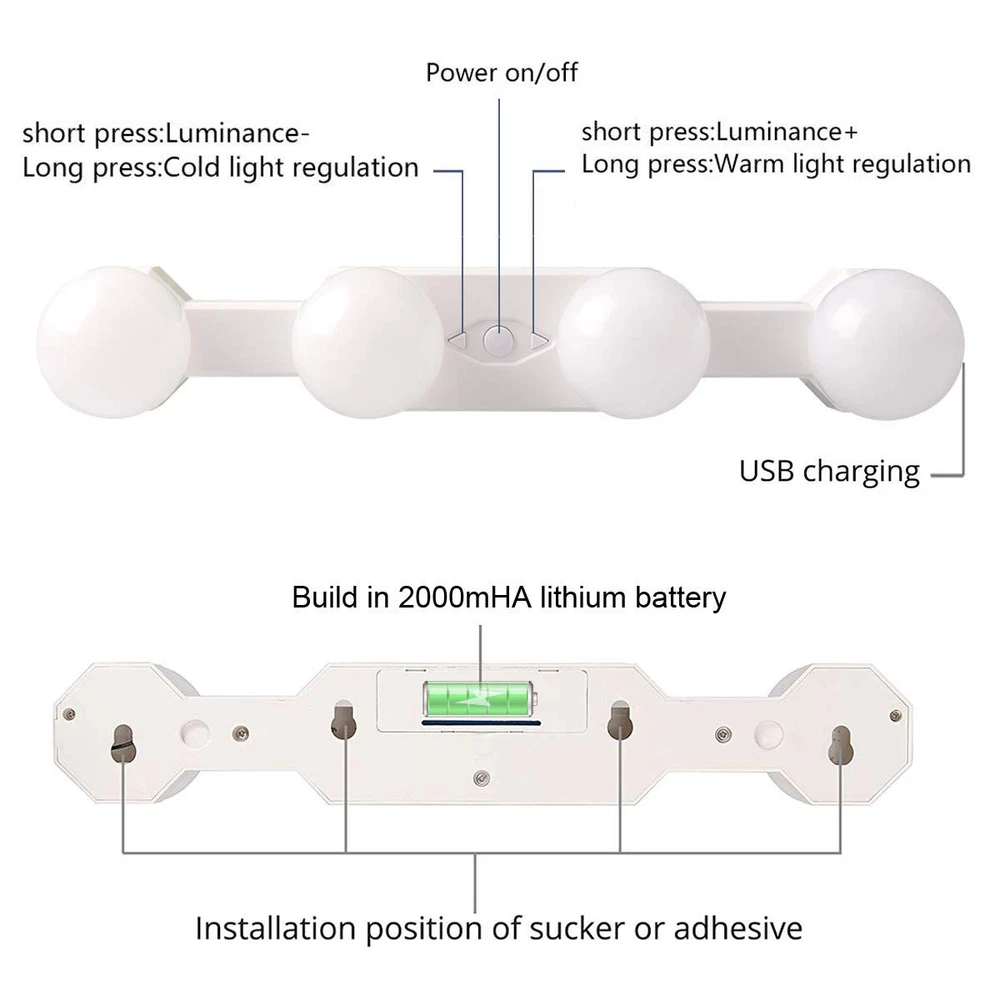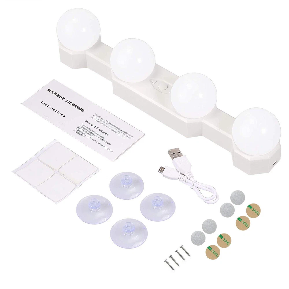 Hollywood Style Rechargeable LED Vanity Mirror Lights Bulbs Features: 1. Simulated Natural Daylight, gives you the most natural, even illumination. 2. Rechargeable, Build in 2000mHA lithium battery. 3. Dimmable Switch, With 10-level brightness dimmer, 3200K-6500K LED color temperature adjustment buttons. 4. Cordless design, installs in seconds using included suction cups, no tools or wiring required. 5. Portable Design ,Take it off the mirror and on the road, easily fits in a suitcase or duffle bag. 6. Perfect makeup lights makes a great gift for moms, grandmas, sisters, daughters, friends & bridesmaids. Specification: Type: LED Mirror Light Material: ABS + PC Color: White LED Color Temperature: 3200K - 6500K Charging time: 2-3 H Use time: maximum brightness 5H, minimum brightness 40H Product Size: 30 * 5 * 6cm / 11.8 * 1.9 * 2.3in Product Weight: 258g / 9.1oz Package List: 1 x LED Mirror Light 1 x USB Cable 4 x Suction Cup 4 x Adhesive Pad 4 x Magnet 4x Screws 1 x User Manual How to install? 1. Wipe the mirror and the three suction cups with a wet towel. 2. Gently attach the mirror light to a clean mirror. 【Super bright & eye protection】 4 Bright hollywood style LED light bulbs glow evenly without glare. 【Rechargeable & wireless】 Vanity lights is built-in rechargeable lithium battery 2000mAh,can be charged by USB cable, say goodbye to those pesky wires. 【3 Color Modes】 Daylight white and warm white and Natural light 3 light color options meet your different needs in different occasion. 【4 Installation Modes】 Suction cups ,3M rubber , screws , magnet,different installation methods can be installed in different places. 【Multi-Applications】Multi-functional led lights,which can be widely used for kitchen cupboard lights, wardrobe lamp, writing desk lights, bathroom lights, makeup dressing table lights, light, etc.