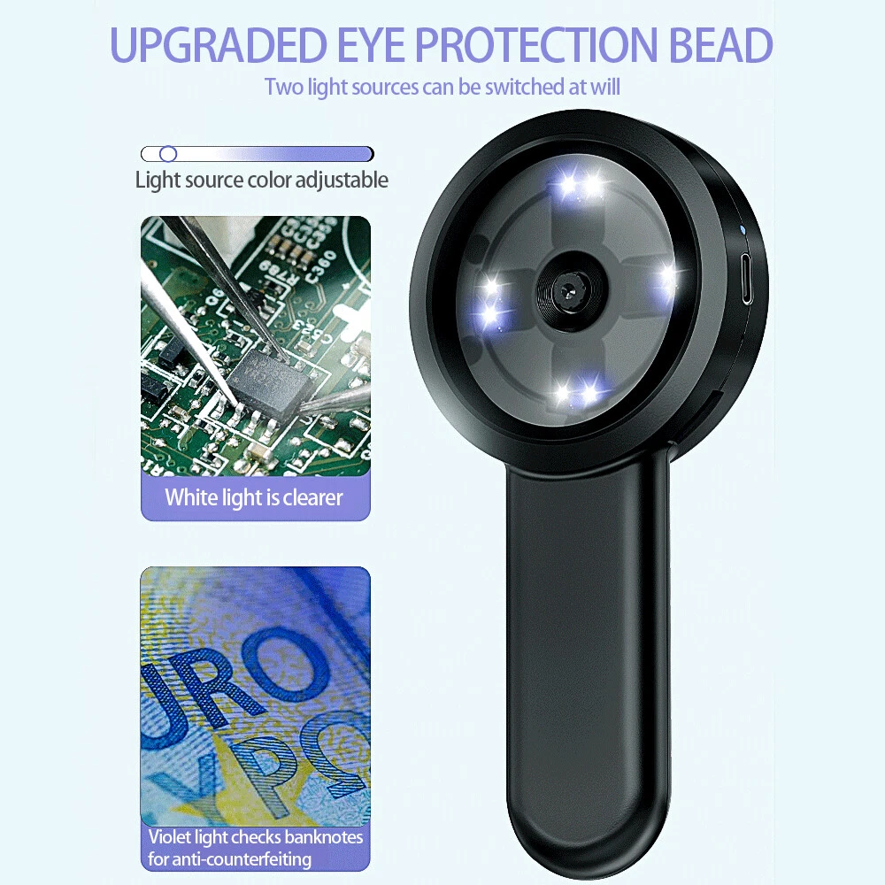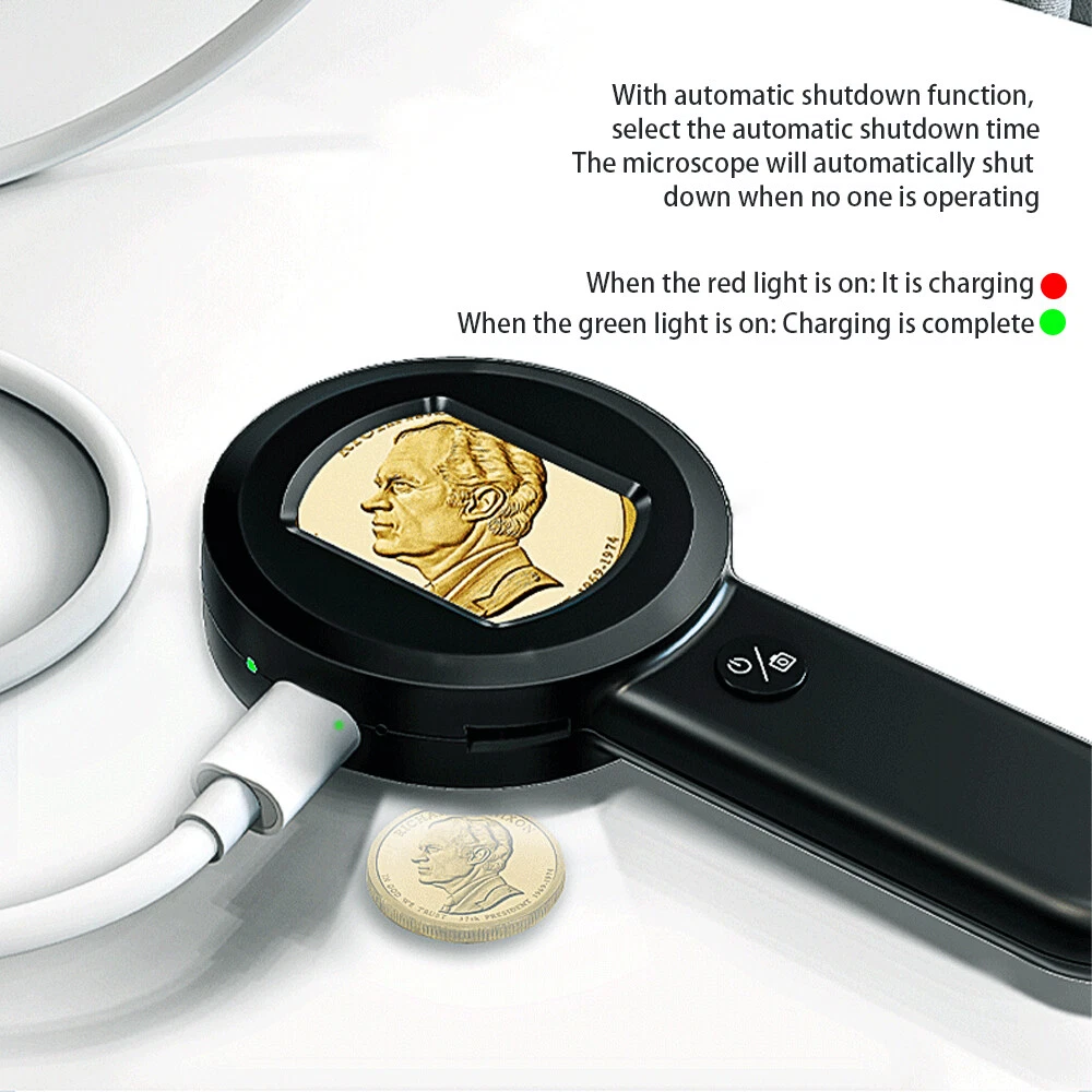 【Visible & Shareable 2" LCD Screen】 P10 miniscope takes seriously close-up, clear shots of everything. You can use this kids' microscope live on the screen with a great, clear picture. Compared to other pocket microscopes, the easy-sharing screen greatly enhances the fun of exploring nature. 【Mini & Lightweight Design】 The little microscope weighs only 3.9 oz, easily fits into your pocket for portability. Ideal for hobbyists, jewelers, and nature enthusiasts who need a reliable magnification tool anywhere they go. Kids can share lots of fun looking close up at nature in the park and at the creek now! 【Easy to Operate】This pocket scope is designed for user-friendliness. With a fixed 100x magnification, there's no need to adjust settings. Simply power on the mini scope, place the illuminated magnifier about 0.3 inches from the object, and you'll get a clear 100x magnified image! It's easy for both kids and adults to use. A handy tool for micro things. 【Powerful 100X Magnification】If you work with small items and really need to see up close, this is the loupe magnifier for you. The 100X fixed magnification provides a very clear view of the ring letters. It's nice to have a digital magnifier for jewelry, diamonds, gems, coins, stamps, and rocks to know if you've got the real deal. With great size and optics, all housed in a rugged case, it's an essential tool for anyone who needs precise inspection. 【4 White Lights + 4 UV Lights】When the electron magnifying glass with light turns on, the LEDs that illuminate the image light up below the lens making it easy to see what you are looking at. You can switch the light from white lights or UV light according needs. (NOTE: The brightness is unadjustable) 【16MP Camera & 8GB SD Card】With the ability to capture high-resolution 16MP images, it facilitates detailed documentation of microscopic specimens, making it an invaluable tool for scientific research, education, and personal exploration. Whether you're a student, scientist, hobbyist, or educator, a mini microscope camera provides an immersive and interactive way to explore the microscopic world, fostering curiosity and discovery. 【PC Connection for Large Viewing】Plugging it into a computer unlocks a whole new realm of possibilities. This usb microscope easily connects to a computer for use on a larger scale. Therefore, you can view large images on a large screen. You can also easily document and upload them to the internet! 【Built-in Rechargeable Battery】The 500mAh battery offers up to 50 minutes of working time and enhanced portability, allowing for usage in various settings, including outdoor environments, classrooms, and field research. Independence from electrical outlets, users can explore and observe specimens without constraints, making it ideal for on-the-go exploration. 【A Wonderful Offering】 It's incredibly user-friendly. Great digital microscope for kids science discovery. Totally recommend this to any parent who wants to fan that flame of learning science and get their kids to enjoy learning and off of tv and video games for a bit. This is clearly an excellent birthday/Christmas offering for Childrens What's in the box 1x P10 portable microscope 1x 8GB Micro SD Card 1x USB Cable 1x Manual
