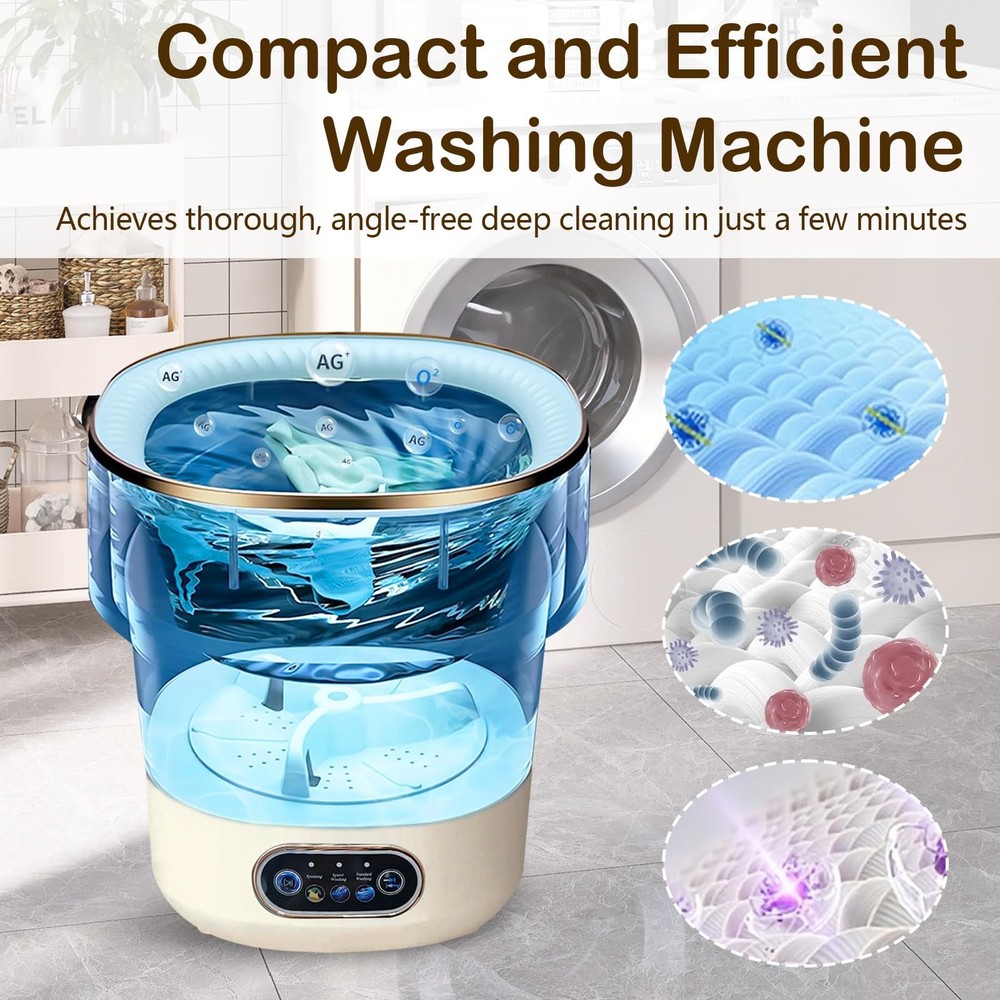 Portable & Space - Saving Design: This compact washing machine weighs just 4.6 pounds and comes equipped with a spin basket, a drain hose, and a blue - light function. Its lightweight and space - saving nature makes it an excellent choice for apartments, dormitories, RVs, and even camping or travel. Gentle on Delicate Items: Made from TPE and silicone materials, it's perfect for washing delicate items like underwear, Tiny clothes, diapers, towels, socks, and toys. It meets your most intimate laundry needs gently yet effectively. 15L Capacity Upgrade: With a 15 - liter capacity, this portable washer can handle one adult load at a time, including up to 3 t - shirts, 6 towels, 6 undergarments, or 6 children's items. Wash more with less effort and reduce the number of loads. Powerful Stain Removal: Featuring timer options, this mini washing machine mimics hand - scrubbing with precise wash speeds, ensuring effective stain removal. It can meet a wide range of cleaning requirements. Innovative Folding Design for Storage: The unique folding design maximizes space efficiency. When unfolded, it measures 12x13x13.5 inches, and when folded, it's only 12x12.5x5 inches. You can easily it under a bed or in small spaces without any clutter. Portable & Space - Saving Design: This compact washing machine weighs just 4.6 pounds and comes equipped with a spin basket, a drain hose, and a blue - light function. Its lightweight and space - saving nature makes it an excellent choice for apartments, dormitories, RVs, and even camping or travel Gentle & Effective: Crafted from TPE and food-grade silicone materials, this mini washing machine is ideal for washing delicate items such as underwear, baby clothes, diapers, towels, socks, and toys. Gentle yet effective for your most intimate laundry needs. Gentle on Delicate Items: Made from TPE and silicone materials, it's perfect for washing delicate items like underwear, Tiny clothes, diapers, towels, socks, and toys. It meets your most intimate laundry needs gently yet effectively 15L Capacity Upgrade: With a 15 - liter capacity, this portable washer can handle one adult load at a time, including up to 3 t - shirts, 6 towels, 6 undergarments, or 6 children's items. Wash more with less effort and reduce the number of loads. Powerful Stain Removal: Featuring timer options, this mini washing machine mimics hand - scrubbing with precise wash speeds, ensuring effective stain removal. It can meet a wide range of cleaning requirements Innovative Folding Design for Storage: The unique folding design maximizes space efficiency. When unfolded, it measures 12x13x13.5 inches, and when folded, it's only 12x12.5x5 inches. You can easily it under a bed or in small spaces without any clutter