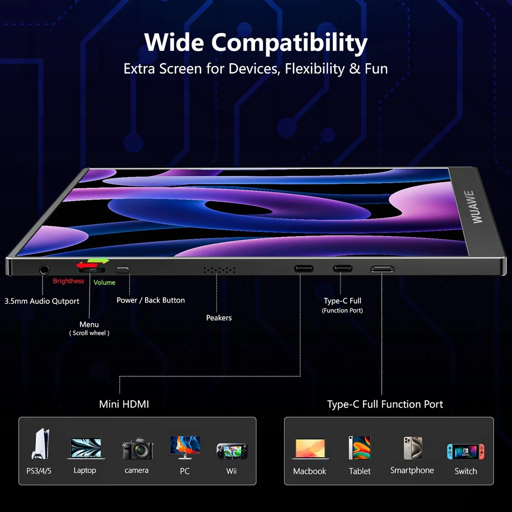 1200P 16'' Portable Laptop Monitor: The 16" portable monitor with 1920x1200P, featuring 300cd/m² brightness, a 1200:1 contrast ratio, HDR, Freesync, and low blue light, making your gaming and work experience truly immersive. It is suitable for various application scenarios such as meeting rooms, shopping malls, office buildings, cafes, universities, and industrial parks Adjustable Stand: The pull-out kickstand attached to the back stays exactly where you adjust it, Its ability to work in both landscape and portrait modes adds to its versatility, whether you’re working, gaming, extending your laptop screen, or using it as a handy phone display Plug and Play Portable Monitor: Simply connect to power and display signal transmission using a USB Type-C cable - no drivers needed. Portable monitor for laptop equipped with 2 USB Type-C ports and Mini-HDMI port, easily connect to your laptop, PC, cell phone, Mac, PS5/PS4, Switch for seamless connectivity on-the-go(Note: Thunderbolt 3.0 or USB 3.1 Type C DP ALT-MODE required for compatibility) Multiple Display Mode: This portable computer monitor supports duplicate, extended, second screen, and vertical display mode, bringing high efficiency to your meetings, work from home, and travel. Having a second monitor for laptop significantly enhances your multitasking abilities, allowing you to handle multiple tasks with ease! Slim and Lightweight: This 16" external monitor for laptop portable is only 1.58 pounds and 0.37 inches thick, it's the perfect size for packing in your bag and taking with you wherever you go. It would have made traveling for work so much more enjoyable, you can watch movies, play games, or get work done at the airport, hotel, or even a coffee shop! Plus, with a 2-year warranty and offers 24/7 customer service