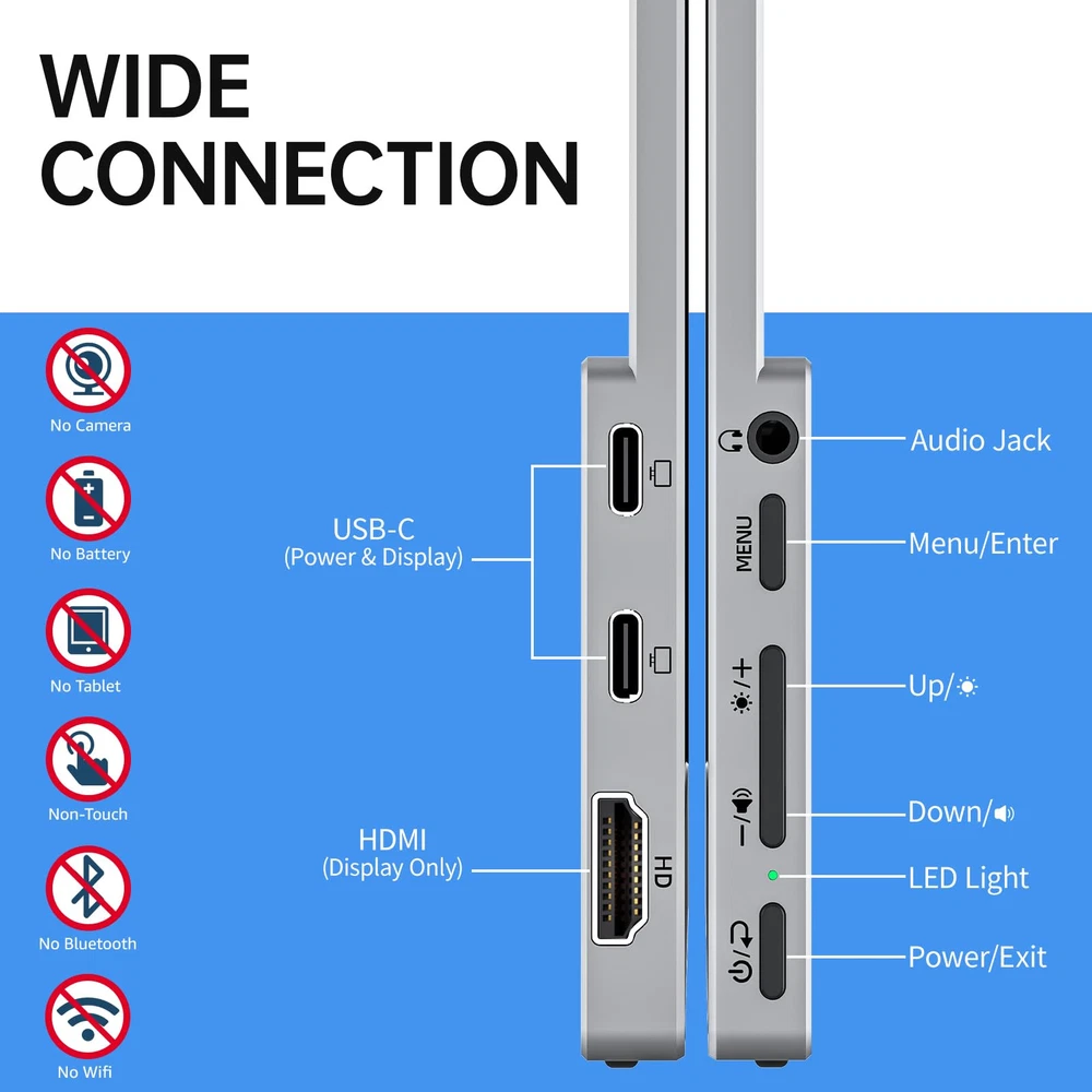 Portable Screen for Laptop: portable monitor, with 1920 x 1080 resolution, lets you work and play on the go. With its sleek design and lightweight construction, you can easily take it with you. Perfect for presentations, gaming, and working, this portable external display is a must-have for anyone who wants to stay productive and entertained Plug and Play: For the devices(laptop or PC) with Thunderbolt 3/4 port, only one original USB-C to USB-C cable is required for both the video signal and power supply, No driver is required, and easy to use. Made of sleek and solid aluminum, it's only 0.23 inches and 1.6 pounds lightweight and allows you to easily bring this monitor on a business trip and travel Wide Compatibility and VESA Mountable: With dual USB-C Ports and one upgraded standard HDMI port, this monitor is compatible with Laptop, PC, Mac, Surface, PS4, PS5, Xbox, Raspberry Pi, Camera and etc. It supports duplicate and extend mode to expand your screen. The two VESA holes on the back are perfect for both Landscape and Portrait modes. The magnetic cover provides adequate protection and supports multi-angles to set up the display High Performance Display with All Accessories: 2 built-in stereo speakers provide an immersive experience for music, movies, video games. This portable monitor comes with 3 cables (HDMI; USB-C to USB-C; USB-A to USB-C), a power adapter, and a magnetic cover. 15.6-inch portable screen, wide color gamut, 178° viewing angle, 3ms response time, HDR, Eye Care, Low Blue Light, and FreeSync features, brings you an immersive visual experience Professional Support Team: portable travel monitor is built on a long history of customer satisfaction, and we would not have made it without you. With each portable display, you can get tech support. That's why we want you to be 100% confident in your purchase