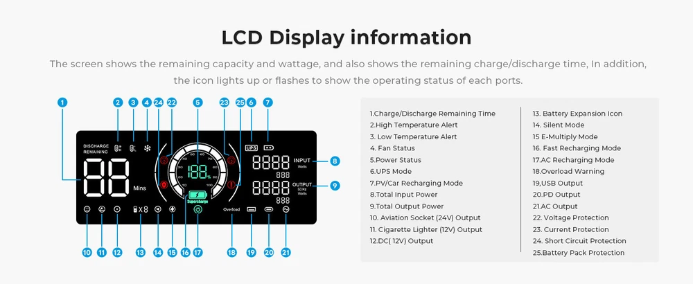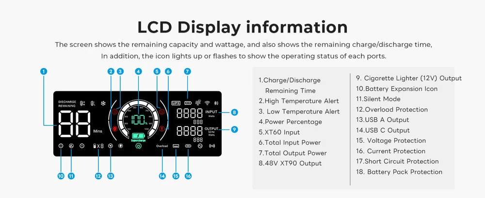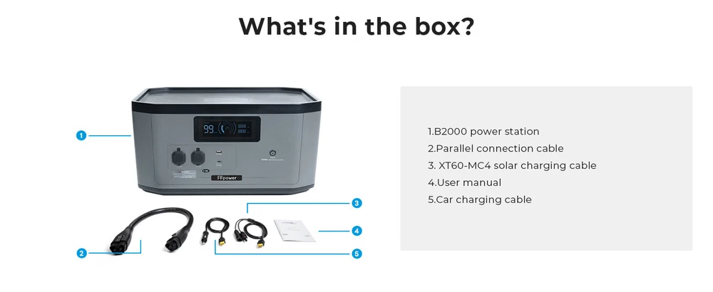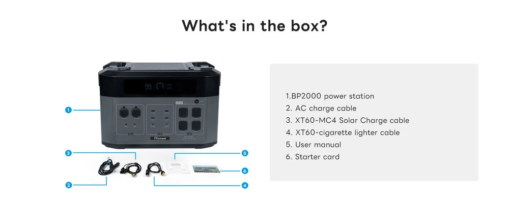 Product Description Features: This is a portable power station, perfect for home emergency power back up and off-grid living. lt was built-in LiFePO4 batteries, which supports AC charging, car charging, and solar panel charging. (lt also has UPS function, which ensures continuous power, get non-stop power with a switchover time ofless than 10 ms.) *Applications: (1)Outdoor: Car electronics: car refrigerator, car air pump, car vacuum cleaner,etc.; DlY power tools: blowers, lawn mowers, drills, electric saws; camping equipment: cameras, Drones, electric barbecue grills, LED lights,electric air mats. (2)Indoors: Washing machines, TVs, radios, electric blankets, refrigerators.kitchen appliances (cooking appliances), microwave ovens, cookingheaters, coffee makers, rice cookers, laptop computers, mobile phones,lighting equipment,etc. Inculded: 1. B2000 Expansion Battery*1 or BP2000 power station*1 or B2000 Expansion*1 Battery+BP2000 power station*1 (Optional) 2. AC charge cable 3.XT60-MC4 Solar Charge cable 4.XT60-cigarette lighter cable 5. User manual 6. Starter card Note: Before using the product, please read the user manual carefully to ensure that you fully understand it before use. After reading, please keep the user's manual in a safe place for future reference. lf you use this product incorrectly,you may cause serious injury to yourself or others, as well as product damage and property damage.Once you use this product, you can be deemed to have understood recognized and accepted all the terms of this manual. Users under take responsibility for their own actions and all the consequences that may arise therefrom. *Attention! When switch to the AC Quick charge mode, you need to ensure that theoutput voltage of the power supply device meets 100-120V and the outputcurrent is greater than 15A.1. The corresponding charging power is 1800W when the output voltage ofpower supply equipment is 120V and the output current is greater than15A.2. lt is not recommended to use the voltage range beyond 100-120V tocharge the product, because it may cause damage to the BP2000 powerstation, which is not covered by the warranty. Payment Returns Contact Us Shipping Feedback 1. We only accept eBay payments. 2. All payments must be made within 3 days after auction won. Item may be returned for refund or replacement within 30 days of the purchase date. Returned merchandise must be unused, in original packaging and include all accessories. Shipping costs are non-refundable. Please do not hesitate to leave us your 5 Star ★★★★★ of DSR positive feedback if you are satisfaction with our products ,delivery or services . If you have Any Questions Or Unsatisfied with your purchase, please Email us firstly to get a better solution before you leave a neutral or negative feedback, we work hard to make sure every customer 100% satisfied and resolve anyproblem for you. Please email us first in the following situations: 1.The item can't work properly. 2.The item broken on the post. 3.You bought or received the wrong items. 4.You have not received your shipment within the period. 5.Before you give us Negative feedback. 6.Before you open a case/return on eBay. All questions will be replied within 24 hours (Except Saturday and Sunday or holidays). Thank you for your kindness! 1. eBay Payments Confirmed Addresses Only. 2. No Delivery to Alaska and Hawaii or PR. 3. No P.O. Box and APO/FPO Delivery. 4. Tracking Number will be provided. 5. Domestic shipping is within the 48 Contiguous States of United States, the delivery time is between 2 and 8 days. Items will be shipped by UPS, USPS or Fedex within 3 business day after receiving full payment. 6. International shipping is from China, the delivery time is between 10 and 30 working days. As a seller , Positive Feedback is very important to us. We try our best to let our customers to be happy. If you have any question about your order, please contact us ,please let us know before you Leave the Negative feedback ,We are willing to do our best to make up for it, Thank you very much ! Payment 1. We only accept eBay payments. 2. All payments must be made within 3 days after auction won. Returns Item may be returned for refund or replacement within 30 days of the purchase date. Returned merchandise must be unused, in original packaging and include all accessories. Shipping costs are non-refundable. Please do not hesitate to leave us your 5 Star ★★★★★ of DSR positive feedback if you are satisfaction with our products ,delivery or services . Contact Us If you have Any Questions Or Unsatisfied with your purchase, please Email us firstly to get a better solution before you leave a neutral or negative feedback, we work hard to make sure every customer 100% satisfied and resolve anyproblem for you. Please email us first in the following situations: 1.The item can't work properly. 2.The item broken on the post. 3.You bought or received the wrong items. 4.You have not received your shipment within the period. 5.Before you give us Negative feedback. 6.Before you open a case/return on eBay. All questions will be replied within 24 hours (Except Saturday and Sunday or holidays). Thank you for your kindness! Shipping 1. eBay Payments Confirmed Addresses Only. 2. No Delivery to Alaska and Hawaii or PR. 3. No P.O. Box and APO/FPO Delivery. 4. Tracking Number will be provided. 5. Domestic shipping is within the 48 Contiguous States of United States, the delivery time is between 2 and 8 days. Items will be shipped by UPS, USPS or Fedex within 3 business day after receiving full payment. 6. International shipping is from China, the delivery time is between 10 and 30 working days. Feedback As a seller , Positive Feedback is very important to us. We try our best to let our customers to be happy. If you have any question about your order, please contact us ,please let us know before you Leave the Negative feedback ,We are willing to do our best to make up for it, Thank you very much ! power