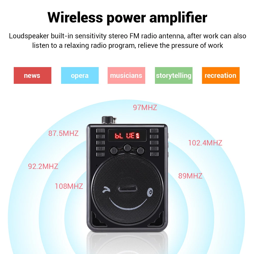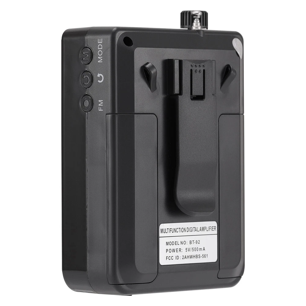 Product Information: Brand:Unbranded Color:Black Product size: 12cm*9cm*5cm Material: ABS Bluetooth model: BT-92 Function: Bluetooth BT connection, USB flash drive, FM, TF card Input voltage: DC5V 0.5A Frequency response: 80HZ --12Khz Output power: 3w Working voltage: 3.5v-4.7v Battery model: 18650 3.7V 800MAH * 2 Charging time: 2-3 hours Usable time: 4-6 hours Product Dimensions: Length (in.):4.72 Width (in.):3.54 Height (in.):1.97 Package Size: Length (in.):5.57 Width (in.):5.12 Height (in.):2.17 Weight (lbs.):0.728 Product features: 1.High quality speakers, stunning sound effects 2.Bluetooth wireless connection 3.Supports wired microphone input 4.Multiple input methods: Bluetooth, FM, TF card U Disk 5.Lightweight and portable design, comfortable carrying str ap Application scenario: Scenes such as speeches, teaching, conferences, outdoor activities, and family entertainment Package include: Wireless amplifier * 1 Wired microphone * 1 18650 battery (800MAH) * 2 TYPE-C charging cable * 1 Hanging rope * 1- English manual * 1