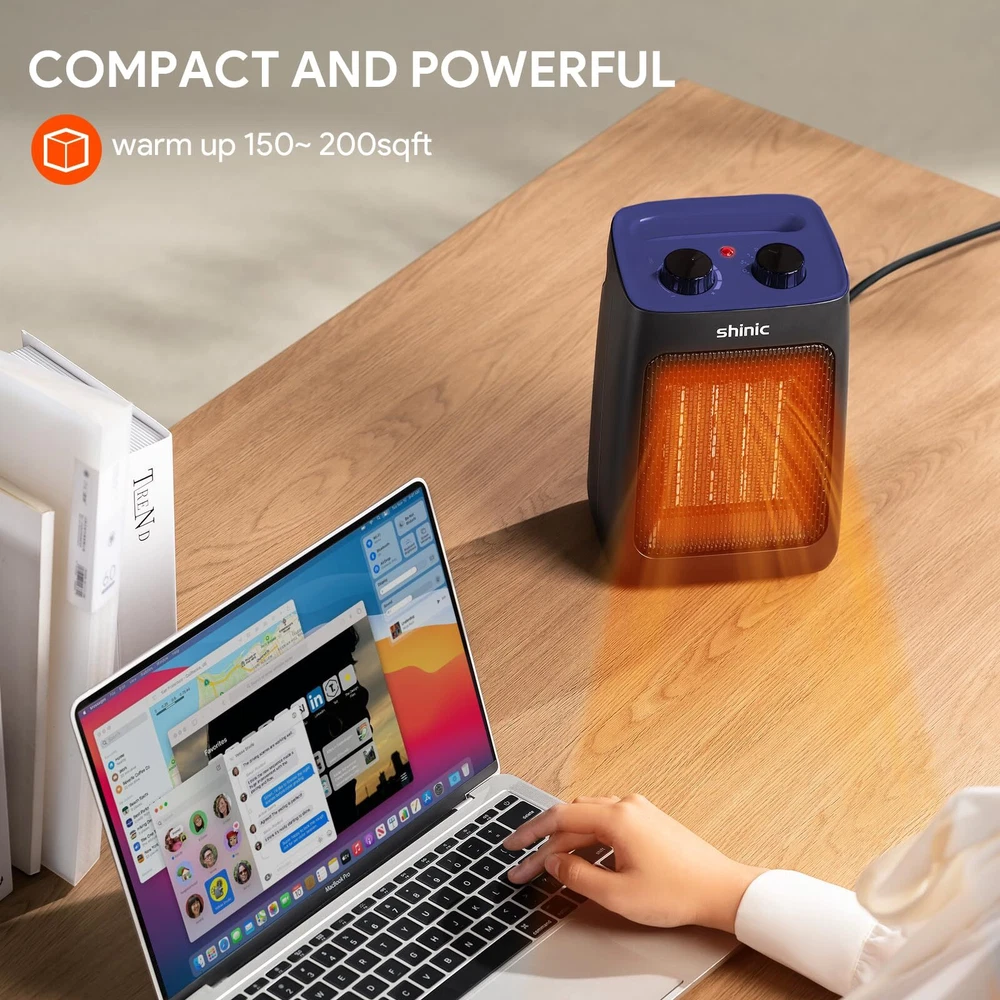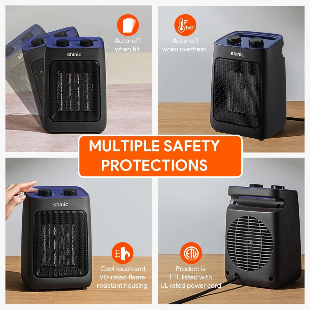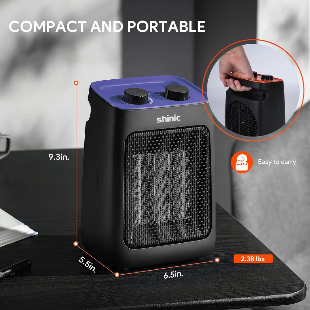 3 Modes and Thermostat:This space heater is deigned with two heat settings, High--1500W and Low--750W, along with a cooling fan function, meeting your needs in different seasons. The small heater is also equipped with adjustable thermostat, which can automatically maintain a constant temperature you set in advance. Efficient Heating:The portable heater uses energy-efficient PTC ceramic heating technology and high-speed fan to improve heating efficiency while saving electricity bills. It can warm a 200 square feet quickly within seconds, perfect for desk, bedroom, office, dorm, sitting room and other small space. Multiple Safety Protection:The room heater is ETL listed and constructed from flame-resistant materials. built in tip-over protection and overheat protection system, which will automatically shut down when it tilts or overheats and ensure the safety of your family. Compact and Portable:The mini heater for indoor use measures 6.5 x 5.5 x 9.3 inches and weighs just 2.38 pounds. With a built in carrying handle and 6-foot UL rated power cord, you can easily use it where you need. Quiet and Comfortable:The office heater body structure has been tested hundreds of times and noise level below 42dB, you can enjoy quiet and warm night sleep in the cold winter. When you need to work or relax quietly, it also won't cause any trouble for you. After Sales:We offer 1 year warranty service, If you have any questions after receiving the heater, please contact us immediately, We will reply within 12 hours.