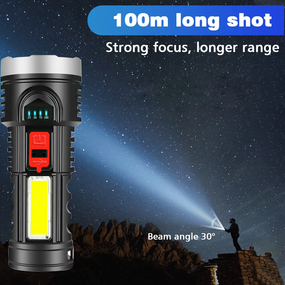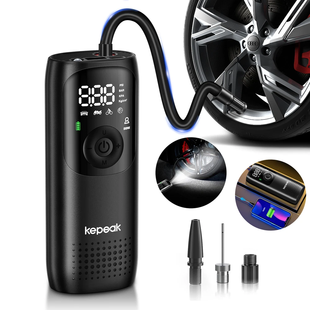 Note: Model B Only USB Flashlight,not include Cordless Tire Inflator Pump!!!! A: Cordless Tire Inflator Pump About this item [One-Click Operation, Auto-stop] You can select from (bicycle, motorcycle, car, ball, custom) 4+N preset modes, and 4 preset units (PSI, KPA, BAR, KG/CM²), which makes this portable tire inflator for car super user friendly. With its one-button design, the portable tire inflator starts inflating with just a simple press. Once the desired pressure is reached, the tire inflator portable automatically stops, no more having to drive to the gas station [Accurate, Daylight Viewable LED Screen] Easy to read even under sunlight, the digital screen displays the target value first, flashes for 3s, and then shows the real-time pressure, the built-in pressure gauge of tire pump with +/- 1.5 PSI accuracy, this car tire air pump portable allowing you to inflate tires to the desired pressure level precisely, don't overinflate or underinflate your tires [All in One Device - Tire Inflator, Flashlight, Power Bank] Not only for tire inflation, 3 modes LED light provide convenience for inflating and changing tires in the dark. USB-C input and USB-A output port, as an emergency power pack for your phone. The car air pump is designed to be practical and hassle-free in any situation [Cordless Inflation, Sto re with Ease] Wireless battery-charged design enables the car tire pump to have easier air inflation. Weighing only 0.93 pounds, the compact size and lightweight tire air pump is convenient to carry around or store in your glove box, trunk, bicycle rack, car, or backpack [Supports Presta Schrader Valve] The air pump for bike tires comes with a Presta valve, connecting the hose directly to Schrader valves, ball needles, and swim rings nozzle, the variety of nozzle attachments included make the tire pump for car portable versatile enough to handle your inflation needs, such as bikes, motorcycles, cars, balls, and small floats Does the tire inflator air compressor support Presta valves? Yes, this bike pump portable come with a presta valve adapter. Which nozzle do I use this car tire air compressor to fill my car tires? Use the nozzle on the hose, this cordless tire pump is no need other attachment for car tires. Is this car tire pump portable suitable for inflating bike tires, motorcycle tires, car tires? Yes, this cordless inflator is suitable for inflating bike tires, motorcycle tires, car tires. it includes a Presta valve adapter, allowing it to be used as a bike tire compressor. Does this portable car compressor automatically shut off when desired pressure is reached? Yes, this portable car pump is easy to use and it will automatically shut off once the desired pressure is reached. =========================================== B: USB Bright Flashlight Feature: 1.USB Rechargeable: Micro USB charging port, supports multiple charging methods, making charging more convenient. 2.Four-level Real-time Power Display: Charging indication: the blue light flashes when charging and stops flashing after fully charged. 3.4 Lighting Modes: strong light-low light-strobe-COB side light. 4.Built-in Large-capacity Battery: 1200mAh lithium battery will allow this headlight to provide long lighting time. 5.Durable to Use with Great Performance: High-quality and high-strength ABS mater ial, large aluminum reflector, high light-gathering performance, enhanced long-distance effect, can emit comfortable and smooth spots. 6.Fast Heat Dissipation: Thick aluminum lamp cup, large area heat dissipation design. 7.Waterproof Design: Waterproof design allows this headlight to be suitable for outdoor use, especially in rainy days, but cannot be immersed in water. 8.Wide Application: It is suitable for outdoor activities, such as fishing, hunting, climbing and camping. Specification: Type: USB Rechargeable Camping Headlight Size: 145.5 * 57mm Waterproof Grade: IPX4 Battery Capacity: 1200mAh 4 Lighting Modes: strong light-low light-strobe-COB side light Micro USB charging port, supports multiple charging methods. Four-level real-time power display, charging indication: the blue light flashes during charging, stops flashing, charging is complete. Four lighting modes, strong light-low light strobe flash-core rod bright side light. Built-in large capacity rechargeable lithium-ion battery. High-quality high-strength absorbing material, large aluminum reflector, high light-gathering performance, enhanced long-distance effect, can emit a comfortable and soft spot. Transparent thick aluminum cup, large area heat dissipation design. Portable flashlight, size as picture, service life waterproof ipx4, not immersed in water. Package Included: 1 * Flashlight 1 * USB Charging Cable