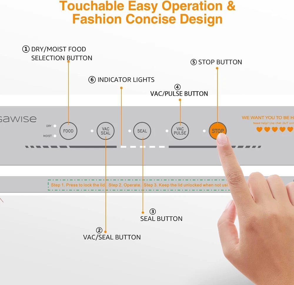 Mega Reliability : We Want you to be happy. 7/24 Live Chat Support. We treat you like family and want you to be happy! Mega Powerful and Practical : Save Your Energy: Just vacuum it up! 80kPa powerful suction and higher-quality heating wire guarantee to reach an optimal vacuum level and airtight seal within 10-20 seconds. MegaWise vacuum food sealer can help you keep the quality and extend the freshness of the food over 5x longer time, instead of letting the ice crystals of the cooked food filled in the refrigerator and end up in the trash. Mega Benefits : Save Your Money -Vacuum Them all, with Free 10 high-quality BPA-free vacuum bags and external vacuum system for you to manage all kinds of food saving in any containers which can be vacuumed. Mega Functions : Save Your Time- Get it done easy! We designed a built-in sliding cutter for you to easily get a smoother customized bag quickly without searching for the cutters, and also slim and compact design to make it easy to start with and easy to storage. Easy to use : Save Your Wisdom with just touch and done. One-touch operation and two specialized modes, you can get the food vacuumed in 10-20 seconds. The 12in sealing wire supports to seal 3-5 bags at one time. Choosing the Dry or Moist mode according to the food types, “Dry” mode for solid items and “Moist” mode for poached, simmered or steamed food, gives your food the most careful protects. Product Description Seal the Freshness, Savor the Savings with Megawise! Megawise Vacuum Sealer combines sleek, compact design with exceptional affordability, making it a perfect fit for any kitchen. Its user-friendly interface and versatile sealing options ensure effortless food preservation, all at a price that delivers incredible value. Handle food types; the “Dry” and the “Moist” modes securely seal juicy items without mess. Ideal for fruits, vegetables, and dairy, the vacuum seal slows oxidation, preserving freshness. Locks in flavor and prevents freezer burn for meats, poultry, and seafood. Helps save money by buying in bulk and preserving perishable items for longer periods. 1 Dual Sealing 2 Fresh Longer 3 Bulk Meats and Seafood 4 Money-Saving Problem-Solving Guide The video showcases the product in use. The video guides you through product setup. The video compares multiple products. The video shows the product being unpacked. How to ensure perfect vacuum and seal? Merchant Video Megawise Vacuum Sealer How to ensure a perfect vacuum and seal? Make sure the lid is closed accurately and the bag's opening is correctly placed in the vacuum chamber. The video showcases the product in use. The video guides you through product setup. The video compares multiple products. The video shows the product being unpacked. How to Lock and Unlock Merchant Video Megawise Vacuum Sealer How to lock and unlock the machine? To unlock the MegaWise Vacuum Sealer Machine, press both sides of the lid or the release buttons until you hear a click, indicating that the lid has been released, and then gently lift the top lid. To lock the machine, press down on the lid until you hear a click or feel it securely locked into place. The video showcases the product in use. The video guides you through product setup. The video compares multiple products. The video shows the product being unpacked. How to cut the bags Merchant Video Megawise Vacuum Sealer How to cut the bags? To cut the bags, simply pull out the desired length of the bag and lay it flat under the cutter. Ensure proper alignment for a clean cut. The video showcases the product in use. The video guides you through product setup. The video compares multiple products. The video shows the product being unpacked. Using the Moist or Wet Food Type button Merchant Video Megawise Vacuum Sealer Using the Moist or Wet Food Type button To vacuum and seal moist or wet products, remove any visible water and make sure the upper part of the bag is dry, especially where the heating element and silicone strip will clamp. The video showcases the product in use. The video guides you through product setup. The video compares multiple products. The video shows the product being unpacked. For optimal performance Merchant Video Megawise Vacuum Sealer Megawise vacuum sealer machine for optimal performance. If your Megawise vacuum sealer machine isn't vacuuming or sealing well, remove the sealing foam gasket, flip it, and place it back. Make sure it lies flat without any uneven sides or holes. Flipping the foam gasket helps restore the sealing efficiency. The video showcases the product in use. The video guides you through product setup. The video compares multiple products. The video shows the product being unpacked. Using the machine for the first time Merchant Video Megawise Vacuum Sealer When using the machine for the first time When using the Mega Wise Vacuum Sealer machine for the first time, ensure to attach the cord correctly and remove the plastic bar inside the vacuum chamber for a smooth vacuum and seal process. MEGAWISE VACUUM SEALER Add to Cart Add to Cart Add to Cart Add to Cart Add to Cart Customer Reviews 4.3 out of 5 stars 11,545 4.3 out of 5 stars 11,545 4.3 out of 5 stars 137 4.8 out of 5 stars 22 3.7 out of 5 stars 15 4.7 out of 5 stars 244 4.7 out of 5 stars 748 Price $31.99 $ 31 . 99 $24.64 $ 24 . 64 $24.97 $ 24 . 97 $6.64 $ 6 . 64 $7.59 $ 7 . 59 $13.04 $ 13 . 04 $12.99 $ 12 . 99 Affordability ✔ ✔ ✔ ✔ ✔ ✔ ✔ Manufacturer MEGAWISE MEGAWISE MEGAWISE MEGAWISE MEGAWISE MEGAWISE MEGAWISE Wattage 110 watts 110 watts 110 watts — — — — Product Dimensions 15.2"L x 4.1"W x 2.3"H 15.2"L x 4.1"W x 2.3"H 15.2"L x 4.1"W x 2.3"H — — — — Vacuum Sealer Accessories — — — Sealing Strip Sealing Foam Gasket Bags (8''x 21.6'') Bags (8''x 12''-110pcs) This package ensures to maximize your Vacuum Sealing Experience. (1) Vacuum Sealer Unit Main device designed for sealing and vacuuming bags to lock in freshness and extend food shelf life.