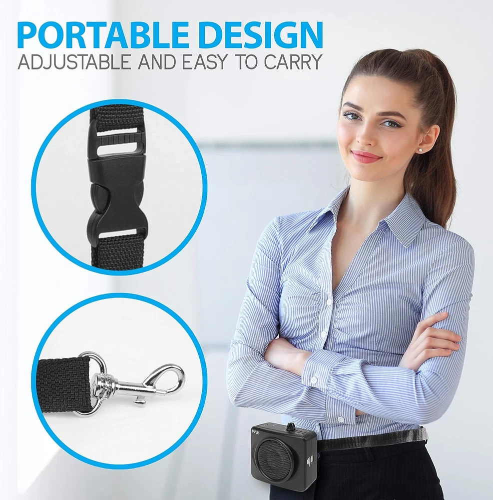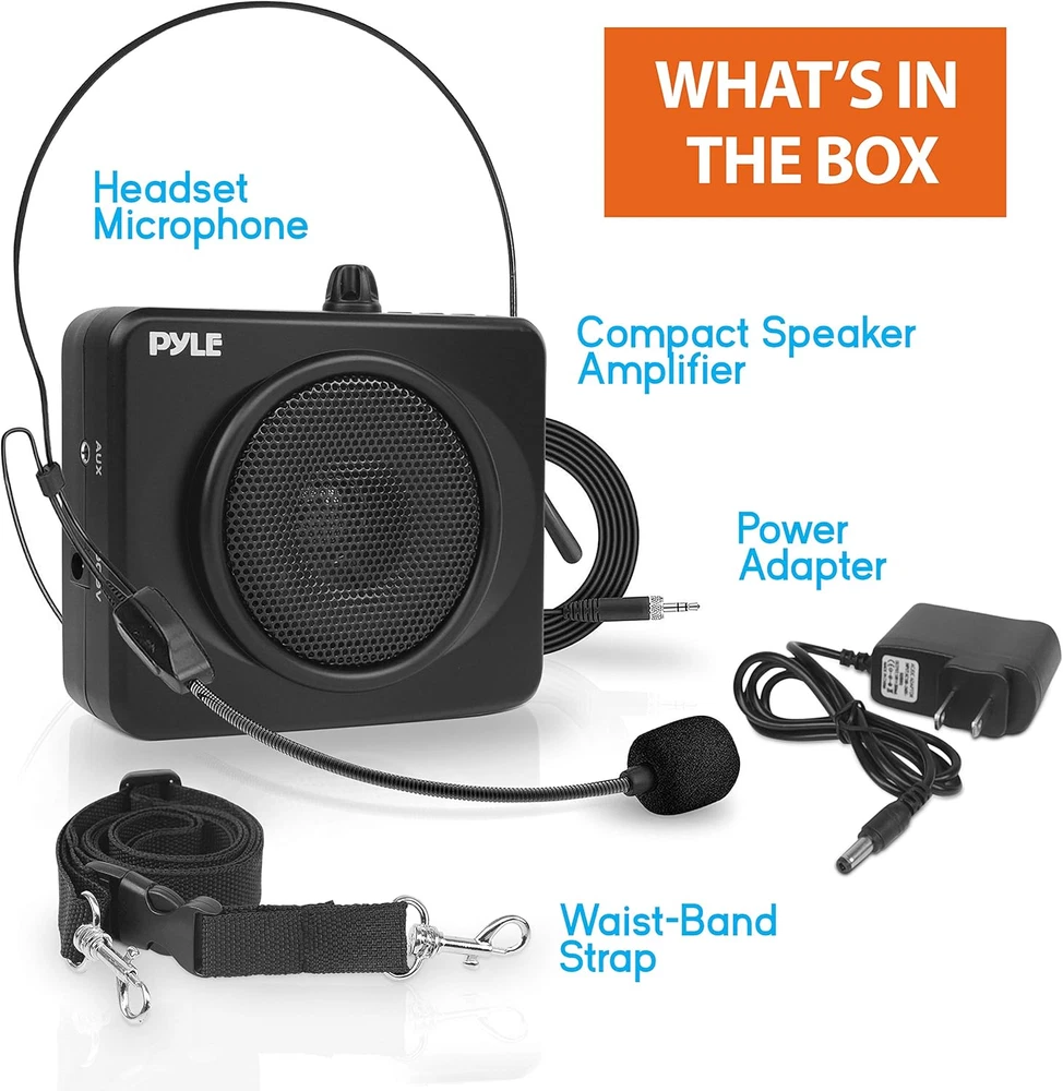 INCLUDES HEADSET MIC: Pyle introduces a compact, lightweight portable PA system with USB support and included a headset lavalier microphone. Perfect for guiding people through noisy, busy environments, or ensuring you’re heard in large groups or crowds RECHARGEABLE BATTERY: Save money by not having to buy batteries over and over again since the system is powered by a rechargeable battery. Just plug the power adapter into the speaker unit and your system will be ready to use again for up to 12 hours PORTABLE DESIGN: Carrying the system around with you is made easy when you wear it with the included adjustable belt strap. It comes with a headset lavalier microphone so your hands won’t get tired holding a microphone all-day USB SUPPORT: Play music and recordings over the speaker thanks to USB support: just load your files off your computer & onto a USB stick & press play. The unit features forward and backward track selector buttons as well as seek an option to skip parts AUX INPUT: The voice amplifier & microphone headset system supports iPods & other external devices w/ the AUX audio input jack, all you need is double-sided 3.5mm male stereo cable (not included). Comes w/ power adapter, waist-band strap & belt clip Surprisingly powerful and built with USB and iPod support. Comes with headset lavalier microphone. You can play recordings and music right off your computer thanks to USB support Play, select, pause, and seek through tracks off your USB stick. AUX input lets you connect an iPod or other audio device. Lightweight, Portable PA System with Included Headset Microphone The PWMA60UB is a compact, lightweight portable PA system with USB support and included headset lavalier microphone. Looking at its small size you’d be surprised at how loud and clear it is, making it perfect for guiding people through noisy, busy environments, or ensuring you’re heard in large groups or crowds. Comes in black, white, or silver. Play Music and Recordings with USB or iPod You can play music and recordings over the speaker thanks to USB support: just load your files off your computer and onto a USB stick and press play. Selecting between multiple files is easy: the unit features forward and backward track selector buttons, in addition to a seek option so you can quickly find the part of the track you want to play. The system also supports iPods and other external audio devices with the AUX audio input jack: all you need is a double-sided 3.5mm male stereo cable (not included). Easy to Use and Carry Carrying the system around with you is made easy when you wear it with the included adjustable belt strap. It also comes with a headset lavalier microphone so your hands won’t get tired holding a microphone all day. Best of all, the system is lightweight and compact, so you won’t even notice you’re wearing it. Built-in Rechargeable Lithium Batteries Last Up To 12 Hours You’ll even save money by not having to buy batteries over and over again since the system is powered by a rechargeable battery. Just plug the power adapter into the speaker unit and your system will be ready to use again for up to 12 hours.