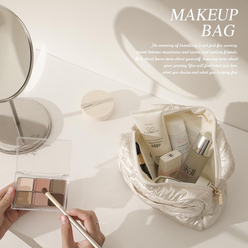 This makeup bag is a game-changer! The soft quilted material feels luxurious, and it fits all my essentials without bulk. The waterproof lining saved me from spills, and the multiple pockets keep everything organized—perfect for travel or daily use. The zippers glide smoothly, and the compact size makes it easy to toss in my purse. A must-have for anyone who loves staying neat on the go!