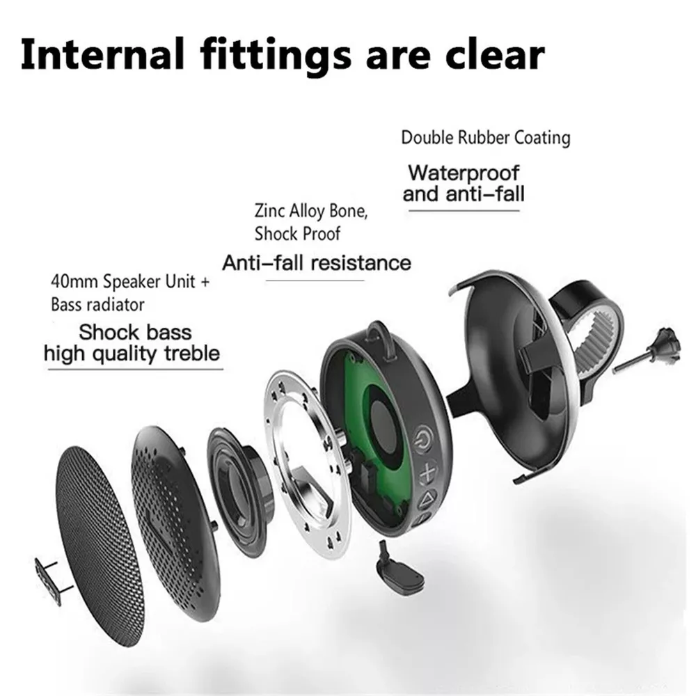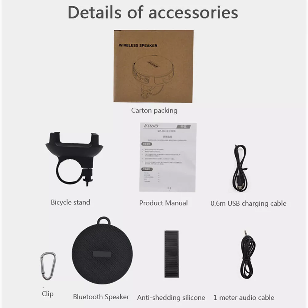 Cycling Bluetooth Speaker Subwoofer Bike Mount 3D Bass Stereo Waterproof Speaker Product Description MZ360 Outdoor Cycling Bicycle Waterproof Bluetooth Speaker Portable Bicycle Audio Feature: 1. The built-in microphone provides hands-free calling, freeing your hands to do other things, and the loud and clear sound allows you to enjoy music and be full of energy 2. This bicycle speaker adopts an adjustable bicycle stand, allowing cyclists to enjoy music on bumpy journeys without worrying about the speaker falling 3. This bicycle speaker has IPX7 waterproof rating, it can be waterproof, so it will not be affected even in bad weather, perfect for cycling, beach, bathroom and other indoor or outdoor activities. 4.5.0 bluetooth version Compared with other wireless speakers with bluetooth 4.2, this speaker provides you more stable and continuous connection, you can also play music by inserting TF card(Not include) 5. The bracket can be fixed on the front of the car, or the hook can be hung on the waist or on the backpack, which is convenient and convenient. Parameter: Colour: Black Frequency response range: 50Hz-20KHz Power supply mode: built-in lithium battery Playback format: MP3, WAV Support format: TF card(Not include) Output power: 5W Built-in battery capacity: 750mah battery Signal-to-noise ratio: ≥85db Expanded storage: 32GB (Not include) RMS: 5w Support Bluetooth 5.0/Audio/TF(Not include)/Hands-free calling Include: 1*audio 1*stand 1*manual 1*charging cable 1*hook