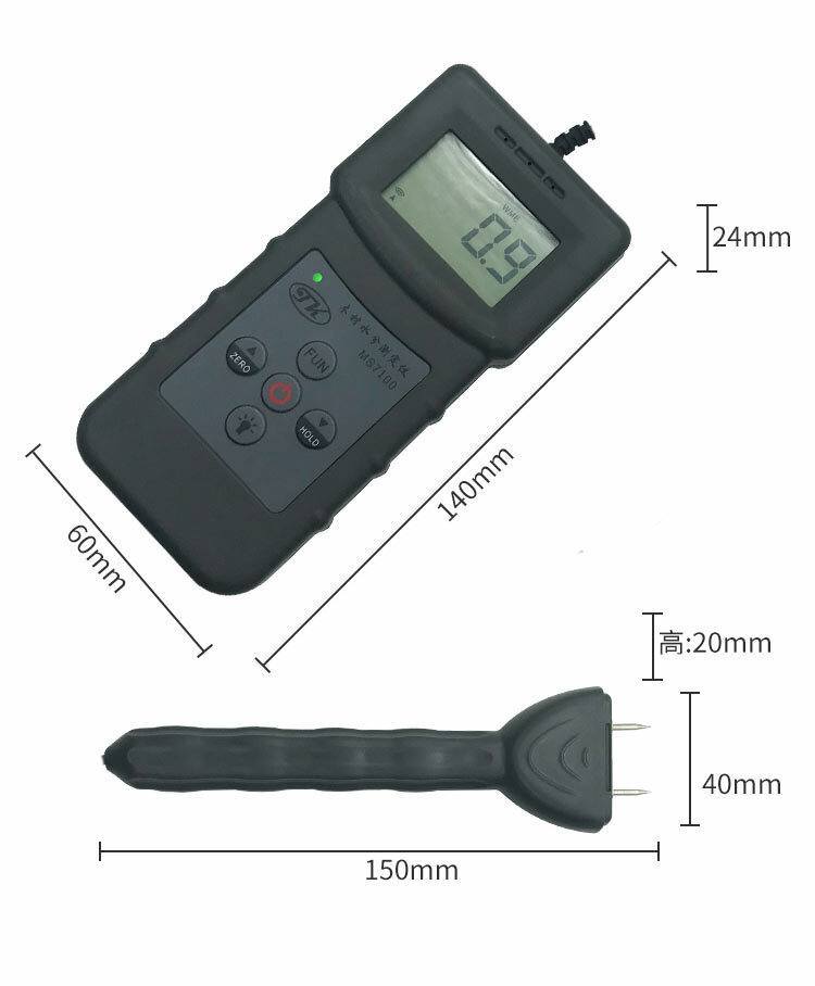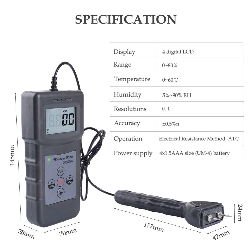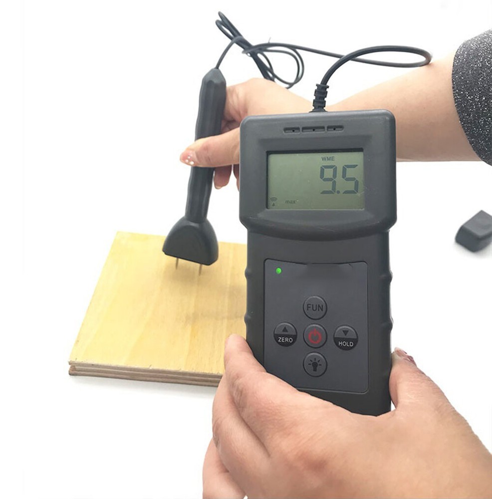 Portable Moisture Meter Analyzer Tester For Wood Furniture Flooring bamboo !!!Shipping Policy : Battery not included during the shipping!!! wood moisture meter: mainly used for measuring the water content of wood products, by the vast number of users has the following products used for measuring wood moisture content: wood, furniture, flooring, wooden doors, wooden pallets, wood flooring, composite flooring, bamboo flooring, wood sticks, wood, wood, plate, mahogany, wood products, packaging boxes, chopping board, plywood, wood powder, bamboo, wood, plywood, MDF, MDF, wood, wood, wood, wood, bamboo, wooden handle, etc. more than 150 kinds of domestic and international wood moisture content. The instrument adopts advanced integrated circuit the sensor technology and international advanced electronic components development, high measuring accuracy, stable performance, is the ideal choice for furniture and wood products industry to detect the moisture content of the product. Technical Specifications *Display mode: 4 bit backlit LCD display with LCD *Measuring range: 0~80% *Display accuracy: 0.1 *Measurement environment: Temperature: -10℃~60℃ Humidity: 5%~90% *Measuring principle: conductance method, temperature compensation *Accuracy: ±0.5% *Response time: 1 second * Power supply: 4x1.5V AAA (UM-4) battery (Battery not included in the package) *Volume: host: 140mm * 60MM * 24mm; handle: 150mm * 40MM * 20MM *Net weight: about 175 grams