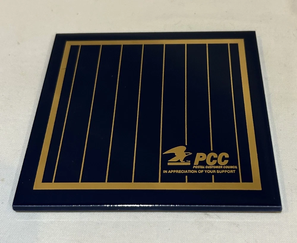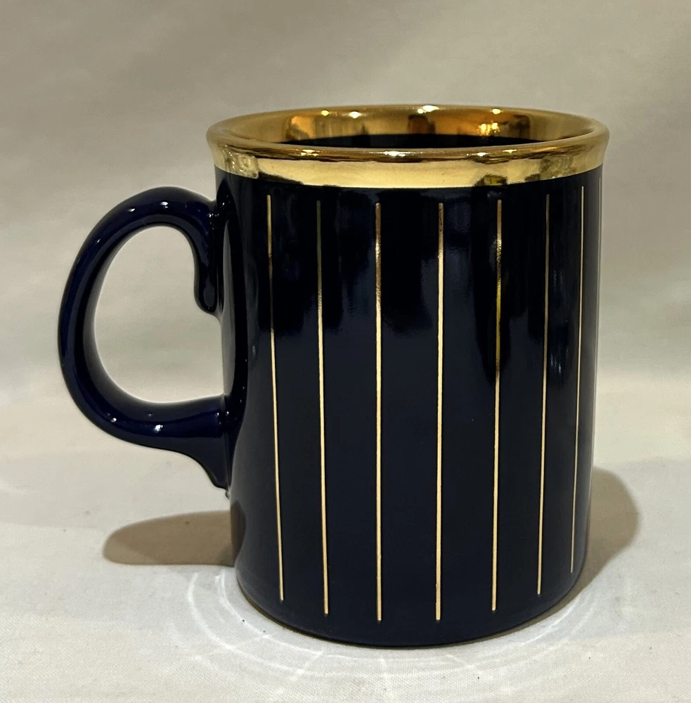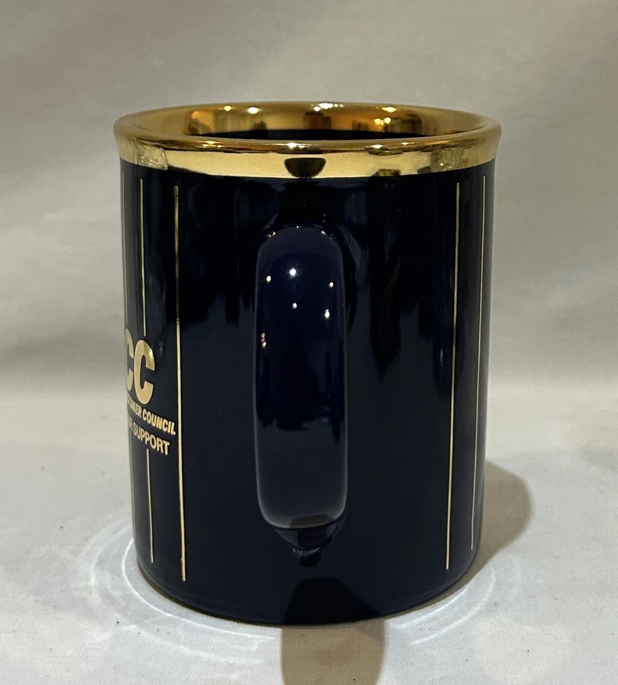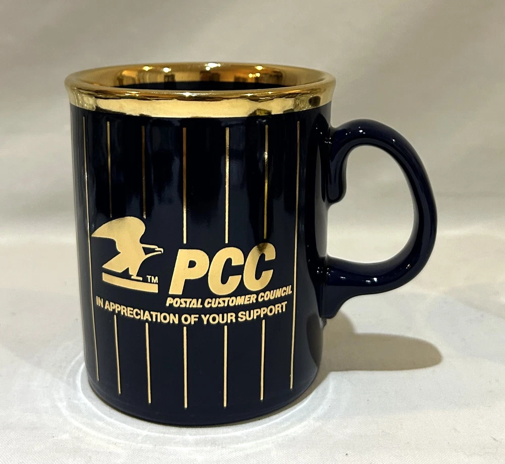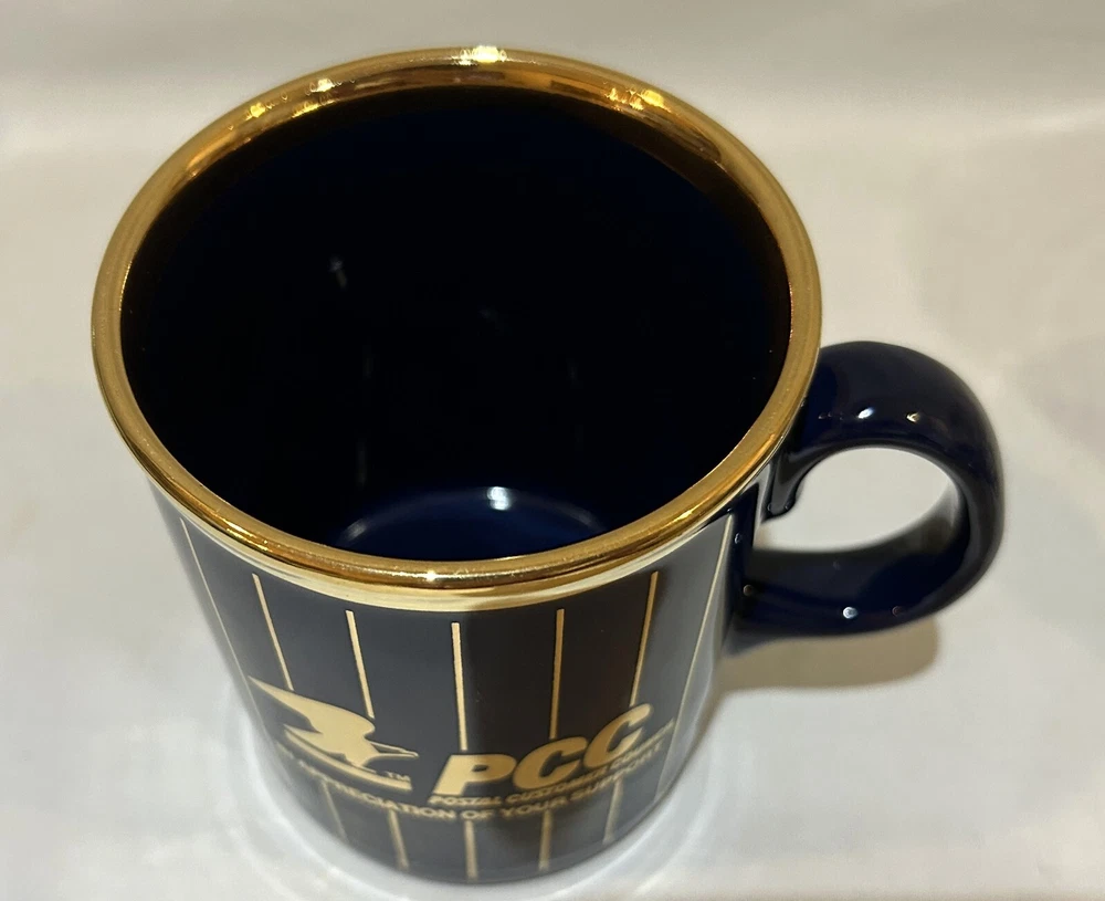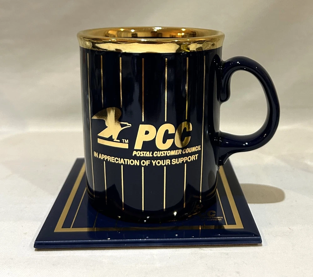 Postal Customer Council Ceramic Mug & Coaster Cobalt Blue and Gold England NEW New old stock There are reflections of glare in the pictures, but these are in perfect new condition and the gold pattern and trim are intact.