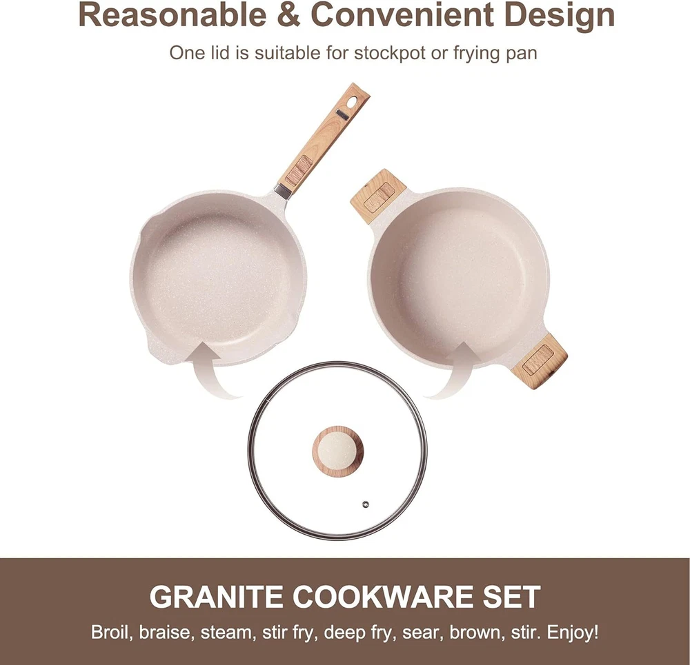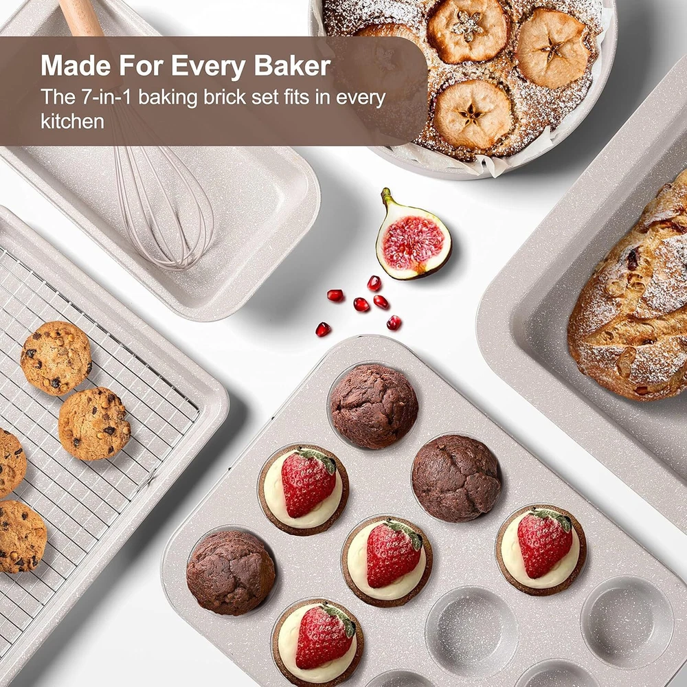Unique & Convenient Design: The lid can be used in the frying pan or the soup pot, when you cook, you can watch the whole cooking process and master the progress of the whole cooking. The heat-resistant and anti-slip Ergonomic knob and handle are nice to grip, easy to maneuver, safe and anti-scald. Superior Quality: Excellent thermal conduction is one of the benefits of Aluminum bakeware- provides for even heat distribution through the baking process. Oven is safe for up to 450°. Great for amateur and advanced bakers alike! Have the Bakery in your kitchen! (Note: Bakelite of pans is not suitable for ovens) No Bending or Popping Bakeware Set: Incredibly durable bakeware; high quality and ultra durable carbon steel is superior to others; resists warping, popping, and bending, even in high temperatures, while helping to maintain even heat distribution for picture perfect results every time, rust and scratch resistant and designed to last a ; do not use on broil or over an open flame. Safety Non-Stick Granite Coating: The nonstick pans and pots set are made with a stone-derived nonstick coating inside out to deliver unprecedented nonstick performance - everything just slides right off with less oil & cleans up easily. The natural mineral nonstick coating is ultra-durable while remaining 100% free of PFOA, PTFA, lead, and cadmium. Healthy Nonstick Pans and Pots Set: The 33 piece kitchen pots and pans include a 9.5” frying pan, an 11" frying pan, a 5QT stockpot with lid, an 8QT stockpot, a 3QT saucepan with lid, 11 Kitchen utensils set, a storage bucket, a boundform pan, a round pan, a cookie sheet, a roaster pan+cooking pack, loaf pan, muffin pan and six sponges. The stylish cookware sets meet all your kitchen and family needs. On Dec 15, 2024 at 18:42:58 PST, seller added the following information: