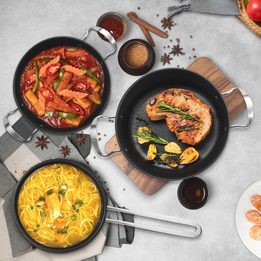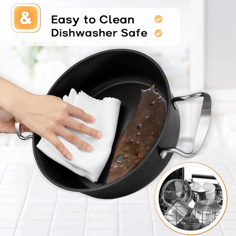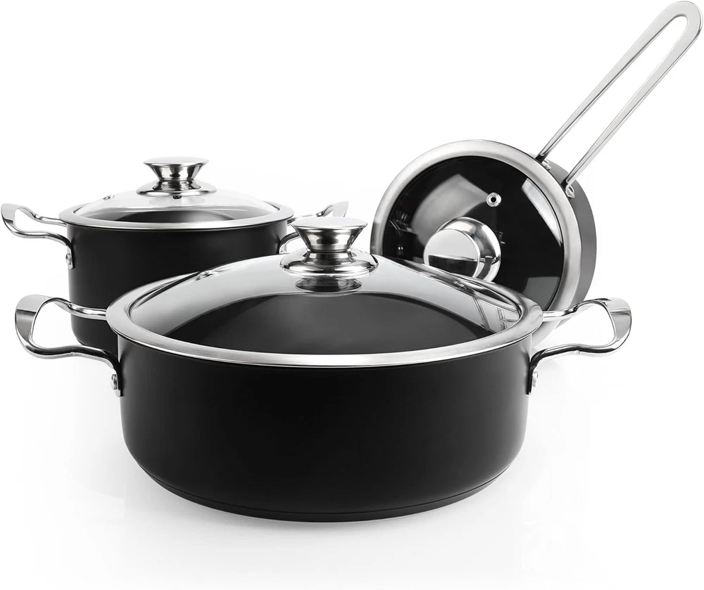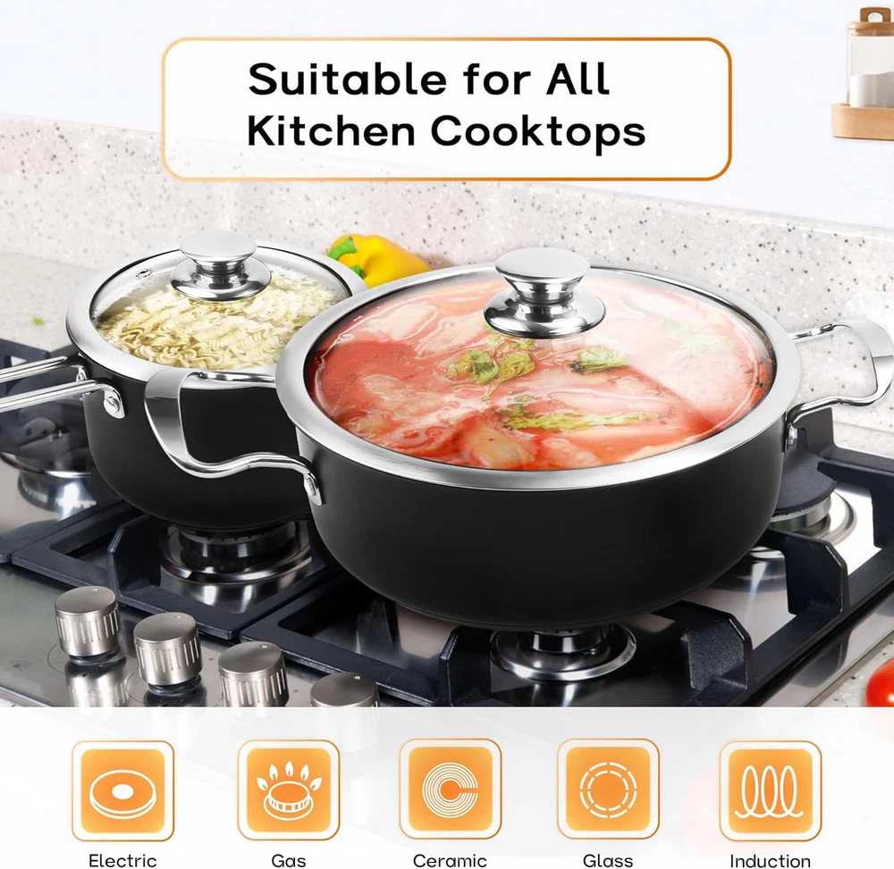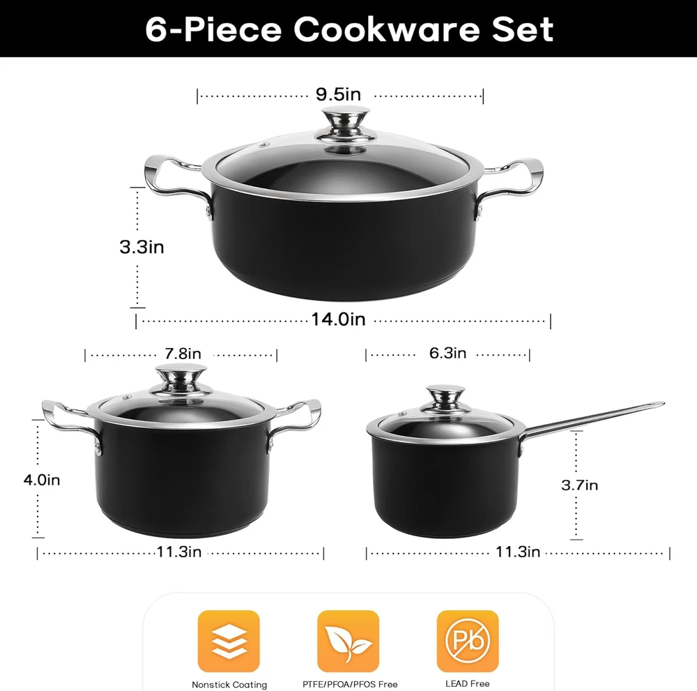 Menu Other Items Feedbacks About Us Contact Us Add To Favorites Pots and Pans Set Nonstick,6-Piece Kitchen Cookware Set with Glass Lids,Black Induction Pots and Pans Set with Stay-Cool Stainless Steel Handles,Saucepan Set Compatible with All Stovetops Black Pots and Pans Sets:This 6-Piece kitchen cookware sets include 3.5L/3.7QT hot pot with lid, 2.5L/2.6QT soup pot with lid and 1.9L/2QT saucepan with glass lid. The stainless steel pots and pans set includes a variety of cookware and glass lids, making it the perfect all-in-one cooking set for any kitchen. Stainless Steel Cookware Sets:The nonstick cookware set is made of Eco-friendly material and 100% free of PFOS,PFOA, which ensures that your daily cooking is always safer and healthier. Stainless steel is easy for cooking and cleaning, which is corrosion-resistant and rust proof, durable and sturdy. The pots and pans feature a 5-ply premium quality stainless steel base with a thick aluminum core for fast and even heat distribution, reducing your overall cooking time and saving energy for you. Ergonomic Heat Resistant Handles:The professional cooking utensils set features cool-touch ergonomic & heat-resistant handles ensuring comfortable & safe cooking. Offering a stylish modern cookware design adding an elegant touch to the pots and pans. Compatible with All Stovetops: Pans and pots set nonstick, they are compatible with most stoves and cooktops, including induction, gas, electric, halogen, ceramic, etc. Making it the perfect choice for any home chef. Whether you have a gas or electric stove, this set will work for you. Healthy and Dishwasher Safe: This cookware pots and pans set is easy to clean and dishwasher safe(For best use, the saucepan set is hand-wash recommended.) It is an ideal gift for family and friends. : Perfect customer care service, please feel free to if you have any questions, and we will give you a satisfied response within 24 hours. Product Description 6-Piece Pots and Pans Set The stainless steel nonstick cookware set is made of food grade material,100% free of PFOS, PFOA, which ensures that your daily cooking is always safer and healthier. Stainless steel body is easy for cooking and cleaning, which is corrosion-resistant and rust proof, durable and sturdy. The pots and pans feature a 5-ply premium quality stainless steel base with a thick aluminum core for fast and even heat distribution, reducing your overall cooking time and saving energy for you! Soup pot with Lid Saucepan with Lid Hot pot with Lid Nonstick Cookware Set The nonstick cookware set is easy for cooking and cleaning, which is corrosion-resistant and rust proof, durable and sturdy. Food Grade Stainless Steel Nonstick Pots and Pans Sets are made of food grade material and 100% free of PFOS,PFOA, which ensures that your daily cooking is always safer and healthier. Easy to Clean Stainless steel pots and pans set is safe and healthy, 100% free of toxic chemicals or coating. Easy to clean and dishwasher safe(For best use, the cookware set is handwash recommended.) Heat Evenly Base The pots and pans feature a 5-ply premium quality stainless steel base with a thick aluminum core for fast and even heat distribution, reducing your overall cooking time and saving energy for you. Heat Resistant Handles This professional cooking set features cool-touch ergonomic & heat-resistant handles ensuring comfortable & safe cooking. Pots and Pans with Glass Lid Glass lids are made of heat-resistant and shatter-resistant tempered glass. They are also transparent, so you can watch your meal cooking and monitor its progress. Also tempered glass lids with steam vents for added strength and safety. Item Specification Item model number 6-P Closure Material Glass Item Volume 7.9 Quarts Color Black Included Components Stainless Steel Bowl Material Stainless Steel Country of Origin China Is Dishwasher Safe Yes Item Weight 7.3 pounds Is Oven Safe Yes Handle Material Stainless Steel Size 6 Pieces Material Type Free PFOA Free, PTFE Free, PFAS Free, Lead Free and Cadmium Free Special Feature Gas Stovetop Compatible, Electric Stovetop Compatible, Induction Stovetop Compatible Package Dimensions 24.84 x 15.16 x 5.28 inches Compatibility Options induction Number of Pieces 6 Dimensions Shipping Returns Additional Info Product Dimensions: 15.16 inches x 24.84 inches x 5.28 inches. Weight: 7.3 lb Fast shipping is very important for us. Our standard shipping service is FREE. Your order will be shipped within 1-3 business days upon full payment received. Most items are delivered within 3-5 business days, however, please allow 3-10 business days. We are shipping only to USA. We only ship to the confirmed Paypal address. We reserve the right to cancel any order for any reason at any time. We are not responsible for undeliverable addresses. We offer a 30 day return policy from checkout winning date. Your satisfaction is guaranteed! If for any reason you are unhappy with your item, just return it within 30 days for a full refund, minus shipping cost. Please contact us prior to initiating a return so that we can issue you a refund authorization. Items defective upon receipt must be packaged in their retail packaging as if new and returned with a detailed description of the problem. Return shipping fees are not refundable. We reserve the right to decline any returns if the above guidelines are not followed. All of our items, unless otherwise stated, will only run on 120 volts. Please check to make sure your country complies with these specifications. If you have a problem or question regarding your transaction please contact us before leaving any type of feedback. We will work with you to resolve any problem you may have.