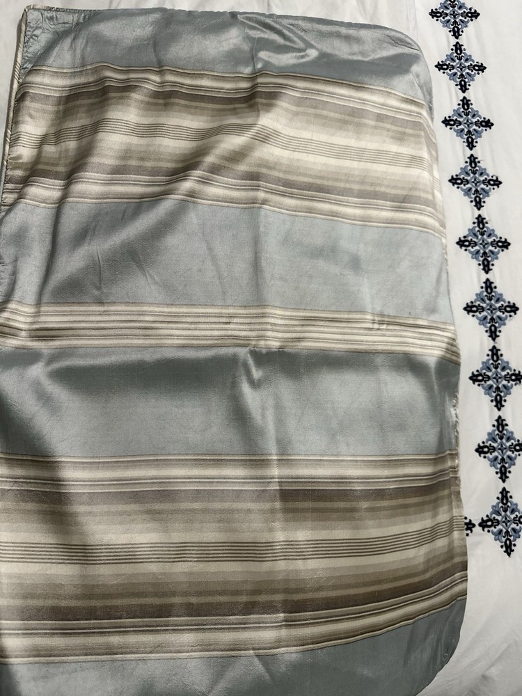 Light blue and multi color beige and tan stripes. Silk top and cotton backing. Great condition.