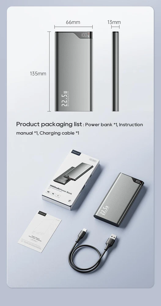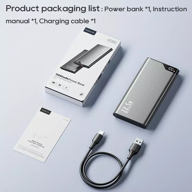 Free and fast shipping , shipping take up 1-7 Business Days 30 Day Return Accepted EASY PAYMENT via PayPal, Credit Card, PayPal Credit, Google Pay... Power Bank 10000mah Mobile Phone Plastic Medium Grey 2-usb 5v Backup 22.5w Product Name:KUULAA 22.5W Fast Charging Power Bank Capacity:10000mAh Size:13.5*6.6*1.3cm Product Weight:250g Colour:Grey Material: Aluminum alloy Output: USB:5V2.4A,9V2A,12V1.5A,10V2.25A Type-C: 5V3A,9V2.22A,12V1.67A Input:Type-C:5V3A,9V 2A,12V1.5A Product Accessories:Type-C Charging Cable Digital Display Quick Charge Power Bank ●Minimalist Security ●Ultra-thin Metal Shell ●10000mAh Large capacity ●Classic & Portable ●Supprt PD3.0 & QC3.0 ●LED Indicator SCP 22.5W Fast Charging Charge 50% for Huawei Mate40 Pro In 30 Mins PD 20W Fast Charging Charge 60% for iPhone 15 In 30 Mins Small Current Mode More suitable for low current devices Reliable Batteries Long Battery Life, Intelligent Temperature Control 3Hours Full Recharged Multiple Protection Carrying on Board Fly Around the World Wide Compatibility REVIEWS The product came very well packaged. I'm very happy. thank you for everything. Seller strongly recommended. This is great! I definitely recommend! Product looks amazing Delivery was fast. Excellent seller, great communication. I advise everyone to buy it!