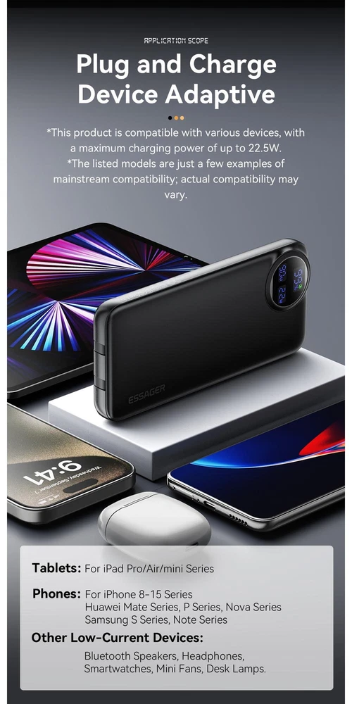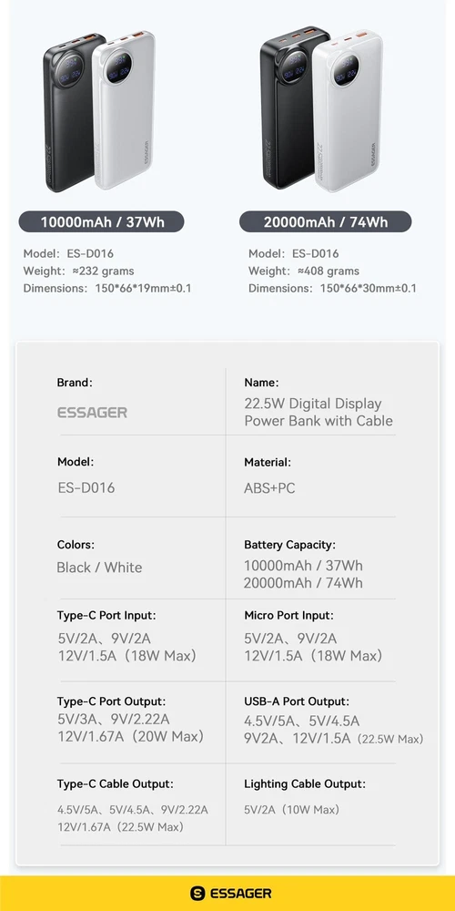 Free and fast shipping , shipping take up 1-7 Business Days 30 Day Return Accepted EASY PAYMENT via PayPal, Credit Card, PayPal Credit, Google Pay... Power Bank 20000mah Mobile Phone Plastic Medium Black 1-usb 5v Backup 22.5w Product Parameters: Name: 22.5W digital display with cable mobile power supply Model:ES-D016 Product Size: 149.5*67*17.5mm Product net weight: 190g Material: ABS+PC REVIEWS The product came very well packaged. I'm very happy. thank you for everything. Seller strongly recommended. This is great! I definitely recommend! Product looks amazing Delivery was fast. Excellent seller, great communication. I advise everyone to buy it!