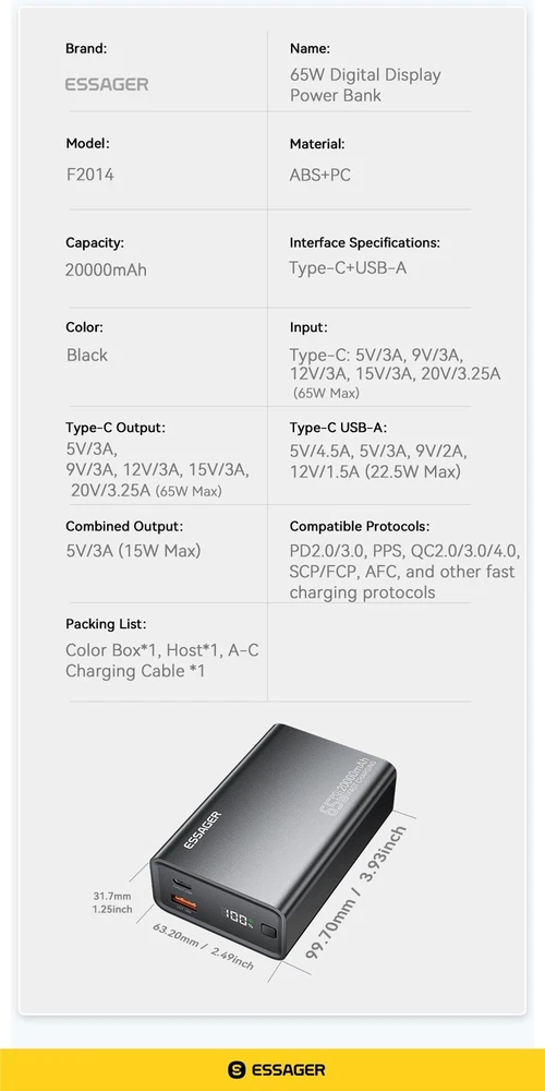 Free and fast shipping , shipping take up 1-7 Business Days 30 Day Return Accepted EASY PAYMENT via PayPal, Credit Card, PayPal Credit, Google Pay... Power Bank 20000mah Mobile Phone Plastic Mini Black 2-usb 5v Backup 65w Brand:Essager Function 1:QC PD 3.0 Fast Charge Power Bank / 20000mAh Powerbank Function 2:PD2.0 / PD3.0 / SCP / FCP / PPS / QC2.0 / QC3.0 / QC4.0 / AFC Power Bank 20000 mAh Feature 1:With Typec cable, 65w Fast Charging Feature 2:Fast Portable Charger / Power Bank 20000mAh, Battery Bank / Pover Bank Feature 3:Portable Battery / Portable Phone Charger / Mobile Phone Power Bank Feature 4:USB Poverbank / Quick Charge 3.0 Power Pack / Batery Charger Feature 5:Fast Charge Power Bank / External Battery Charger / battery pack Feature 6:Essager Quick Charge With USB Type C Cable 20000mAh Power Bank REVIEWS The product came very well packaged. I'm very happy. thank you for everything. Seller strongly recommended. This is great! I definitely recommend! Product looks amazing Delivery was fast. Excellent seller, great communication. I advise everyone to buy it!