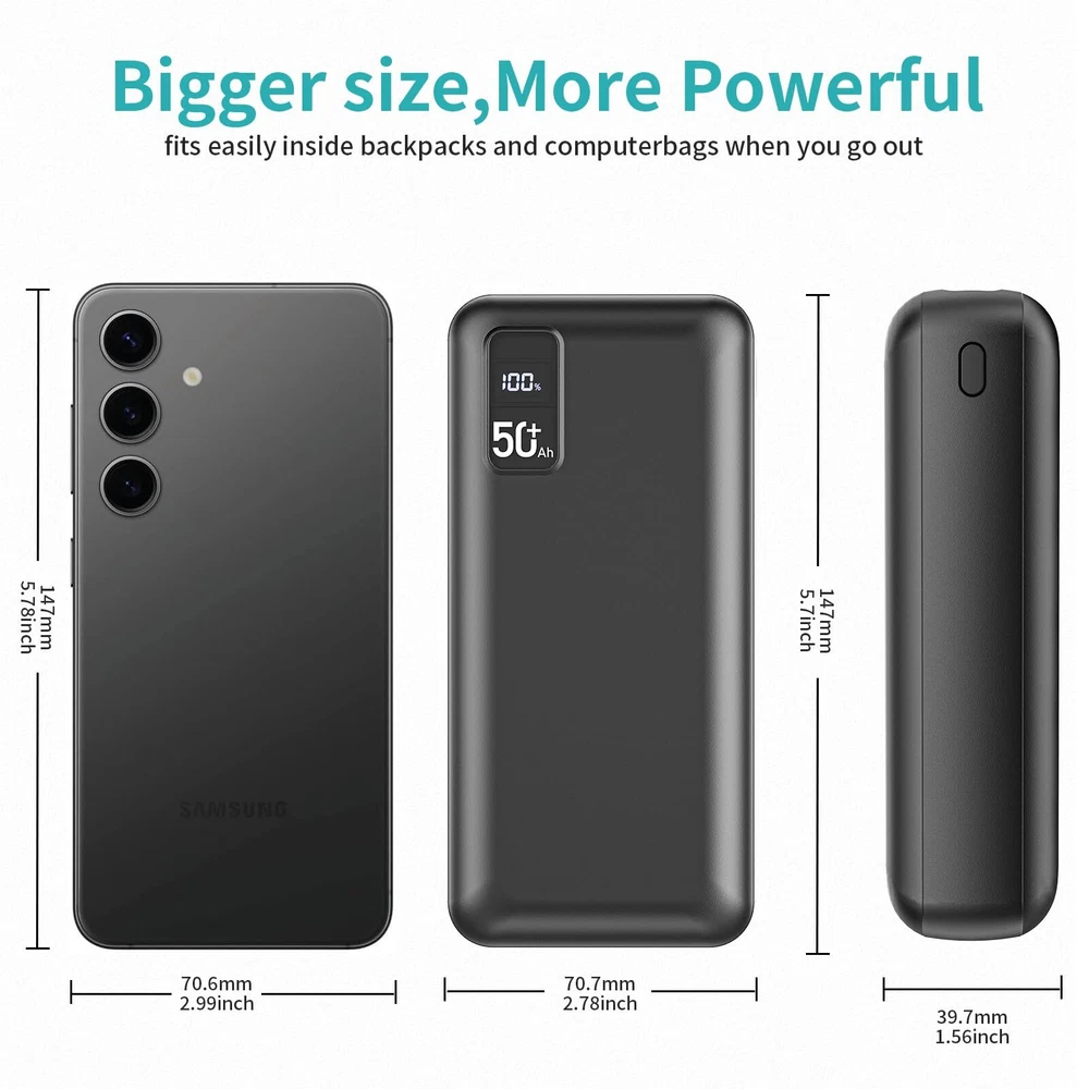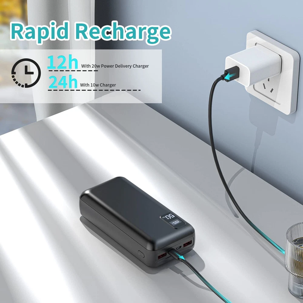 【Colossal Cell Capacity】The 50000mAh power bank provides 10 charges for iPhone11, 10 times for Samsung S10. Depending on battery size, most smartphones will get over 9 full charges. Suitable for camping, hiking, vacation, travel and more. NOTE: The 50000mAh POWER BANK ARE NOT ALLOWED ON AIRPLANE!!) 【High-Speed Charging】(portable charger) Equiped with 22.5W USB-C port to charge iphone X up to 60% in half hours. In the meanwhile, built in quality batteries and comprehensive multiprotect safety system, include overcharge protection, short circuit protection, temperature control, and more, ensure complete protection for you and your devices. 【Simultaneous Charging】With 1 USB-C port(Support IN&OUT), 2 USB ports, you can now charge up to 3 devices at once without sacrificing power; Our battery pack compatible with your smart phone, tablet computers, mini speakers, bluetooth headsets, cameras, handheld game consoles and other USB electronic devices. 【Thoughtful Design】Smart LED digital display, accurately keep track of remaining juice, allowing you to easily operate your power. 【What You Get】50000mah Power Bank, USB to USB-C Cable, User Manual, Our worry-free 24-month warranty, and friendly customer service.