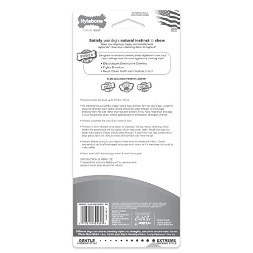 Power Chew Classic Bone Chew Toy for Dogs, Durable Dog Toys for Aggressive Chewers, Chicken Flavor, Large/Giant - Up to 50 lbs. (2 Count) MADE OF DURABLE NYLON - Long-lasting dog bones for aggressive chewers challenge extreme chewers and discourage destructive chewing FUN AND OCCUPYING - Chew toys keep dogs busy while satisfying their natural urge to chew PROMOTES DOG DENTAL HEALTH - These dog toys help prevent plaque and tartar buildup as furry friends chew MADE IN THE USA - Each durable dog chew is proudly made in the United States SAVORY BACON AND CHICKEN FLAVORS - Each chew toy features an irresistible taste throughout! FOR LARGE DOGS - Size Giant chew toys intended for dogs up to 50 pounds CHEW TOY DIMENSIONS - Out of package measures 7.75" long x 1.75" wide x 1" high TRUSTED CHEW TOYS WITH HEART & PURPOSE - Every chew toy’s unique shape, individual texture, and gotta-have-it flavor is created with purpose and love to give your dog what they need, when they need it! ABOUT POWER CHEW TOYS Made from our toughest nylon material, Power Chew toys challenge even the most extreme chewing styles! These durable dog chew toys for aggressive chewers come in many different shapes and enticing flavors to discourage destructive chewing, help clean teeth, and simply keep dogs happy! DOUBLE THE FLAVOR, DOUBLE THE CHEWING This twin pack features 2 long-lasting Power Chew toys: 1 in irresistible bacon flavor and the other in savory chicken flavor. Designed in a classic bone shape dogs love, these USA-made dog chew toys are sure to satisfy your best friend’s natural instinct to chew. GUARANTEED YOUR DOG WILL LOVE IT Before we introduce new dog products to furry friends and pet parents everywhere, we make sure our very own dogs love them first! If you’re not happy with your chew toy for any reason, simply return it to us with the sales receipt for your money back. Or, reach out to our Consumer Care team so we can help make it right (and talk about how much we also love our dogs). MEET – THE CHEWING EXPERTS We’ve been making the very best chewing solutions since 1955, so we know a thing or two about CHEW! Fast-forward 60+ years and pet parents continue to trust our family-founded company for high-quality chew toys, tasty treats, fun play toys, and easy-to-use dental products. To put it simply: Chews Best. Shipping We offer FREE shipping on all orders! We ship within Three business days of payment, usually sooner. We use a selection of shipping services such as UPS, FedEx, USPS etc. We only ship to the lower 48 states, no APO/FPO addresses or PO Boxes allowed. Local pickups and combined shipping options are not provided at this time. Return You can return a product for up to 30 days from the date you purchased it. Any product you return must be in the same condition you received it and in the original packaging. Please keep the receipt. Payment We accept payment by any of the following methods: PayPal Please pay as soon as possible after winning an auction, as that will allow us to post your item to you sooner! Feedback Customer satisfaction is very important to us. If you have any problem with your order, please contact us and we will do our best to make you satisfied. Contact Us If you have any queries, please contact us via ebay. We usually respond within 24 hours on weekdays. Please visit our eBay store to check out other items for sale! Thank you for shopping at our store.
