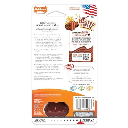 Power Chew Classic Bone Chew Toy for Dogs, Durable Dog Toys for Aggressive Chewers, Basted Blast Bacon & Steak Flavor, Medium/Wolf (1 Count) 2 LAYERS OF INDULGENT FLAVOR - As your dog chews through the bacon basted flavor on the outside, they'll discover the steak flavor on the inside! TASTE THE BASTE - We innovated an exclusive basting technique that adds a second flavor on top of an already delicious dog chew toy CHALLENGES YOUR POWER CHEWER - These dog toys for aggressive chewers are made from our toughest material DISCOURAGES DESTRUCTIVE CHEWING - Durable dog toy encourages healthy chewing habits BACON & STEAK FLAVORS - Basted Blast chew toys feature 2 delicious flavors in 1 long-lasting dog chew toy MADE IN THE USA - Dog chew toys are proudly made in the United States FOR MEDIUM DOGS - Size Wolf chew toy is intended for dogs up to 35 pounds TRUSTED CHEW TOYS WITH HEART & PURPOSE - Every chew toy’s unique shape, individual texture, and gotta-have-it flavor is created with purpose and love to give your dog what they need, when they need it! COME FOR THE BACON...STAY FOR THE STEAK Basted Blast chew toys will surprise your dog with 2 indulgent flavors in 1 long-lasting chew toy! innovated an exclusive basting technique that adds yet another flavor on top of an already delicious chew toy. As your dog chews, the lighter color inside will be revealed. This means they discovered the delicious steak flavor and can keep chewing for ongoing satisfaction! It's time to taste the baste. DURABLE POWER CHEW DOG BONE We start with the classic bone shape dogs love and add our mess-free basting to make it even more enticing! Made of tough nylon, these dual-flavored dog bones for aggressive chewers keep dogs busy and are proudly made in the USA. Plus, our veterinarian-recommended chew toys help reduce plaque and tartar as furry friends chew! CHEWS BEST What your dog chews matters! With destructive behavior among the leading reasons dogs are returned to shelters, we know healthy habits can make a life-changing difference. For 70 years, our family-founded brand continues to safely satisfy dogs’ chewing instincts and help them stay in loving forever homes! GUARANTEED YOUR DOG WILL LOVE IT Before we introduce new dog products to furry friends and pet parents everywhere, we make sure our very own dogs love them first! If you’re not happy with your chew toy for any reason, simply return it to us with the sales receipt for your money back. Or, reach out to our Consumer Care team so we can help make it right (and talk about how much we also love our dogs). Shipping We offer FREE shipping on all orders! We ship within Three business days of payment, usually sooner. We use a selection of shipping services such as UPS, FedEx, USPS etc. We only ship to the lower 48 states, no APO/FPO addresses or PO Boxes allowed. Local pickups and combined shipping options are not provided at this time. Return You can return a product for up to 30 days from the date you purchased it. Any product you return must be in the same condition you received it and in the original packaging. Please keep the receipt. Payment We accept payment by any of the following methods: PayPal Please pay as soon as possible after winning an auction, as that will allow us to post your item to you sooner! Feedback Customer satisfaction is very important to us. If you have any problem with your order, please contact us and we will do our best to make you satisfied. Contact Us If you have any queries, please contact us via ebay. We usually respond within 24 hours on weekdays. Please visit our eBay store to check out other items for sale! Thank you for shopping at our store.
