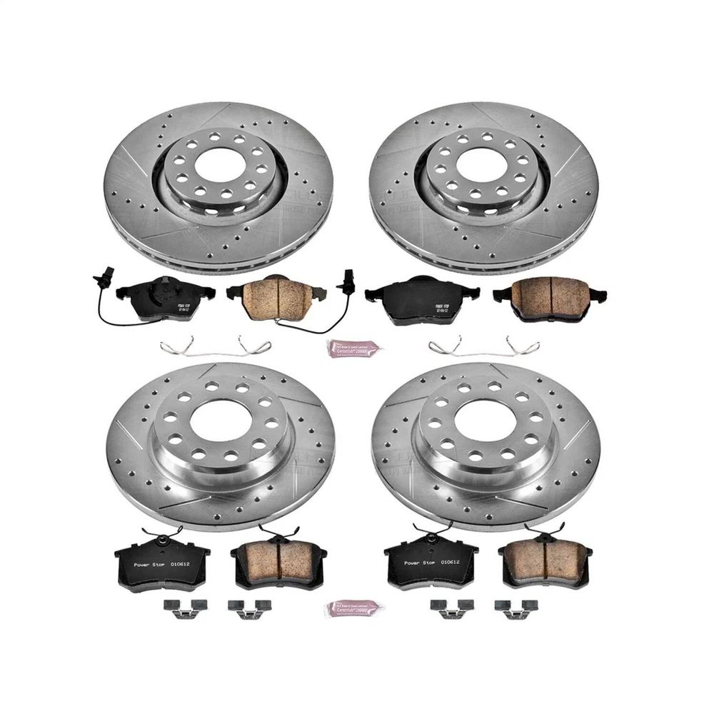 High Performance Brake Upgrade KitCross-Drilled and Slotted RotorsZ23 Evolution Sport High Carbon Ceramic Brake PadsComplete Front & Rear Kit Vehicle FitmentFor more detailed fitment information, Click Here!Front and Rear: Audi A4 2005-2002; A4 Quattro 2006-2002Disc Brake Pad and Rotor KitEngineered to improve the braking performance of the vehicle you use everyday (For towing, hauling, racing, or performance vehicles see our other brake kit solutions)Power Stop engineered carbon-fiber ceramic compound significantly enhances braking performance versus traditional ceramic brake padsLow dust braking validated through on-vehicle 3rd party tests in Power Stop K2777 High Performance Brake Upgrade Kit High Performance Brake Upgrade Kit Cross-Drilled and Slotted Rotors Z23 Evolution Sport High Carbon Ceramic Brake Pads Complete Front & Rear Kit Vehicle Fitment For more detailed fitment information, Click Here! Front and Rear: Audi A4 2005-2002; A4 Quattro 2006-2002 Disc Brake Pad and Rotor Kit Engineered to improve the braking performance of the vehicle you use everyday (For towing, hauling, racing, or performance vehicles see our other brake kit solutions) Power Stop engineered carbon-fiber ceramic compound significantly enhances braking performance versus traditional ceramic brake pads Low dust braking validated through on-vehicle 3rd party tests in Los Angeles, showing on average 30 less dust versus OE Dual layer high temp rubberized shims insulate noise for virtually silent braking Drilled & Slotted performance rotors for maximum cooling. Rotors (except for hub assemblies) are zinc plated for maximum protection against rust. Includes stainless steel installation hardware, electronic pad wear sensors in front pads, and high temperature ceramic brake lubricant Bolt on upgrade for stock brakes, no modifications necessary Brake rotor, pad & hardware engineered to work together to increase stopping power, improve durability & eliminate dust From the iconic mail order catalog to a fully-stocked digital commerce experience, we have built a preferred destination for every gear-head, professional racer, weekend warrior and restoration nut who wants to take their vehicle to the next level. Around here, we don't just sell parts - we rely on them when driving our own cars around racetracks, dirt trails, and interstates across the country. Parts may be our business - but grease, fuel, exhaust, power, and speed are what we live for. Today, more than 350 people are employed by JEGS and the business draws in hundreds of thousands of customers each year. Yet, we maintain the culture stared by Jeg Coughlin from the very beginning: a family-run performance shop that preserves a trusted relationship with each and every customer. From the iconic mail order catalog to a fully-stocked digital commerce experience, we have built a preferred destination for every gear-head, professional racer, weekend warrior and restoration nut who wants to take their vehicle to the next level. Around here, we don't just sell parts - we rely on them when driving our own cars around racetracks, dirt trails, and interstates across the country. Parts may be our business - but grease, fuel, exhaust, power, and speed are what we live for. Today, more than 350 people are employed by JEGS and the business draws in hundreds of thousands of customers each year. Yet, we maintain the culture stared by Jeg Coughlin from the very beginning: a family-run performance shop that preserves a trusted relationship with each and every customer. From the iconic mail order catalog to a fully-stocked digital commerce experience, we have built a preferred destination for every gear-head, professional racer, weekend warrior and restoration nut who wants to take their vehicle to the next level. Around here, we don't just sell parts - we rely on them when driving our own cars around racetracks, dirt trails, and interstates across the country. Parts may be our business - but grease, fuel, exhaust, power, and speed are what we live for. Today, more than 350 people are employed by JEGS and the business draws in hundreds of thousands of customers each year. Yet, we maintain the culture stared by Jeg Coughlin from the very beginning: a family-run performance shop that preserves a trusted relationship with each and every customer. From the iconic mail order catalog to a fully-stocked digital commerce experience, we have built a preferred destination for every gear-head, professional racer, weekend warrior and restoration nut who wants to take their vehicle to the next level. Around here, we don't just sell parts - we rely on them when driving our own cars around racetracks, dirt trails, and interstates across the country. Parts may be our business - but grease, fuel, exhaust, power, and speed are what we live for. Today, more than 350 people are employed by JEGS and the business draws in hundreds of thousands of customers each year. Yet, we maintain the culture stared by Jeg Coughlin from the very beginning: a family-run performance shop that preserves a trusted relationship with each and every customer. From the iconic mail order catalog to a fully-stocked digital commerce experience, we have built a preferred destination for every gear-head, professional racer, weekend warrior and restoration nut who wants to take their vehicle to the next level. Around here, we don't just sell parts - we rely on them when driving our own cars around racetracks, dirt trails, and interstates across the country. Parts may be our business - but grease, fuel, exhaust, power, and speed are what we live for. Today, more than 350 people are employed by JEGS and the business draws in hundreds of thousands of customers each year. Yet, we maintain the culture stared by Jeg Coughlin from the very beginning: a family-run performance shop that preserves a trusted relationship with each and every customer. From the iconic mail order catalog to a fully-stocked digital commerce experience, we ha