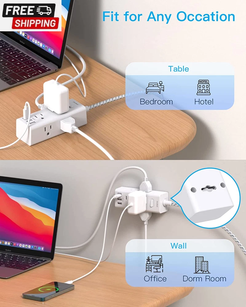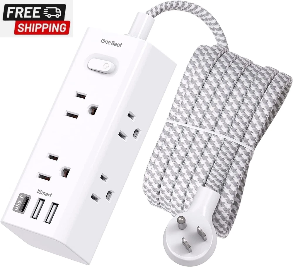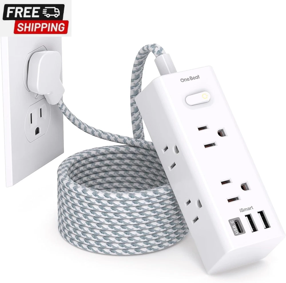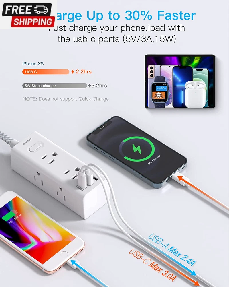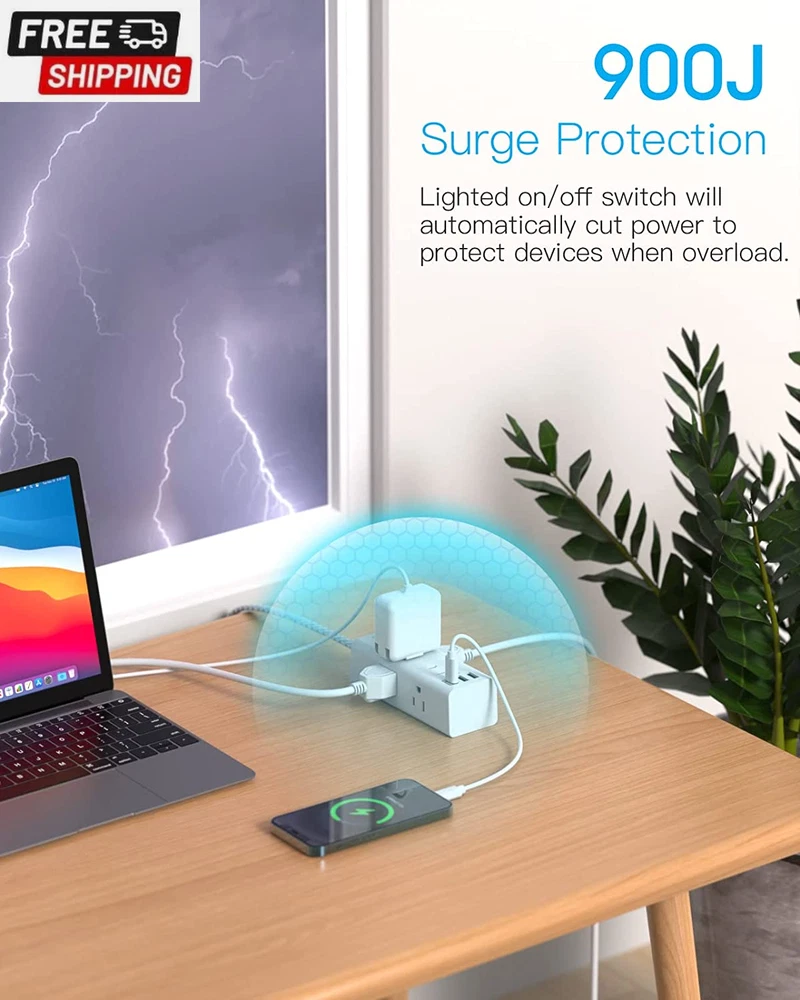 Fast Shipping On All Items 30 Days Money Guarantee Customer Support Excellent Service 100% Satisfaction Satisfaction Guaranteed Power Strip Surge Protector - 6 Widely Outlets with 3 USB Ports (1 USB C), 3-Side Outlet Extender Strip, 5 Ft Extension Cord Flat Plug, Wall Mount Small Power Strip for Travel Home Office College Dorm Specification Item model number OB6W3C Style 0.67“ Flat Plug Color Grey Product Dimensions 5 x 1.9 x 0.04 inches Country of Origin China Item Weight 11.8 ounces Total Power Outlets 9 Voltage 125 Volts Special Feature USB C Slot, On And Off Switch, Surge Protection, Mountable, Usb Slot Size 5FT 1.9 inches x 5.0 inches x 0.04 inches. Weight: 11.8 oz Item Description 【9-IN-1 Desktop Power Strip with USB C Fast Charge】— With 6 AC outlets, 2 USB ports and 1 USB C power strip, power up 9 devices simultaneously. USB C charging port features 3A Max, USB A charging port features 2.4A Max, With smart charging technology, it can auto-detect your connected devices and can reach faster-charging efficiency, which would charge your devices WITHOUT a variety of converters. 【3 Side Space Saving Design & Widely Space Outlets】— 3-side design and each AC outlets with 1.6 inches space in between, larger than standard 1.5-inch socket, fit big adapters without blocking each other. The compact size (5.0*1.9*1.8 IN) takes up less space on your desk or luggege, essential for the travel, home, office, and college dorm. 【Wall Mountable Extension Cord with Flat Plug】— The low-profile flat plug fits easily in tight spaces; and the right angle flat plug design prevents bottom plug blocking; the 5ft upgraded power cord is very thick and has better current carrying capacity (13A); the two mounting holes on back allows this power strip to be securely installed in various applications. 【Overload Surge Protection 】 — Features 900 Joules surge protector outlets. Lighted on/off switch with integrated circuit breaker for overload protection of all outlets, It will automatically cut power to protect connected devices when voltage surge is overwhelming. (The "Surge Protected” indicator light on to show your devices are protected). 【Multi Safety Protection】— This travel power strip certified by ROHs, FC, ETL, protected against over-voltage, over-current, over-charge, short-circuiting, over-heating. Fire-resistance PC shell with flame retardant at 1382℉ makes it more durable and longer lifetime. Product Description 9-IN-1 USB C Power Strip for Home, Office, Travel - 6 AC outlets and 3 USB charging ports ( 1 USB C ) provide power and charging for up to 9 devices from a single wall charging unit. - 3 Side Compact Design , take less space and charging more devices without blocking. - 5 Ft heavy duty extension cord with low-profile flat plug, great for stashing under or behind furniture. - 2 keyholes on the back, easily mount this flat extension cord onto the wall. Why choose us? In order to build a brand that is worthy of everyone's trust, make it famous for its excellent products. We carefully investigate the needs of consumers and strive to make our product better match customers' needs. We collect many customer needs and user feedbacks to improve our multiple outlet plug extender.You can find many user-friendly designs on our products. Wall Mountable Power Strip 6 Outlets Power Strip with 3 USB Charging Ports This power strip can support 9 devices simultaneously. 3 side space-saving design and compact size, ideal for small and tight place, great for home, office and travel use. It also with 2 holes on back, easy to mount it everywhere. Most devices and home appliances can be connected. Compatible with 100~240V worldwide voltage, meaning you could use it while traveling overseas together with a travel plug. However, it's NOT a voltage converter and your device needs to support 100-240V as well. 3 Side Space-saving & 1.6 Inch Widely AC Outlets 6 AC Outlet + 2 USB-A + 1 USB-C Ports 5 Ft Braided Upgrated Power Cord Multi Safety Certificate & 900J Surge Protection 45° Right Angle Low Profile Flat Plug Specification Power Rating 125V 60HZ 15A Maximum Power 1875W MAX Surge Protector Rating 900 Joules Length of Cable 5 Ft/1.5m USB C OUTPUT 5V/3A MAX USB A OUTPUT 5V/2.4A MAX USB OUTPUT 5V/3.1A TOTAL Safety Protection ETL List, FCC, RoHs 3 Side Non-blocking Design The unique 3 sided space saving design and 6 widely spaced ac outlets are separated enough to fit big plugs without blocking each other, easily plug in your PC, TV, more. USB-C High Speed Charging USB Total Output 3.1A, Built-in SMART IC with Super change technology intelligently detects your device to deliver its fastest possible charge speed up to 2.4A. USB-C port can up to 5V/3A. The USB-A charging is NOT Fast Charge QC 3.0, It can meet most USB devices charging needs. Overload Protection Features 900-Joule surge protection, overload protection, and much more to keep you and your devices safe. Multiple safety protection can prevent your electric devices from over-current/over-charge/short circuit/over-heated. Fireproof Material Fire-resistance PC shell with flame retardance at 1382℉ makes it more durable and longer lifetime. Attach Anywhere Designed with a right angled slimmer flat plug than other power strips, perfect for hard-to-reach outlets tucked away behind your bed or sofa. Upgraded Braided Extension Cord 15A heavy duty cord 5 ft to provide up to 1875W, compatible with higher power of most devices. The braided design makes it tangle-free and more flexible, elegant, durable and hard-wearing. About us We offer the best prices around on high quality products. Our E-store includes media such as books, movies, music and games while offering electronics, toys, sporting apparel, clothing, tools, general home, garden items and more. Shipping We are always working hard to ensure your package arrives as soon as possible. Please understand that some factors like weather, high postal traffic, and the performance of shipp
