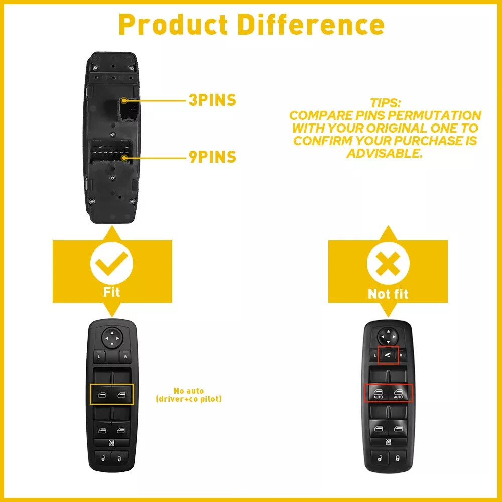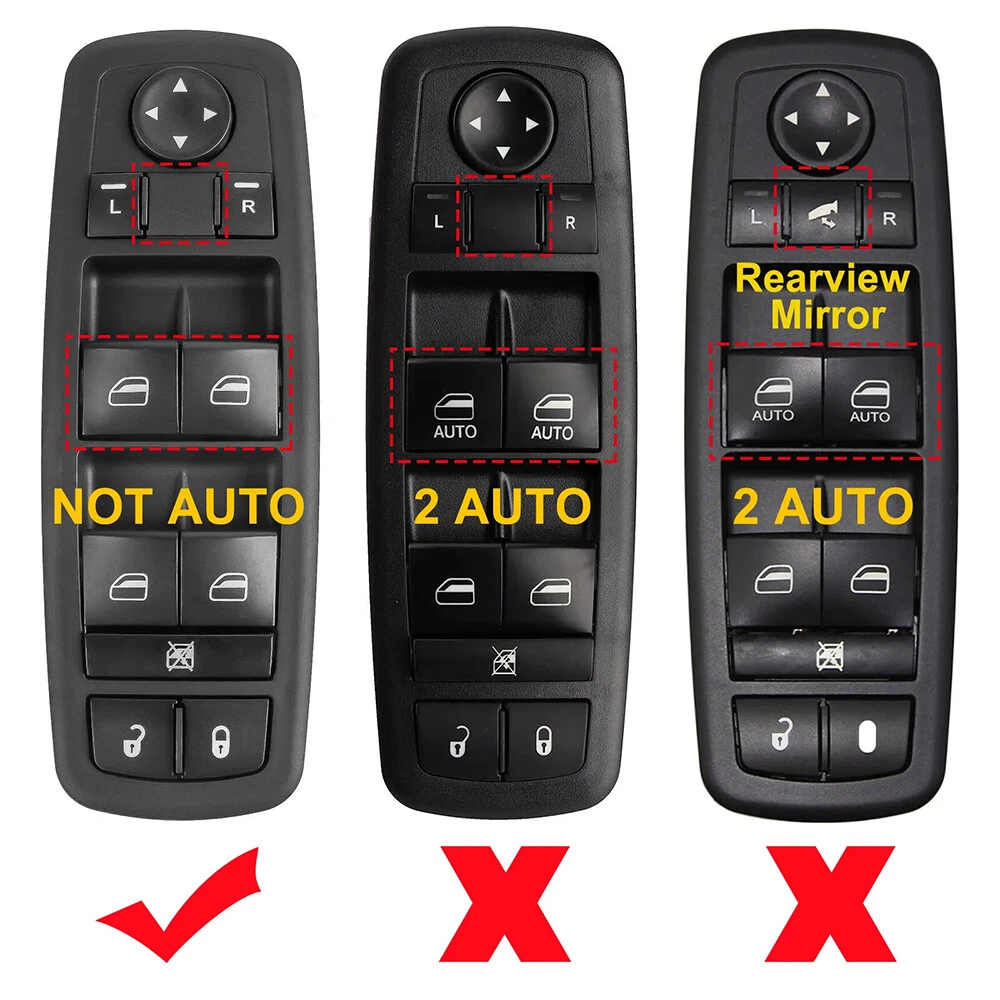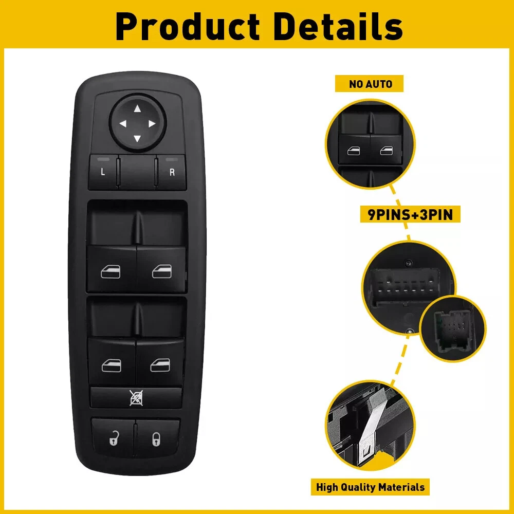 Master Power Window Switch For Dodge Grand Caravan 2008-2011 68039999AA Note: Please confirm the surface button and the back of pins before you buy. High quality OE factory production ,test each switch before shipping. Feature: -LH (Driver Side) FRONT -Easy install,direct replacement -Power Window Switch -Door Lock Switch -Window Lock Switch -Mirror Switch -Each item tested before shipment -Brand new product, 100% aftermarket -One Year's Warranty -High Quality and stable performance Specification: Color: Black To Control: Window Material: ABS Plastic Plug Pin Number: 12 Pins(9pins+3pins) Switch Type: Push Pull Switch Placement of Vehicle: Front, Left Fitment Type: Direct Replacement Manufacturer Part Number: 68039999AA Replace OE/OEM Part Number: 68039999AA Fitment: Fits For Dodge Grand Caravan 2008-2010 Fits For Dodge Journey 2009-2014 Fits For Dodge Caravan 2006-2007 Fits For Chrysler Town & Country 2008-2009 Fits For Jeep Grand Cherokee 2011-2013 Fits For Jeep Liberty 2008-2009 For Chrysler Town & Country 2008-2010 For Dodge Grand Caravan 2008-2010 Package Including: 1x Power Window Switch