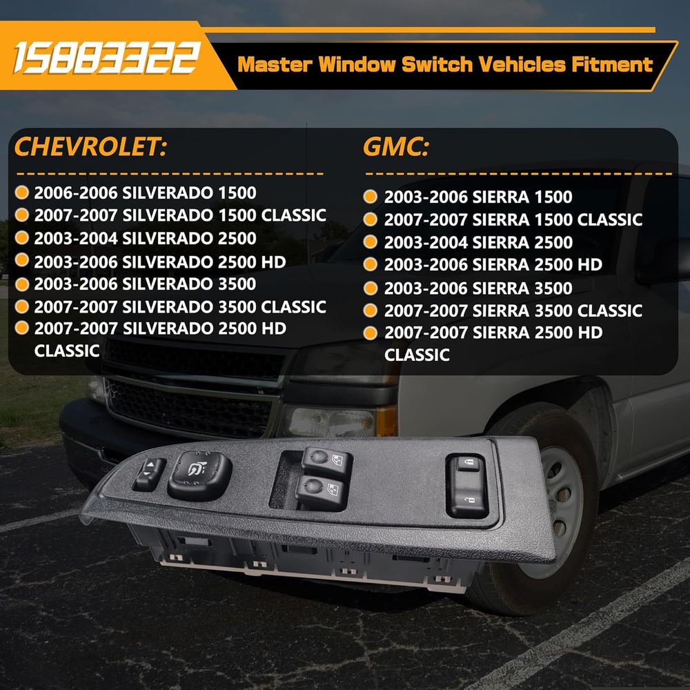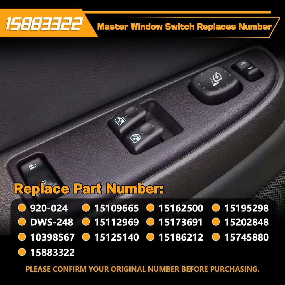 Replace Part Number: 920-024, DWS-248,10398567, 15109665, 15112969, 15125140, 15162500, 15173691, 15186212, 15195298, 15202848, 15745880, 15883322 . Please check the part number of original switch before ordering. Vehicle Fitment-1: Compatible with Chevrolet Silverado 1500 06, Silverado 1500 Classic 07, Silverado 2500 03-04, Silverado 2500 HD 03-06, Silverado 2500 HD Classic 07, Silverado 3500 HD 03-06, Silverado 3500 Classic 07. Vehicle Fitment-2: Compatible with Sierra 1500 03-06, Sierra 1500 Classic 07, Sierra 2500 03-04, Sierra 2500 HD 03-06, Sierra 2500 HD Classic 07, Sierra 3500 03-06, Sierra 3500 Classic 07. Precise Design: Perfect original switch replacement, very easy to install, ideal solution for your defective window switch. Premium Quality: This window door switch assembly is made of quality ABS & polycarbonate material to provide better performance and sensitive. Product Description