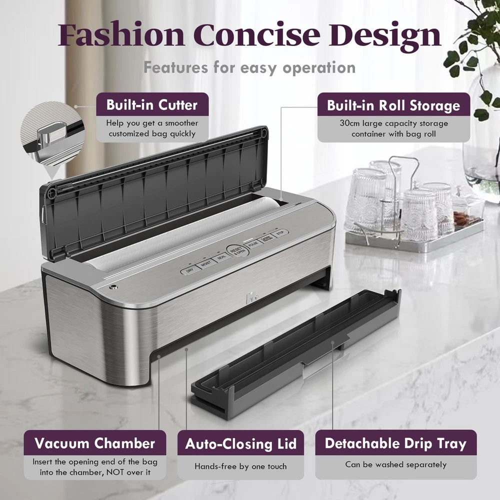 Vacuum Sealer Machine, 85kPa 120W Automatic Food Sealer, Powerful Sealing System, Build-in Cutter | Bags Storage | Moist Mode and Air Suction Hose | 2 Bag Rolls and 5pcs Pre-cut Bags 【Automatic Function Easy Operation】 DRY VAC & SEAL - For dry food, press to vacuum and seal. MOIST VAC&SEAL - For moist food, press to vacuum and seal. SEAL ONLY - One Press to seal. OPEN - Press to open the vacuum chamber cover automatically. PULSE - Control the vacuum pressure manually. EXTRA-VAC/MARINATE - For jars, canisters, wine preservation, wine preservation and marinate. CANCEL - Stop the current operation at any time. 【85kPa 120W Powerful Suction】The vacuum sealer boasts 120 watts of high power to achieve a rapid vacuum speed of 6-18 seconds. The upgraded copper core pump ensures corrosion resistance, heat resistance, and friction resistance, delivering a stable and security suction power of up to 85KPA. The vacuum sealer is ETL certified. We provide Trusted Safety Use for every of our customers. 【Built-in Cutter, Bag Storage, with Bag Rolls】 This vacuum machine is designed with a built-in Cutter, and a Storage Container for bag rolls Inside. Also, it included 2 bag rolls (8"x6.6"), 5pcs Pre-cut vacuum sealer bags, you do not need to buy the sealing bag additionally. Removable Drip Tray helps you clean the vacuum sealer easily. 【11.8" Upgrade Sealing Strip】The food sealer is equipped with 11.8-inch upgraded heat sealing strips, ensuring that every seal is perfect. It works well with sealing bags from other brands, ensuring a good sealing effect. Plus, the high-density and resilient silicone gaskets ensure that every seal is tight, this will keep food fresher for much longer. 【5 Year Warranty and Satisfied Service】You will receive 1 x vacuum sealer machine, 2 x vacuum bag rolls (8"x6.6"), 5x Pre-cut Vacuum bags (11"x16"), bags and rolls are BPA free, safe for Sous Vide, 1 x Air suction hose, 1 x User manual, We offer a 5-year warranty and friendly 24-hour customer service.