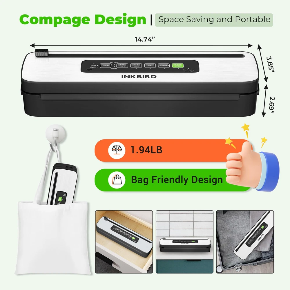 New Upgraded Liquid Mode with 6 Food Modes: The vacuum sealer upgrades food mode to 6 food preservation modes for dry; moist; liquid;pulse;seal;canister;Liquid- automatic vacuuming and sealing for liquid food (marinated food).Moist- small amounts of watery food(salmon, seafood). Dry- non-liquid foods such as nuts, and vegetables.Pulse- control the vacuuming process yourself, suitable for soft foods such as bread, to avoid food deformation or moist food. Canister- for jars, canisters and wine preservation. Seal- quick seal only More choose for Bag Type: The compact food sealer vacuum machine upgard bag type can be choosen, extra bag thickness options for all brand's vacuum bags on the market.It help to seal the bags well and no more burn. The food function is more specialized and refined. Ensures maximum air extraction when sealing moisture food items 130W High Power for Quick Sealing: This food sealer vacuum sealer machine has optimal performance -80Kpa,vac and seal in 10-20s.Built-in overheating protection system,support to work 24H continuously.Adopting high-tech, the width of the sealing strip is designed to be 0.08in/2mm, making it easier for liquid moisture to pass through the machine and making the bag more sealed by vacuuming.Keep Food Fresh Up to 10X Longer Compact Desgin,Space-saving,Built-in 11.8'' Cutter: The vacuum food sealer machine has a more compact design than other vacuum sealers, only 14.74 * 3.85 * 2.69In and weighing 1.94LB. Easily carry it in any package to go out for picnics, camping and traveling. It doesn't take up any countertop space at all, making it perfect for households.Vacuum sealer for food is the ideal gift for home cooks;food enthusiasts;mothers!11.8" maximum sealing length allows you to seal multiple bags in one sealing time Full Start Kit,Get You Start:A cost-friendly option for starters. The package included 1*vacuum sealing machine, 10*Vacuum Bags(1,8''*11.8''),1* Air Suction Hose, 1*Sealing Strip, 1*Foam Gasket, User Manual, Power Cord, Sticky Note*1. Meet ETL certification standards and provide you with lifelong technical guidance for your products