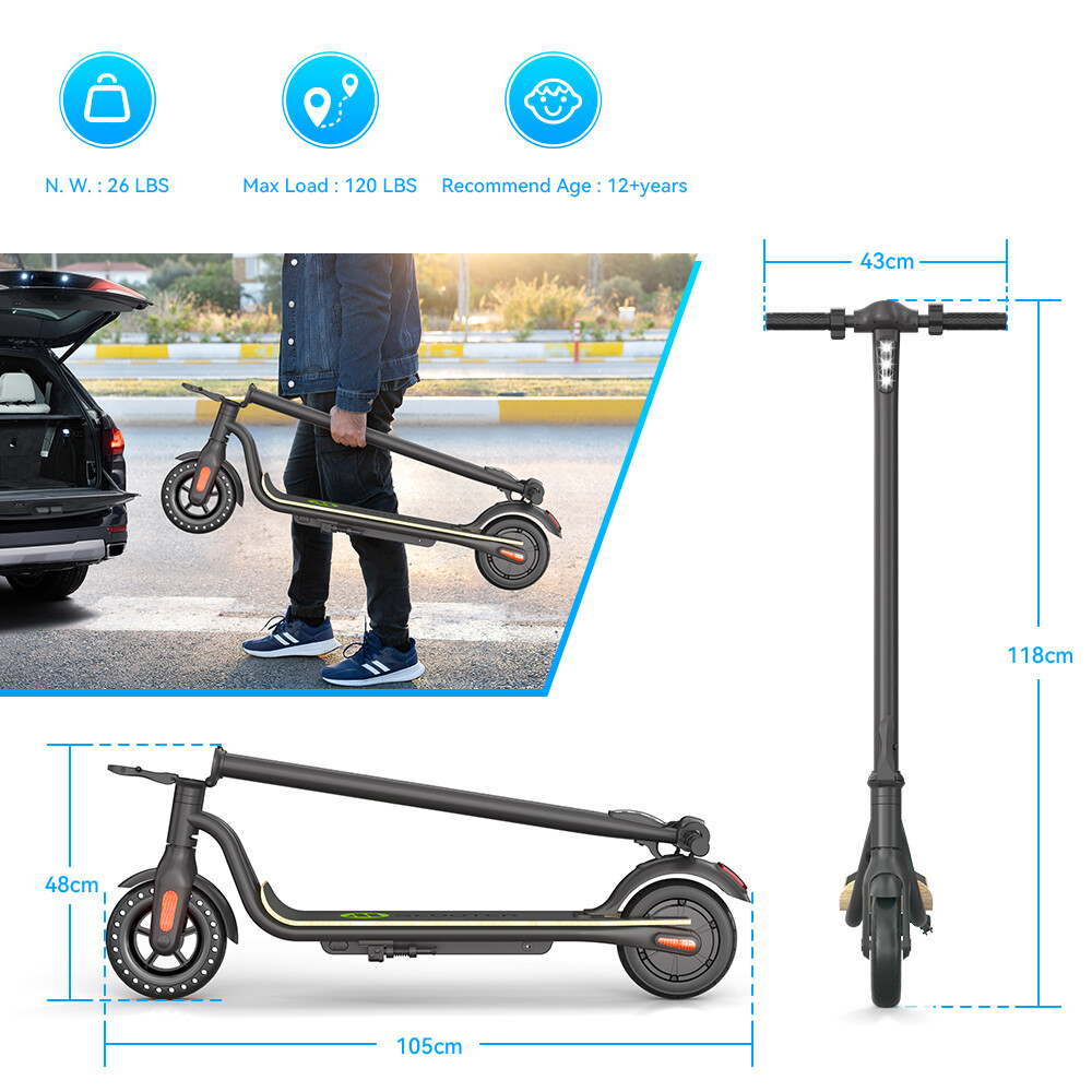 Main features: LONG RANGE BATTERY LIFE - Powerful 250W motor and 5.2 Ah/36V lithium battery pack that supports a speed of up to 15.5 Mph with a range up to 7 Miles. Updated large-capacity battery life, designed for commuters and longer distances. 8.0" HONEYCOMB & SOLID TIRES - Shock-absorbing rubber tires offer a smooth ride even over bumpy surfaces. PORTABLE FOLDING DESIGN - Electric scooter can be folded easily in 3 seconds with quick folding latch for easy carrying and storage. BATTERY INDICATOR AND LIGHTS - Battery indicator keeps to track battery life. Ultra bright LED headlight and taillight. Fast recharging about 5 hours. GEAR SHIFT SETTING - 1st gear for a 7.5 Mph comfortable ride or 3rd gear to get the 15.5 Mph fast experience. Extremely fun to ride and end boring commutes. Specification: Brand: Megawheels Model: S10 Dimension: Unfolding 105 x 43 x 118 cm; Folding: 105 x 43 x 48 cm Net Weight: 11.9kg Color: Black Frame Material: Aluminium Tires: 8.0" Honeycomb Front Tire & Solid Rear Tire Max Load: 100kg Max speed: 25KM/h Speed level: Gear 1--Max 10km/h ; Gear 2--Max 20km/h; Gear 3--Max 25km/h Mileage: 8-12km Grade Ability: 20 degree slope Working Temperature: -15°C-50°C Storage Temperature: -20°C-25°C Mode Type of Motor: Brushless hub motor Battery Type: High quality lithium battery Battery Capacitiy: 5.2 Ah Battery Voltage: 36V Charger Input Voltage: 100V-240V Charger Frequent: 50Hz/60Hz Charging time: 4 hours Package Contents: 1 * Folding Electric Scooter 1 * Battery Charger 1 * User's Manual Riding Skills: -Put your foot in the front of the scooter and the other foot on the floor before riding. -Make sure that the riding route is smooth. -Slide forward with the food standing on the floor before starting (like riding the scooter without power). -Immediately press the acceleration button and lean forward to avoid falling over backward due to inertia, so that the electric scooter will enter the working status. -Avoid pressing the handle with your body in the acceleration and deceleration process. Put one foot ahead and the other behind (like on the sliding plate/surfboard, put one foot ahead and the other behind by 70-90 for better comfort). -Turning – The turning principle of the electric scooter is the same with that of surfboard/sliding plate/skis. The handle shall be balanced with the body. Observe and make sure that turning is safe before turning. Tips: Before riding the scooter, please put one foot on the scooter deck and the other foot on floor and push the scooter forward by kicking the floor for some distance, in this way, the scooter will get some impulse to run forward. Note: This products have been certified under UL2272 safety standards.