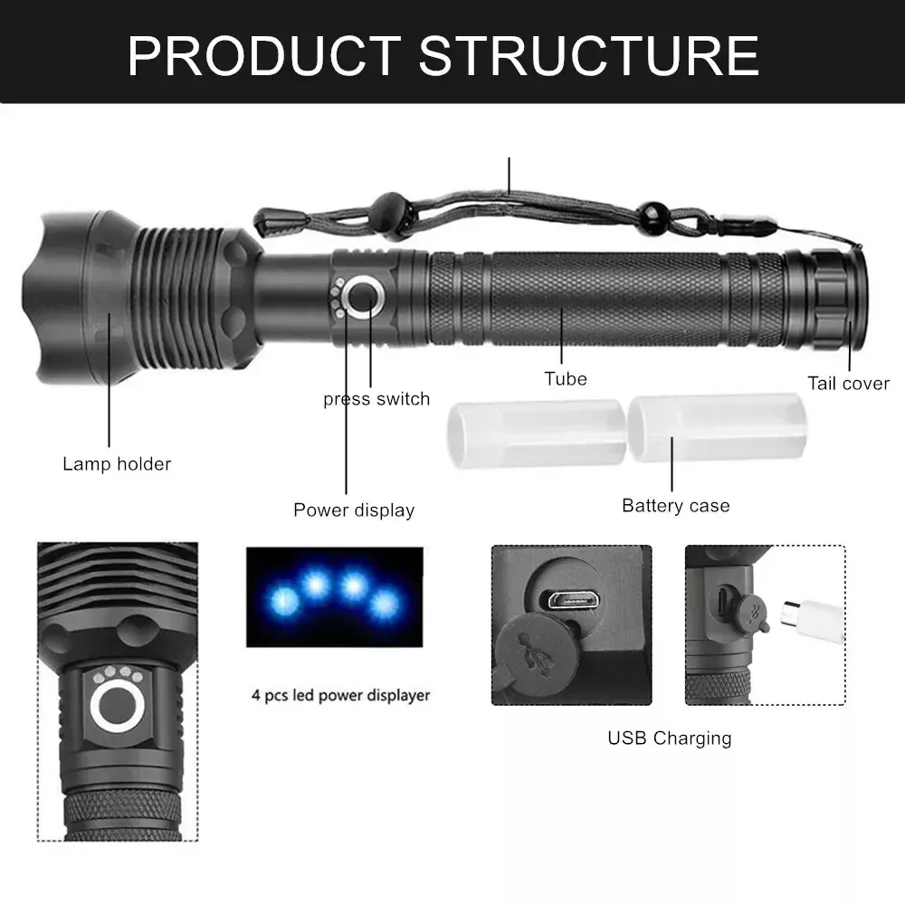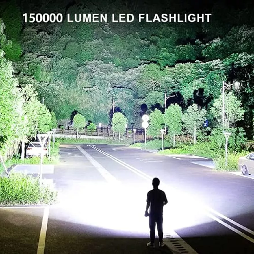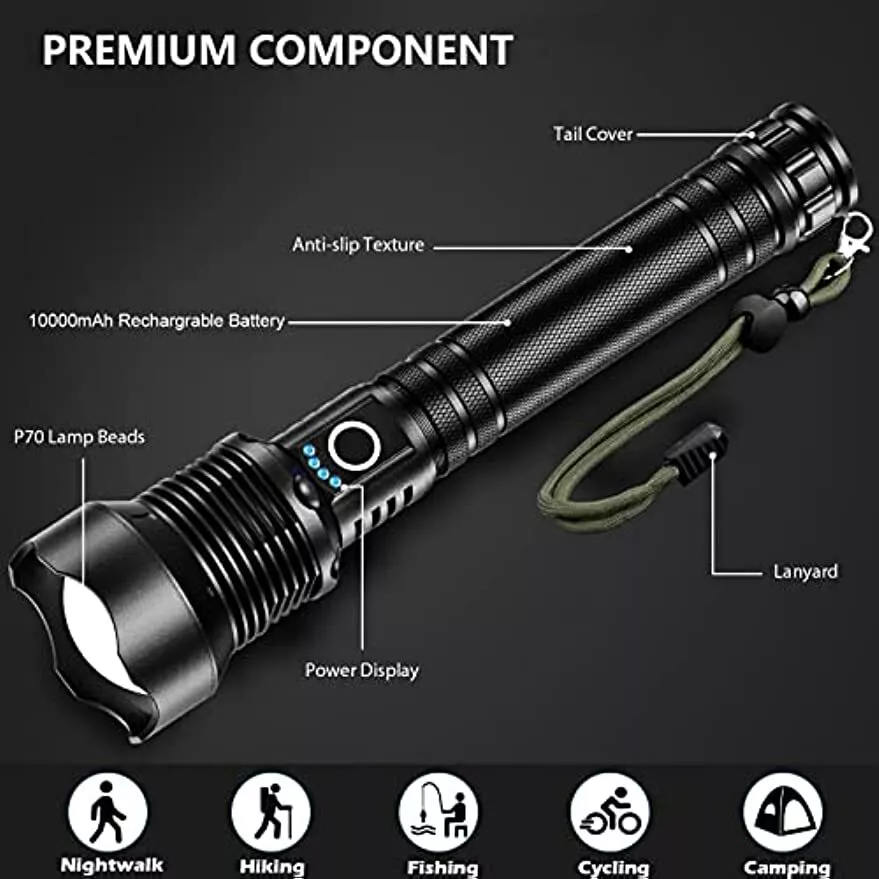 Product Description: Brightness: 4000 lumens Waterproof rating: IPX5 Beam distance: 1093 yards Power Capacity: 10000mAh Material: Aviation aluminium LED lamp life: 100,000 hours Usage time: 6 to 12 hours (approx.) Lighting Modes; High, Medium, Strobe Features: SUPER BRIGHT WIDE BEAM: The 4,000 lumen torch can effortlessly light up two football fields, providing a reliable and convenient lighting tool. PORTABLE AND RELIABLE: The torch fits easily into a car or survival kit. The strobe and SOS functions are your saviour when making roadside repairs or signalling for help. BATTERY INDICATOR: Powered by rechargeable batteries that can be recharged via USB cable (included), the torch can last up to 6 hours in low-light mode, and the torch has a four-cell indicator to remind you to recharge it in time. When the number of indicators decreases, it means the power level is down. IPX5 WATERPROOF: Waterproof rating up to IPX4, the body of the torch is made of high quality splash-proof aluminium alloy waterproof and non-slip to ensure that it can be used even in rainy days, suitable for outdoor use. Three modes:There are three lighting modes: high, low and strobe, you can choose the right lighting mode according to your needs. 10000 mAh REECHARGEABLE BATTERY: Equipped with 10000 mAh ΒATTERY and upgraded P70 LED chip, it can provide you with up to 12 hours of medium brightness illumination. Beam distance up to 3280 ft. IMPACT RESISTANT: Constructed of aircraft grade aluminium for pressure and impact resistance. 2 LIGHTING MODES - NARROW BEAM AND WIDE BEAM: Wide beam (flood) and narrow beam (spot) lighting modes are designed to make the flashlight suitable for more lighting situations. Package Includes: 1 x Powerful LED Flashlight 1 x 10000 mAh rechargeable battery 1 x USB cable 1 x Flashlight Lanyard 1 x English Manual
