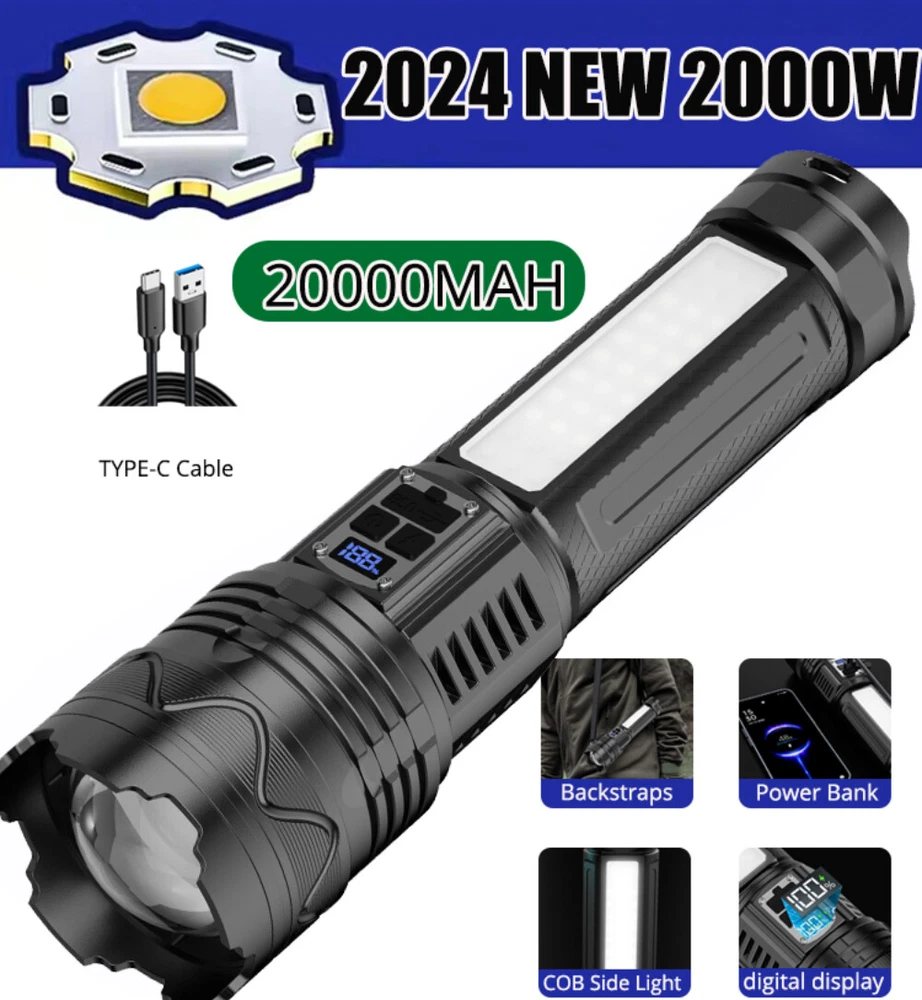 Product Features: 1, Super bright white laser wick, built-in high-capacity lithium battery, large floodlight, poly far shot. 2, Multi-functional work side light, strong light - low light - red light - red light flashing 3, Power reminder, digital display 4, USB dual interface, fast charging more efficient. 5, 5 lighting modes: strong light - medium light - low light - burst flash - SOS 6, Far and near zoom light head, telescopic adjustment. Adjust different lighting modes 7, IPX6 grade life waterproof, adapt to any harsh environment. Friendly note: Keep the white laser out of your eyes.