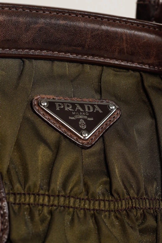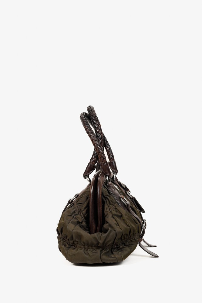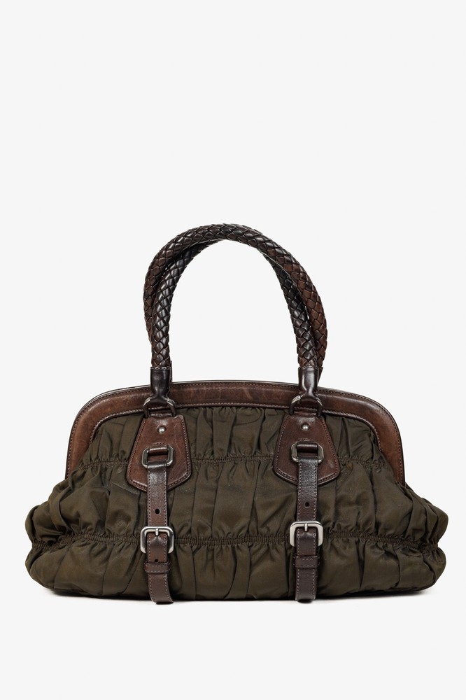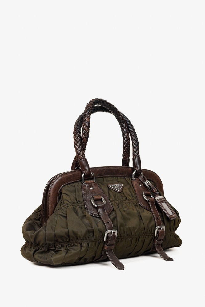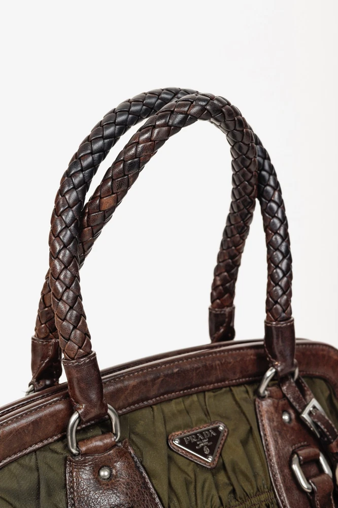 This Italian-made shoulder bag from Prada's 2007 Resort collection is crafted with the designer's Tessuto Gaufre nylon in an army green, and features dark brown leather trim, silver-tone hardware, two braided leather handles, a structured frame, buckled detailed straps, and a removable tag. Secured with magnetic snap closures, the top opens to a black logo-jacquard-lined interior containing a slip pocket, and a zip pocket. Condition: Excellent; some scratching and wear on leather trim, minimal wear on nylon exterior and interior. Comes with dustbag. Approximate measurements: Height: 9.25" (23.5 cm) Width (bottom, top): 14", 12.5" (35.5 cm, 32 cm) Depth: 4.5" (11 cm) Handle Drop: 6.5" (16.5 cm) Composition: Nylon, leather trim, fabric lining, metal hardware.