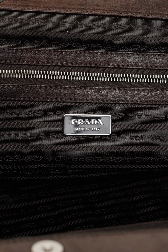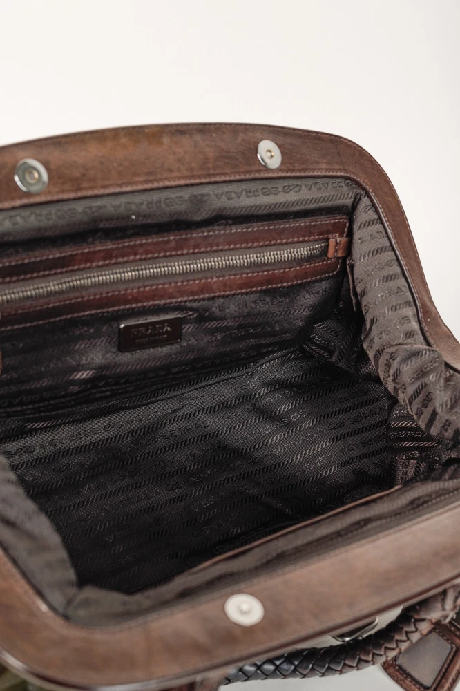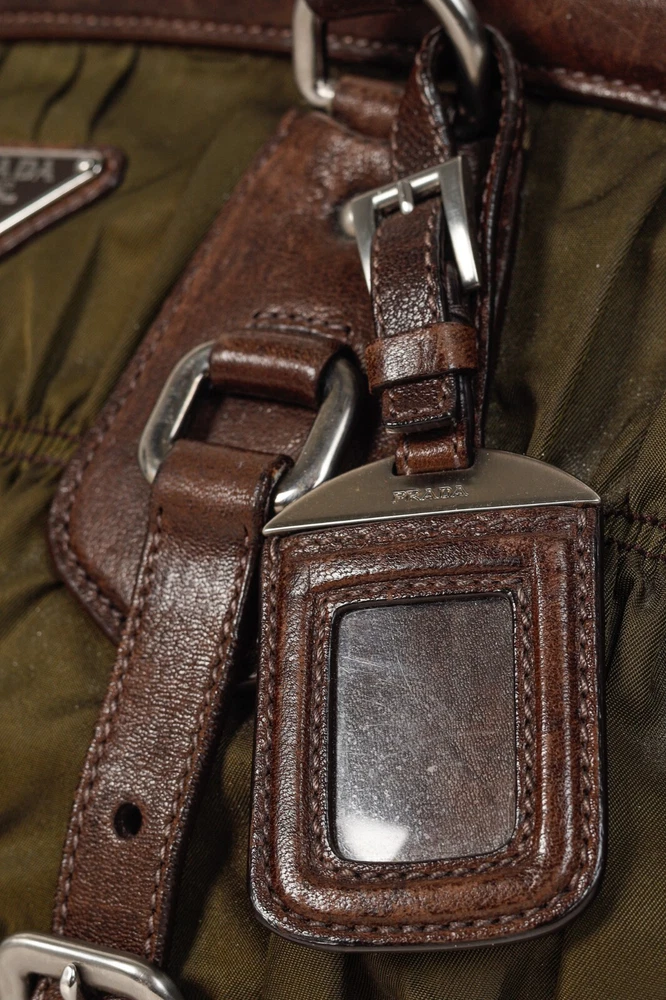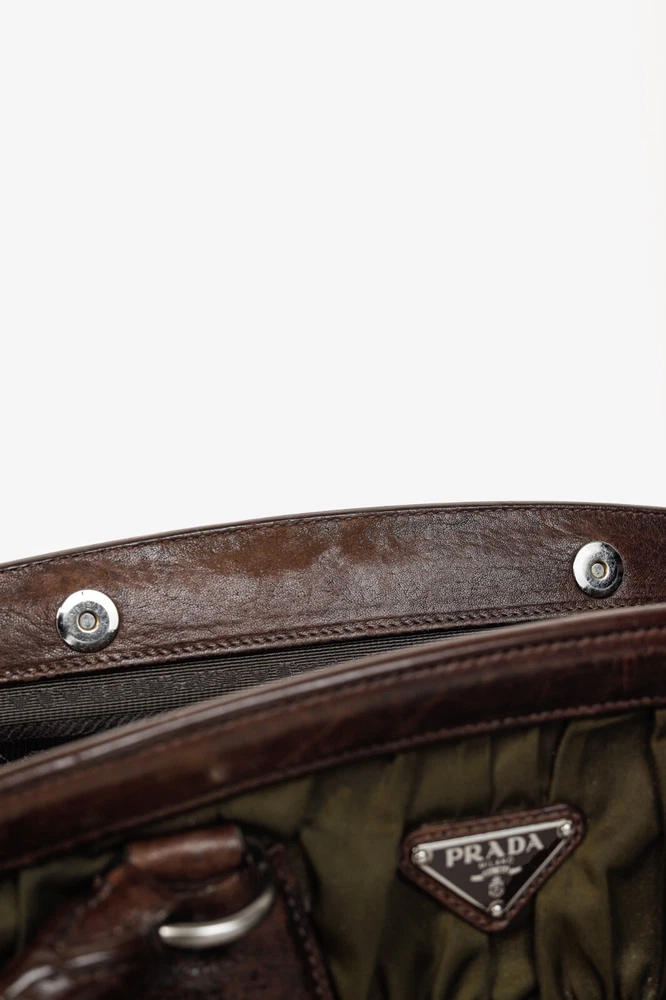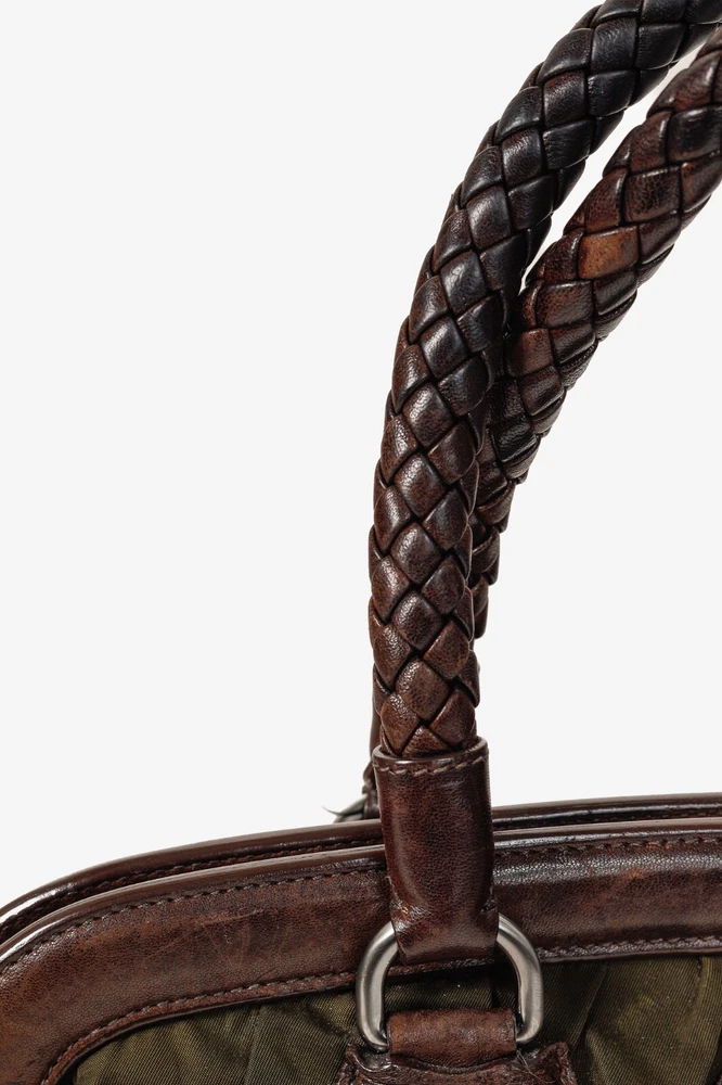 This Italian-made shoulder bag from Prada's 2007 Resort collection is crafted with the designer's Tessuto Gaufre nylon in an army green, and features dark brown leather trim, silver-tone hardware, two braided leather handles, a structured frame, buckled detailed straps, and a removable tag. Secured with magnetic snap closures, the top opens to a black logo-jacquard-lined interior containing a slip pocket, and a zip pocket. Condition: Excellent; some scratching and wear on leather trim, minimal wear on nylon exterior and interior. Comes with dustbag. Approximate measurements: Height: 9.25" (23.5 cm) Width (bottom, top): 14", 12.5" (35.5 cm, 32 cm) Depth: 4.5" (11 cm) Handle Drop: 6.5" (16.5 cm) Composition: Nylon, leather trim, fabric lining, metal hardware.