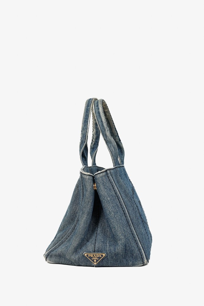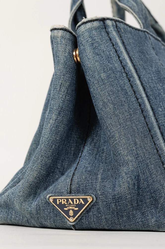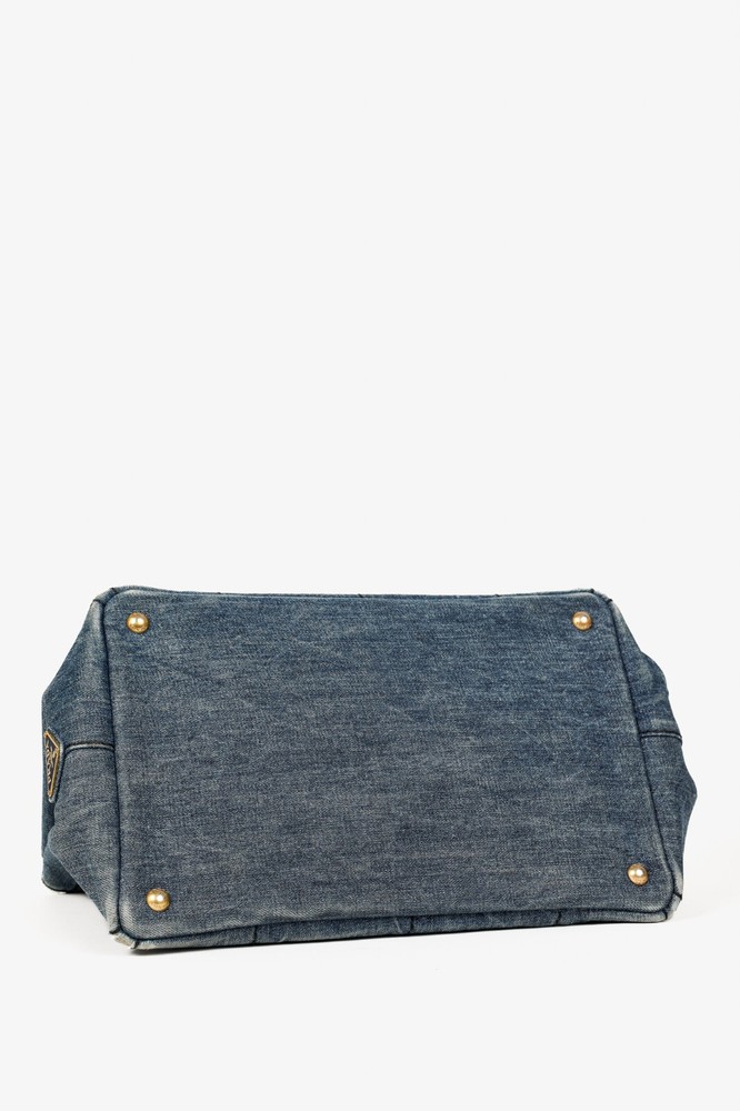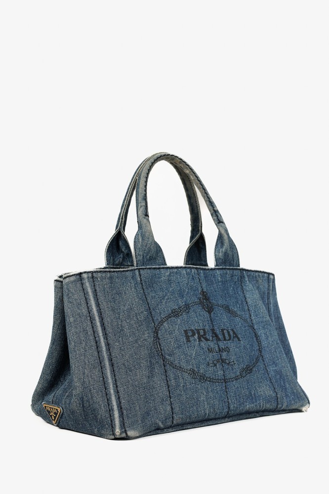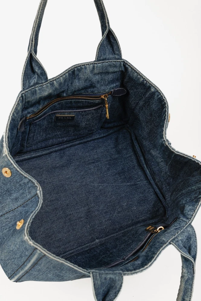 Made in Turkey, this Canapa tote from Prada is crafted with a sturdy denim in an Avio blue, and features gold-tone hardware, two top handles, snap-closure side gussets, protective bottom feet, the designer's logo printed on the front; and a spacious interior containing three slip pockets, and two zip pockets. Condition: Very good; some discolouration on exterior and inner top edge, some distressing on handles and corners, some wear on bottom feet, some wear on inner leather tabs. Comes with authenticity card. Approximate measurements: Height: 8.5" (21.5 cm) Width: 13" (33 cm) Depth: 8.25" (21 cm) Handle Drop: 6.75" (17 cm) Composition: Denim, metal hardware.