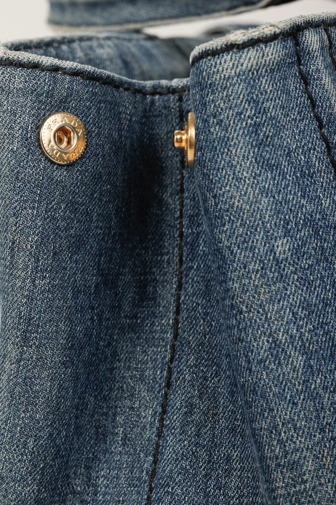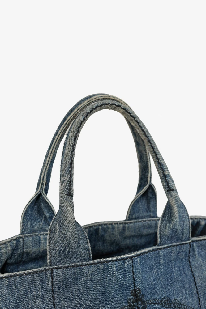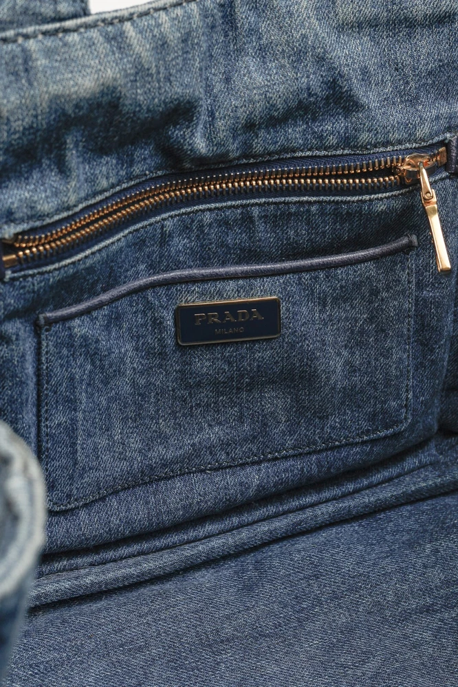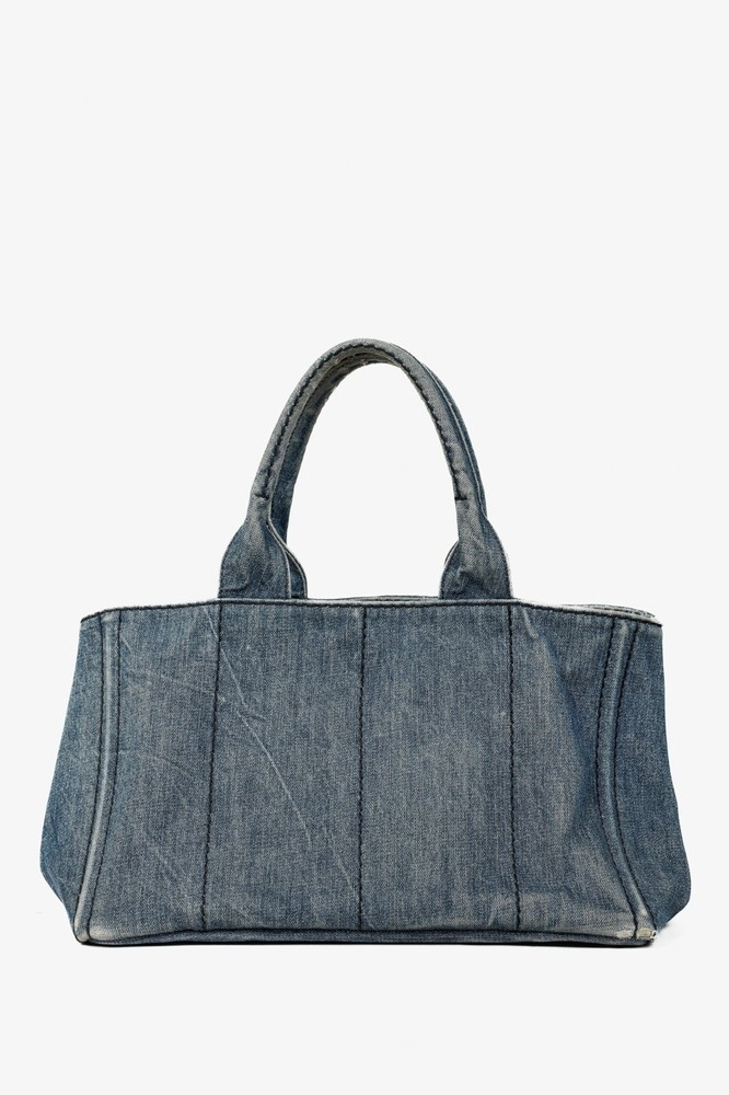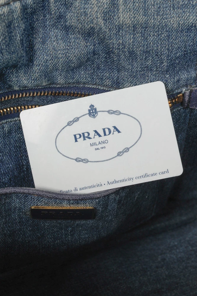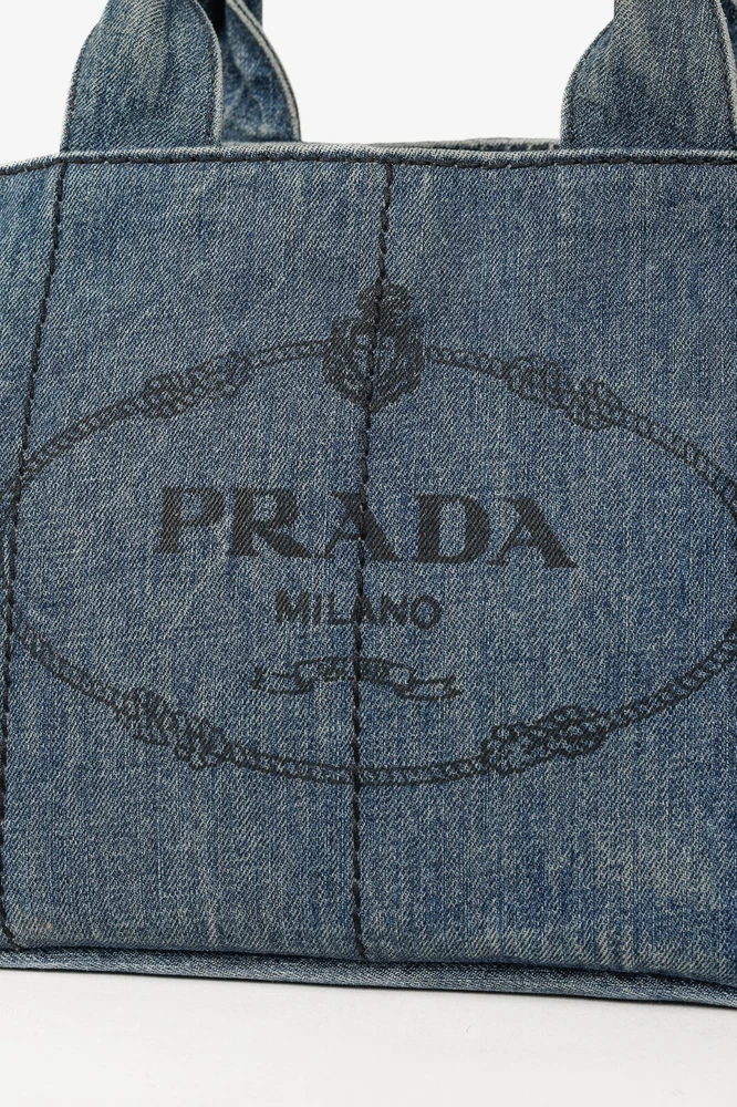 Made in Turkey, this Canapa tote from Prada is crafted with a sturdy denim in an Avio blue, and features gold-tone hardware, two top handles, snap-closure side gussets, protective bottom feet, the designer's logo printed on the front; and a spacious interior containing three slip pockets, and two zip pockets. Condition: Very good; some discolouration on exterior and inner top edge, some distressing on handles and corners, some wear on bottom feet, some wear on inner leather tabs. Comes with authenticity card. Approximate measurements: Height: 8.5" (21.5 cm) Width: 13" (33 cm) Depth: 8.25" (21 cm) Handle Drop: 6.75" (17 cm) Composition: Denim, metal hardware.