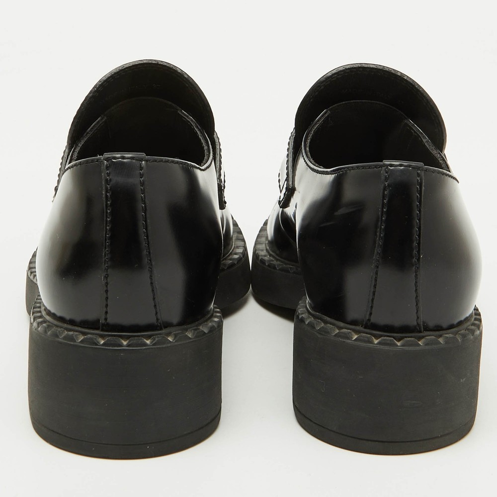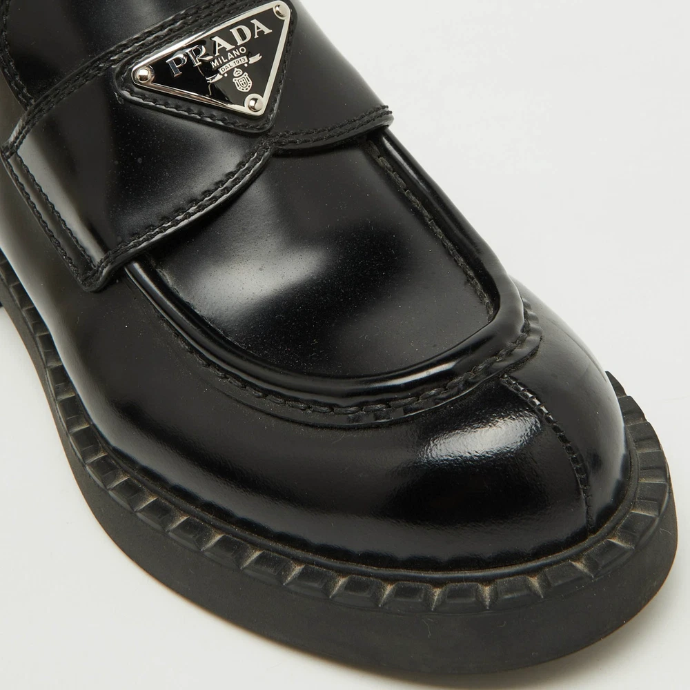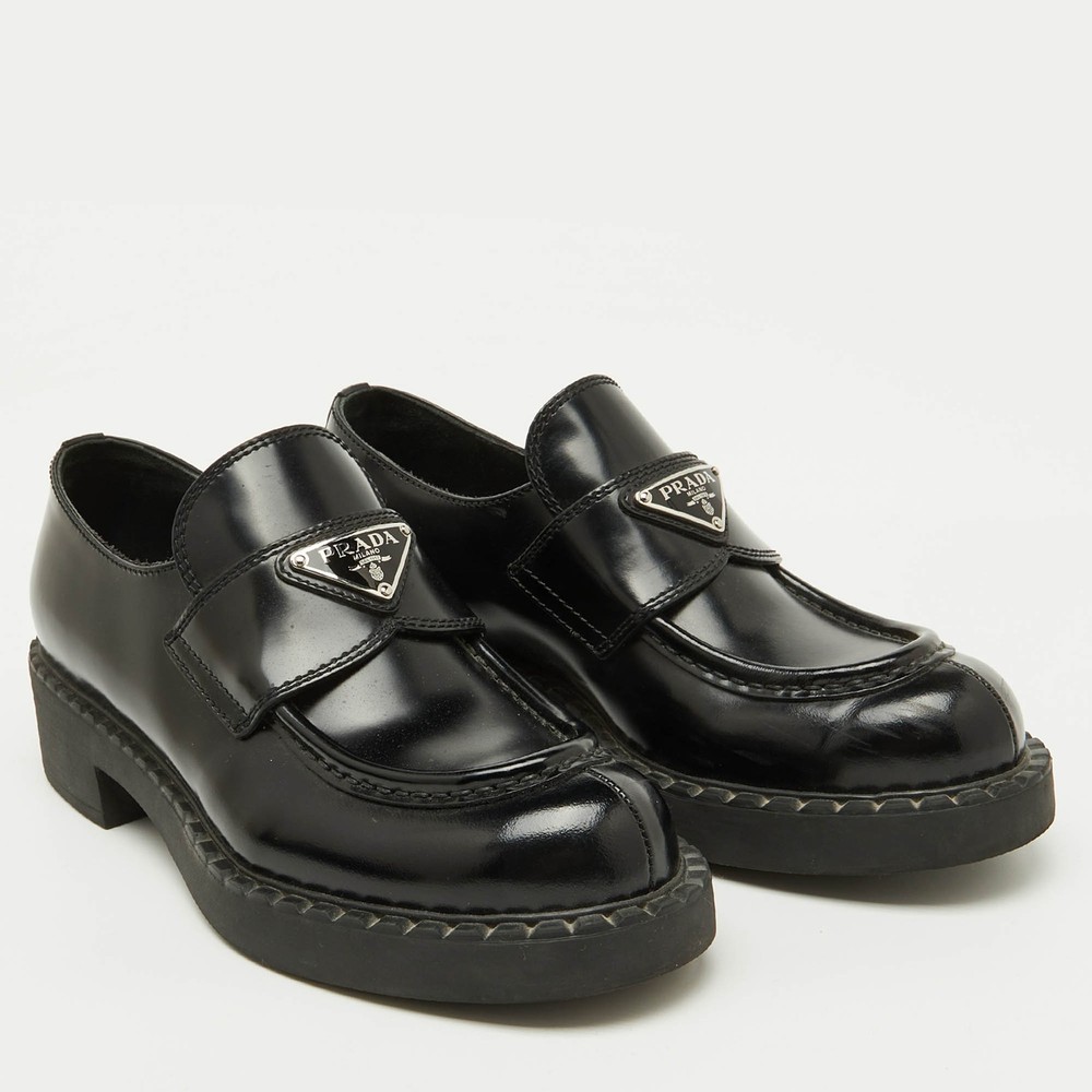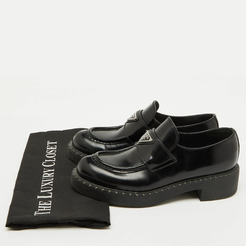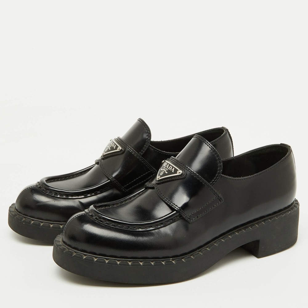 These loafers from Prada are not only high in appeal but also very skilfully made. The leather loafers have a comfortable shape and will complement any look.Certified by The Luxury Closet - This item has gone through a detailed authentication process overseen by our experts. We offer a lifetime guarantee of authenticity on all our items. Import duties, taxes and charges are not included in the item price. These charges are the buyers responsibility. Please check with your country’s customs office to determine what these additional cost will be prior to buying. Our eBay Store About Us Contact Us Add to Favorite Sellers Prada Black Leather Triangle Logo Monolith Platform Loafers Size 37 $794.2 These loafers from Prada are not only high in appeal but also very skilfully made. The leather loafers have a comfortable shape and will complement any look. Product Details Brand Color Black Dimensions Material Leather Size 37 Outsole Width 10.5 cm Outsole Length 27 cm Heel Height 4 cm Includes The Luxury Closet Packaging Certified by The Luxury Closet This item has gone through a detailed authentication process overseen by our experts. We offer a lifetime guarantee of authenticity on all our items. How We Check The in-house team of experts at The Luxury Closet is highly trained to verify the authenticity and the condition of the luxury products. They ensure that only 100% authentic items are put on sale.The evaluation process is unique with its own mix of assessment criteria and differs according to the category. Each item is evaluated based on the following combination of hallmarks, hardware, stitching, symmetry, material, craftsmanship, stamping, codes, hologram stickers, and packaging. Our authenticators also check if the items have been modified or amended (e.g., aftermarket diamonds, replaced batteries, repaired bags, etc.) International Buyers Import duties, taxes and charges are not included in the item price. These charges are the buyers responsibility. Please check with your country’s customs office to determine what these additional cost will be prior to buying.