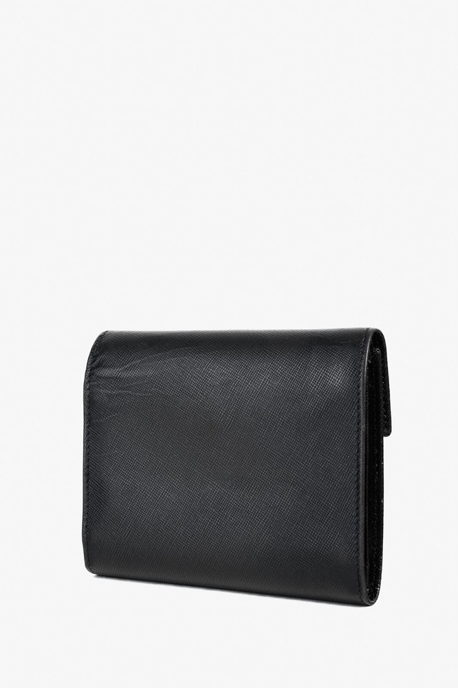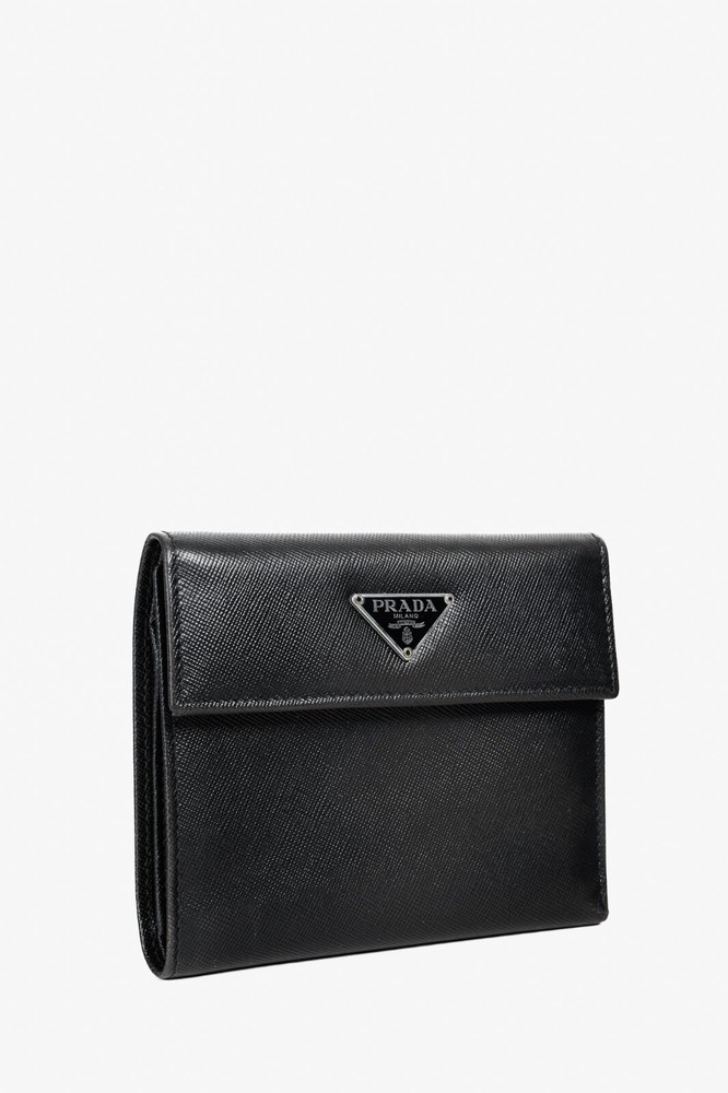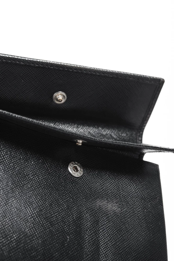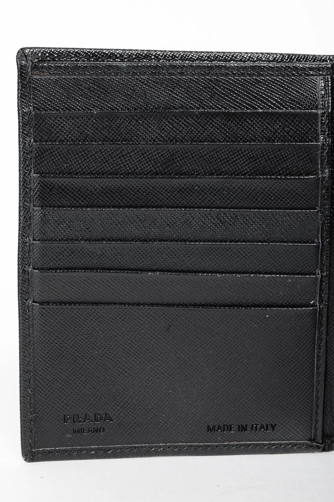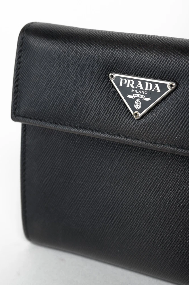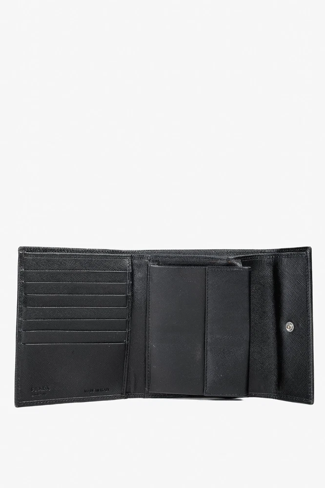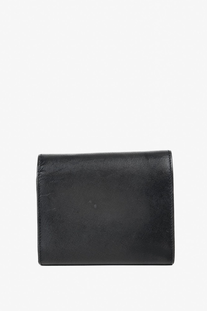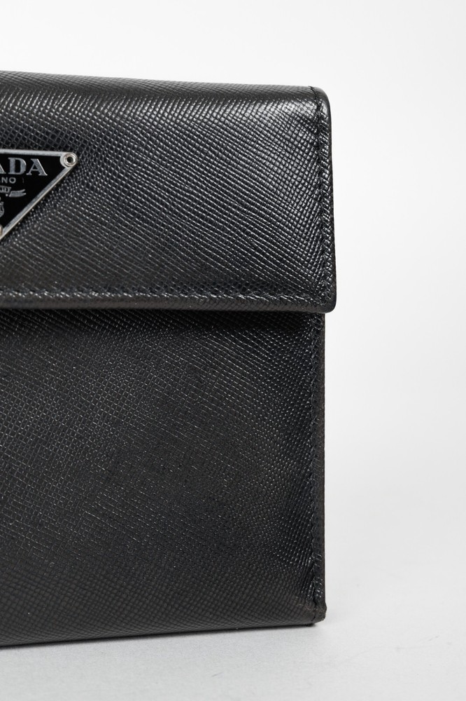 The Prada Black Saffiano Compact Wallet is a stylish and functional accessory for any fashion-forward individual. With the iconic Prada Crest up front, it exudes luxury and sophistication. It offers a spacious bill compartment, 7 card slots, 2 large slots, and a convenient coin compartment, all secured with a button closure. Condition: Fair; visible indentations from wear, creasing, a small hole at edge and a couple of small holes in lining Approximate measurements: Height: 4.5" (12 cm) Width: 5.25" (13 cm) Depth: 1" (2 cm) Composition: Leather
