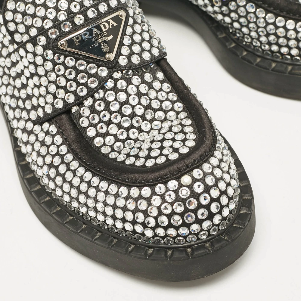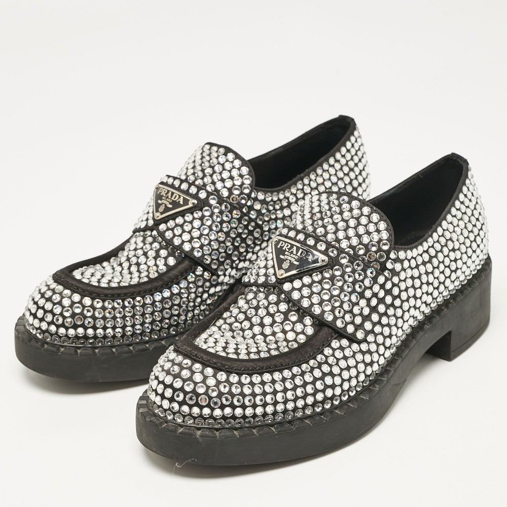 Indulge in the ultimate expression of elegance with these exquisitely crafted Prada slip ons. Made in Italy, the black satin loafers are adorned with sparkling crystals, offering a touch of glamor.Certified by The Luxury Closet - This item has gone through a detailed authentication process overseen by our experts. We offer a lifetime guarantee of authenticity on all our items. Import duties, taxes and charges are not included in the item price. These charges are the buyers responsibility. Please check with your country’s customs office to determine what these additional cost will be prior to buying. Our eBay Store About Us Contact Us Add to Favorite Sellers Prada Black Satin Crystals Slip On Loafers Size 36 $517 Indulge in the ultimate expression of elegance with these exquisitely crafted Prada slip ons. Made in Italy, the black satin loafers are adorned with sparkling crystals, offering a touch of glamor. Product Details Brand Color Black Dimensions Material Satin Size 36 Outsole Width 8 cm Outsole Length 26 cm Heel Height Includes Original Dustbag, Info Booklet, Original box damaged, Branded Box Certified by The Luxury Closet This item has gone through a detailed authentication process overseen by our experts. We offer a lifetime guarantee of authenticity on all our items. How We Check The in-house team of experts at The Luxury Closet is highly trained to verify the authenticity and the condition of the luxury products. They ensure that only 100% authentic items are put on sale.The evaluation process is unique with its own mix of assessment criteria and differs according to the category. Each item is evaluated based on the following combination of hallmarks, hardware, stitching, symmetry, material, craftsmanship, stamping, codes, hologram stickers, and packaging. Our authenticators also check if the items have been modified or amended (e.g., aftermarket diamonds, replaced batteries, repaired bags, etc.) International Buyers Import duties, taxes and charges are not included in the item price. These charges are the buyers responsibility. Please check with your country’s customs office to determine what these additional cost will be prior to buying.