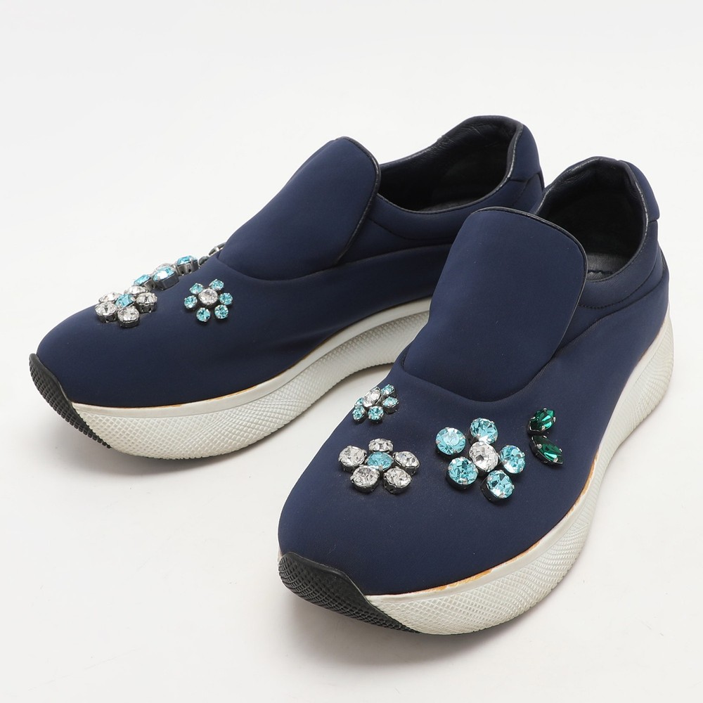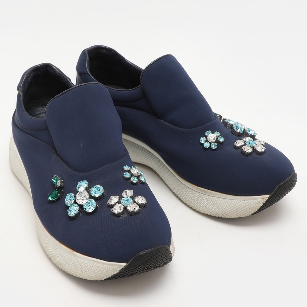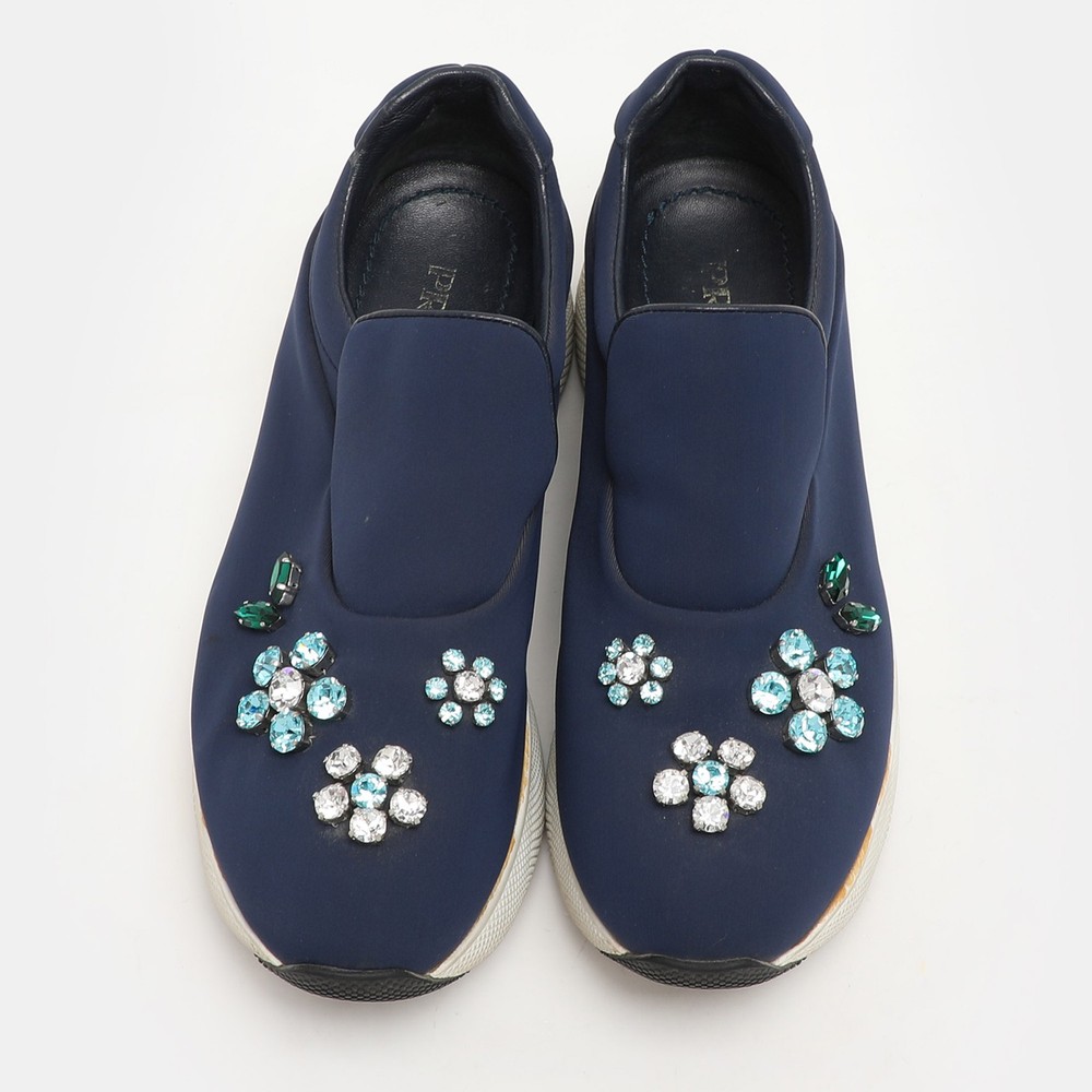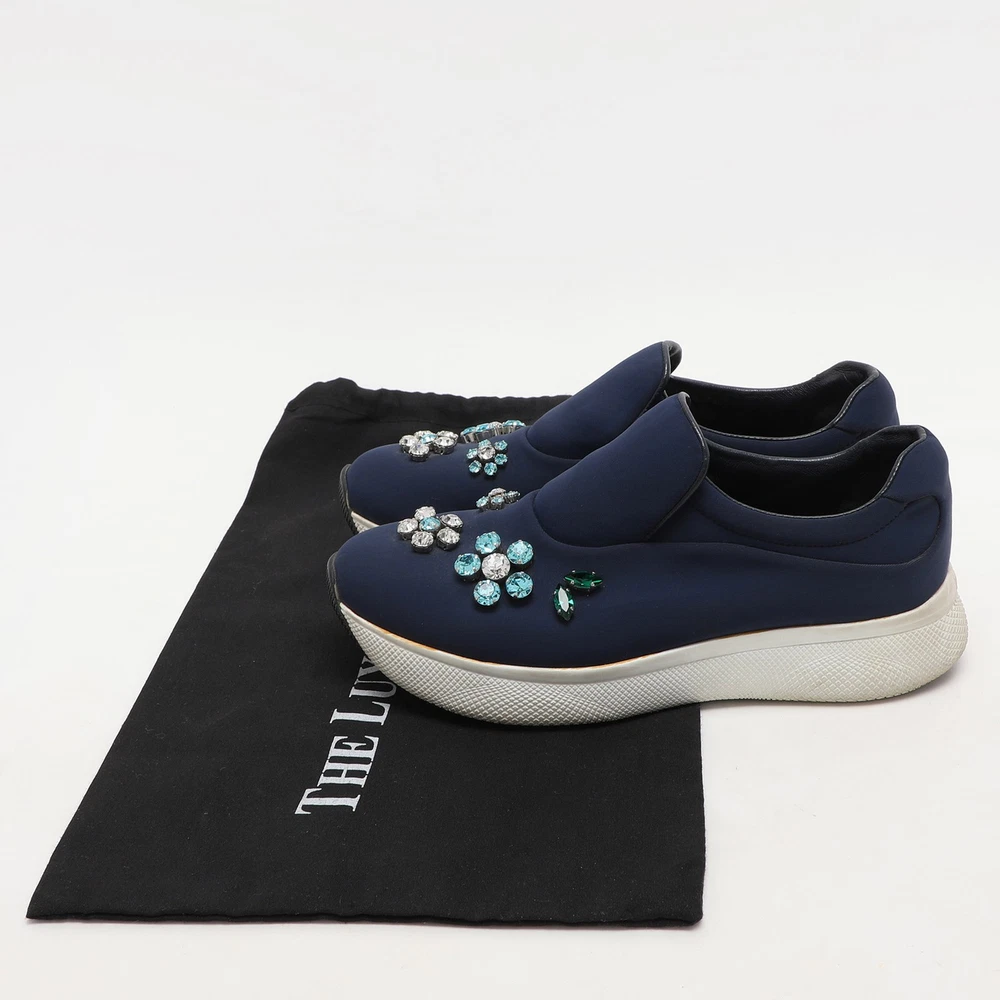 Prada Blue Nylon Crystal Embellished Slip-On Sneakers Catch Me If You Can