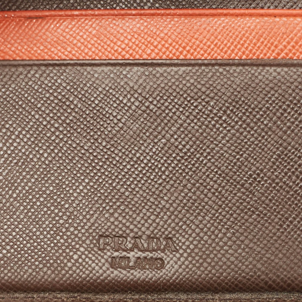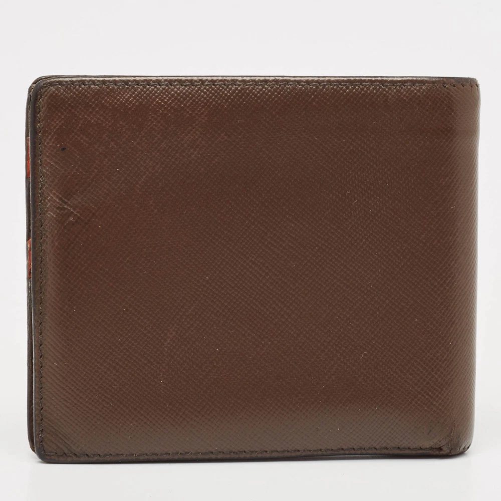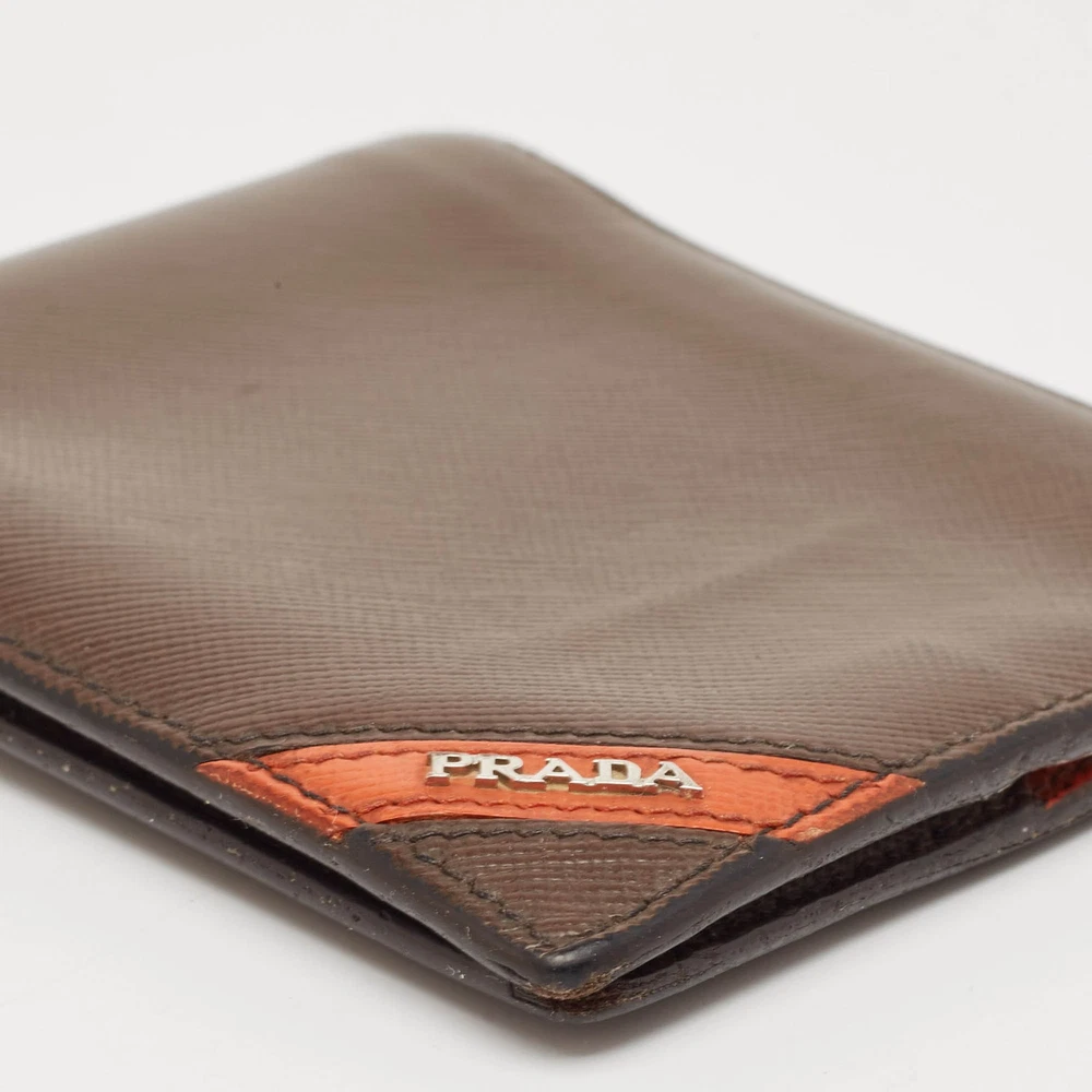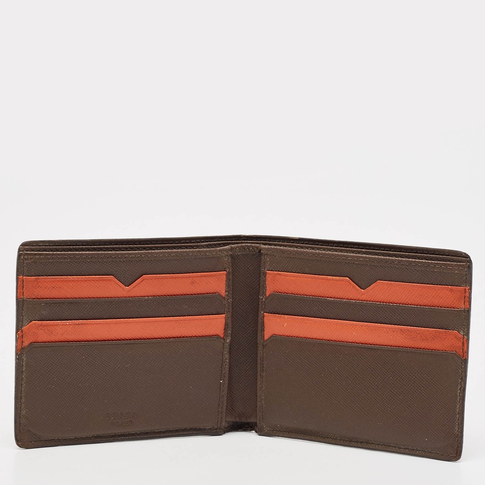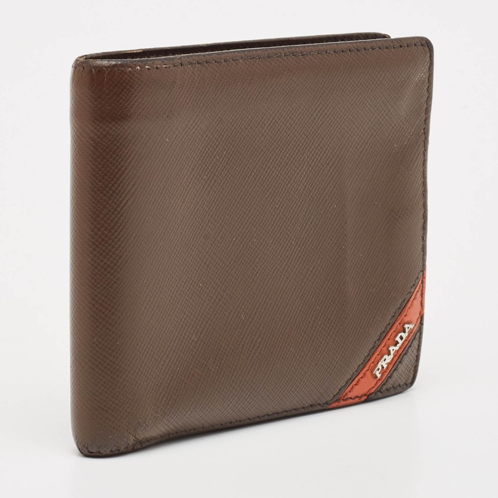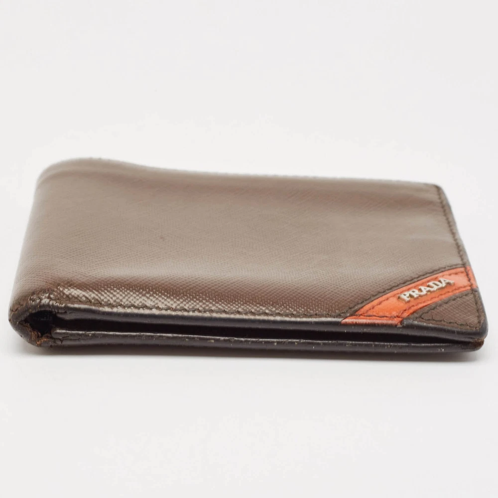 Crafted with Saffiano metal leather, this Prada bifold wallet for men reflects unparalleled Italian craftsmanship. Its sleek design effortlessly merges elegance with functionality. Finished with the brand detail, it is perfect for the discerning gentleman.Certified by The Luxury Closet - This item has gone through a detailed authentication process overseen by our experts. We offer a lifetime guarantee of authenticity on all our items. Import duties, taxes and charges are not included in the item price. These charges are the buyers responsibility. Please check with your country’s customs office to determine what these additional cost will be prior to buying. Our eBay Store About Us Contact Us Add to Favorite Sellers Prada Dark Brown/Orange Saffiano Metal Leather Bi Fold Wallet $112.2 Crafted with Saffiano metal leather, this Prada bifold wallet for men reflects unparalleled Italian craftsmanship. Its sleek design effortlessly merges elegance with functionality. Finished with the brand detail, it is perfect for the discerning gentleman. Product Details Brand Color Brown Dimensions Height: 9.5 cm, Width: 1.5 cm, Length: 11 cm Material Leather Size Outsole Width Outsole Length Heel Height Includes The Luxury Closet Packaging Certified by The Luxury Closet This item has gone through a detailed authentication process overseen by our experts. We offer a lifetime guarantee of authenticity on all our items. How We Check The in-house team of experts at The Luxury Closet is highly trained to verify the authenticity and the condition of the luxury products. They ensure that only 100% authentic items are put on sale.The evaluation process is unique with its own mix of assessment criteria and differs according to the category. Each item is evaluated based on the following combination of hallmarks, hardware, stitching, symmetry, material, craftsmanship, stamping, codes, hologram stickers, and packaging. Our authenticators also check if the items have been modified or amended (e.g., aftermarket diamonds, replaced batteries, repaired bags, etc.) International Buyers Import duties, taxes and charges are not included in the item price. These charges are the buyers responsibility. Please check with your country’s customs office to determine what these additional cost will be prior to buying.