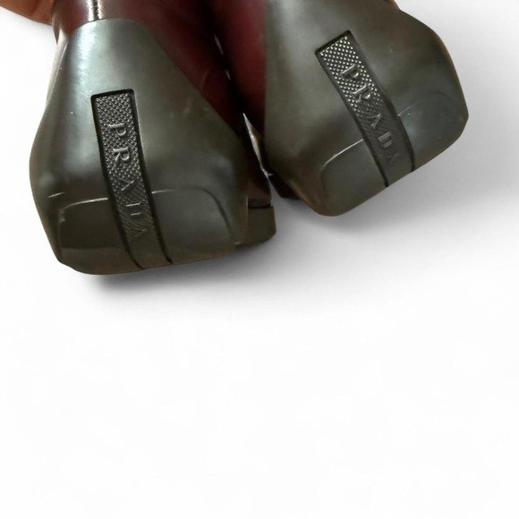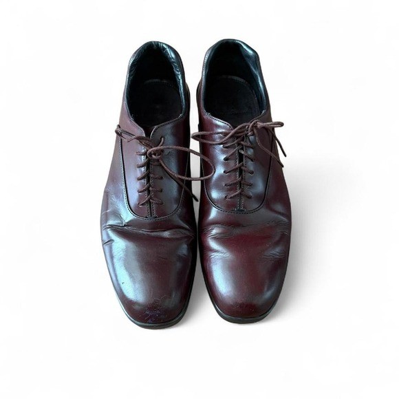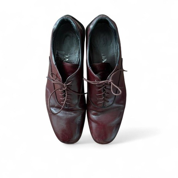Prada Men's Burgundy Leather Oxford Dress Shoes Size 8 Italy Square Toe Authentic vintage Prada men's oxford dress shoes in a deep burgundy leather. Features a classic lace-up front, squared toe, and rubber soles with embossed PRADA branding on the heels. Made in Italy. Size marked 8. These are well-worn with visible creasing, scuffs at the toes, and insole fading (see all photos). • Style code: 2 EG 026 8 • Leather upper, rubber outsole • Made in Italy • Condition: Pre-owned, visible wear Great designer addition to any formal or vintage wardrobe.