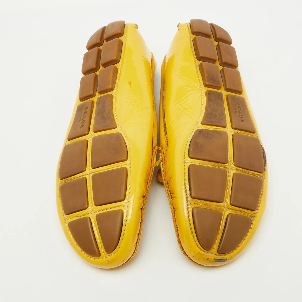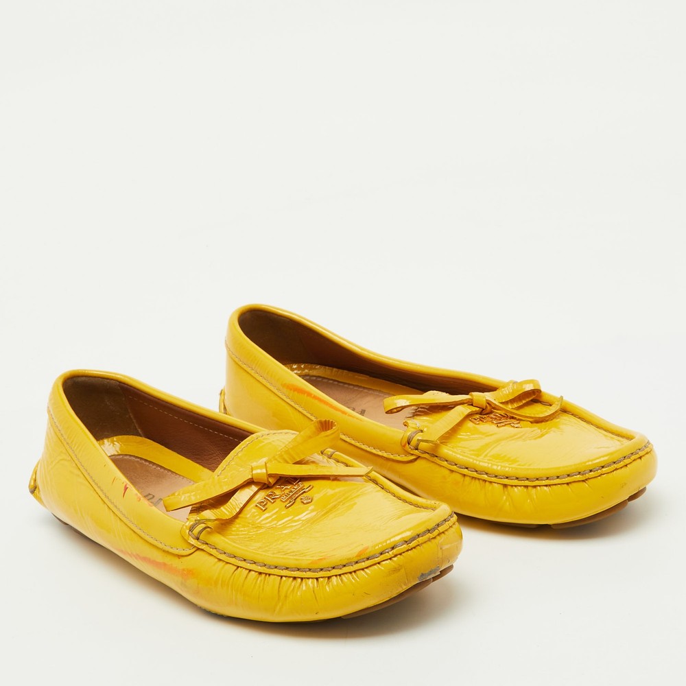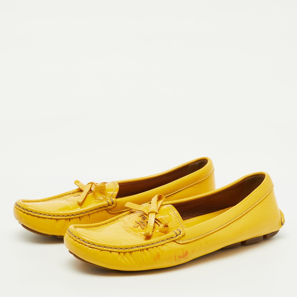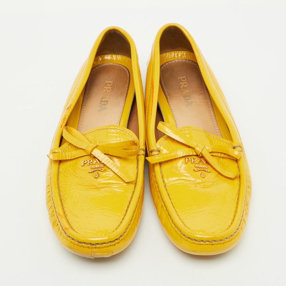 Elevate your shoe collection with these exquisite mustard yellow loafers from a renowned Italian fashion house. Crafted from glossy patent leather, they feature an elegant bow detail that adds a touch of sophistication. Lined with soft leather, these slip ons promise comfort and luxury with every step. The blend of leather and rubber in the sole ensures durability, making them a perfect fusion of style and practicality for the fashion conscious woman. Effortless elegance meets Italian craftsmanship.Certified by The Luxury Closet - This item has gone through a detailed authentication process overseen by our experts. We offer a lifetime guarantee of authenticity on all our items. Import duties, taxes and charges are not included in the item price. These charges are the buyers responsibility. Please check with your country’s customs office to determine what these additional cost will be prior to buying. Our eBay Store About Us Contact Us Add to Favorite Sellers Prada Mustard Yellow Patent Leather Bow Slip On Loafers Size 37.5 $157.3 Elevate your shoe collection with these exquisite mustard yellow loafers from a renowned Italian fashion house. Crafted from glossy patent leather, they feature an elegant bow detail that adds a touch of sophistication. Lined with soft leather, these slip ons promise comfort and luxury with every step. The blend of leather and rubber in the sole ensures durability, making them a perfect fusion of style and practicality for the fashion conscious woman. Effortless elegance meets Italian craftsmanship. Product Details Brand Color Yellow Dimensions Material Patent Leather Size 37.5 Outsole Width 8 cm Outsole Length 24 cm Heel Height Includes The Luxury Closet Packaging Certified by The Luxury Closet This item has gone through a detailed authentication process overseen by our experts. We offer a lifetime guarantee of authenticity on all our items. How We Check The in-house team of experts at The Luxury Closet is highly trained to verify the authenticity and the condition of the luxury products. They ensure that only 100% authentic items are put on sale.The evaluation process is unique with its own mix of assessment criteria and differs according to the category. Each item is evaluated based on the following combination of hallmarks, hardware, stitching, symmetry, material, craftsmanship, stamping, codes, hologram stickers, and packaging. Our authenticators also check if the items have been modified or amended (e.g., aftermarket diamonds, replaced batteries, repaired bags, etc.) International Buyers Import duties, taxes and charges are not included in the item price. These charges are the buyers responsibility. Please check with your country’s customs office to determine what these additional cost will be prior to buying.