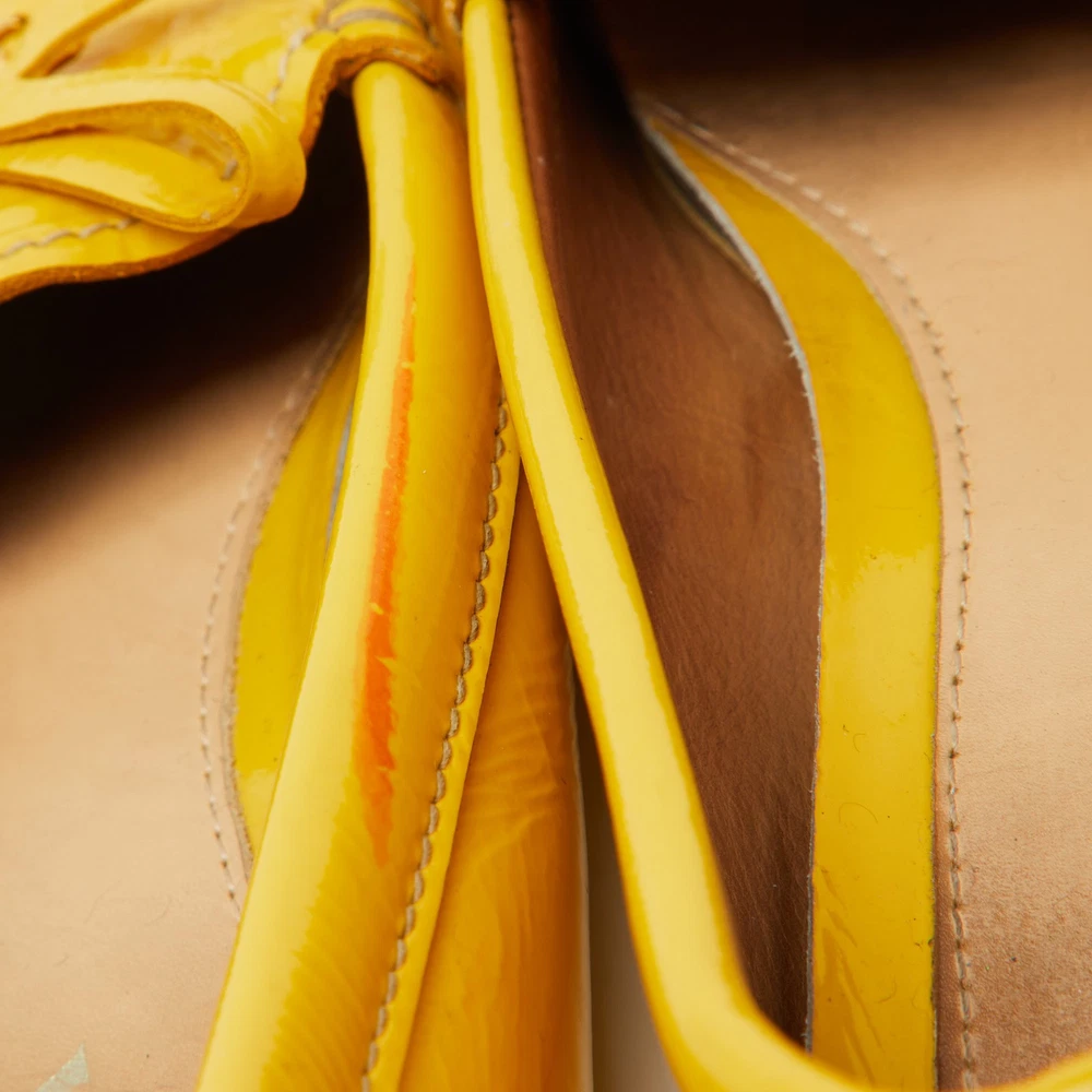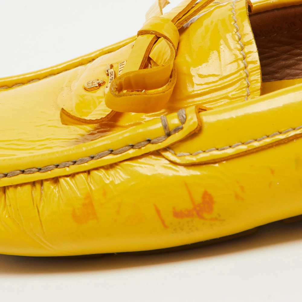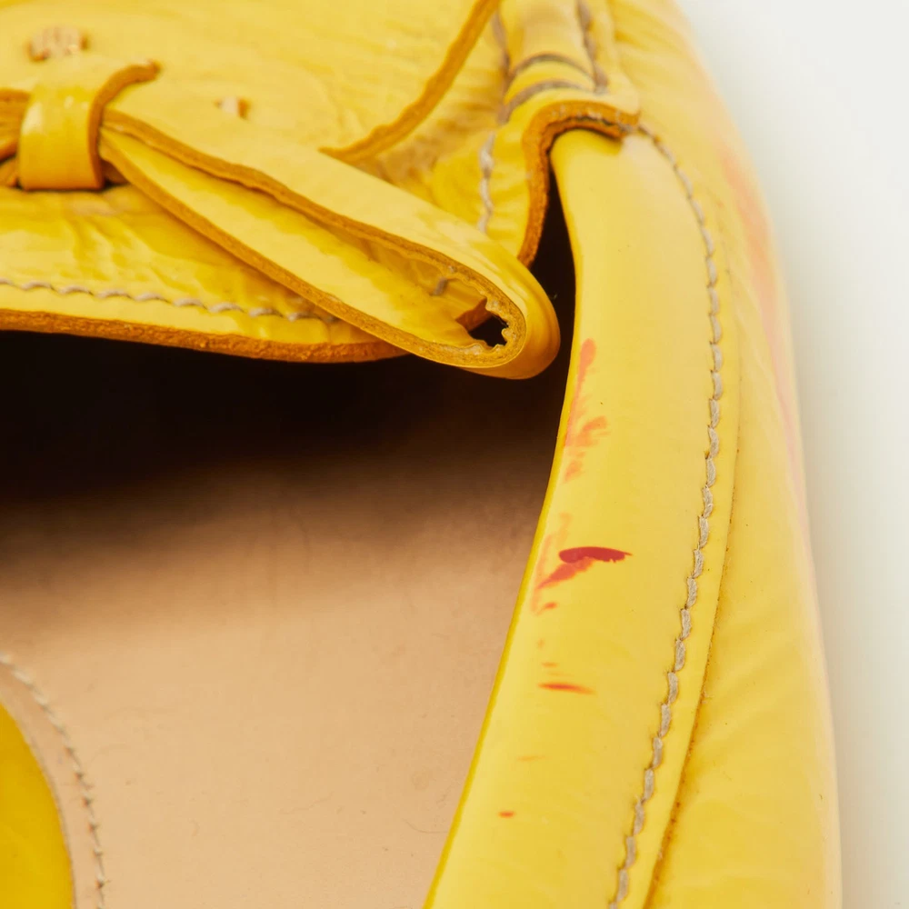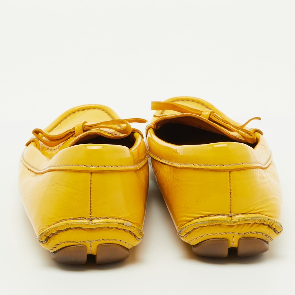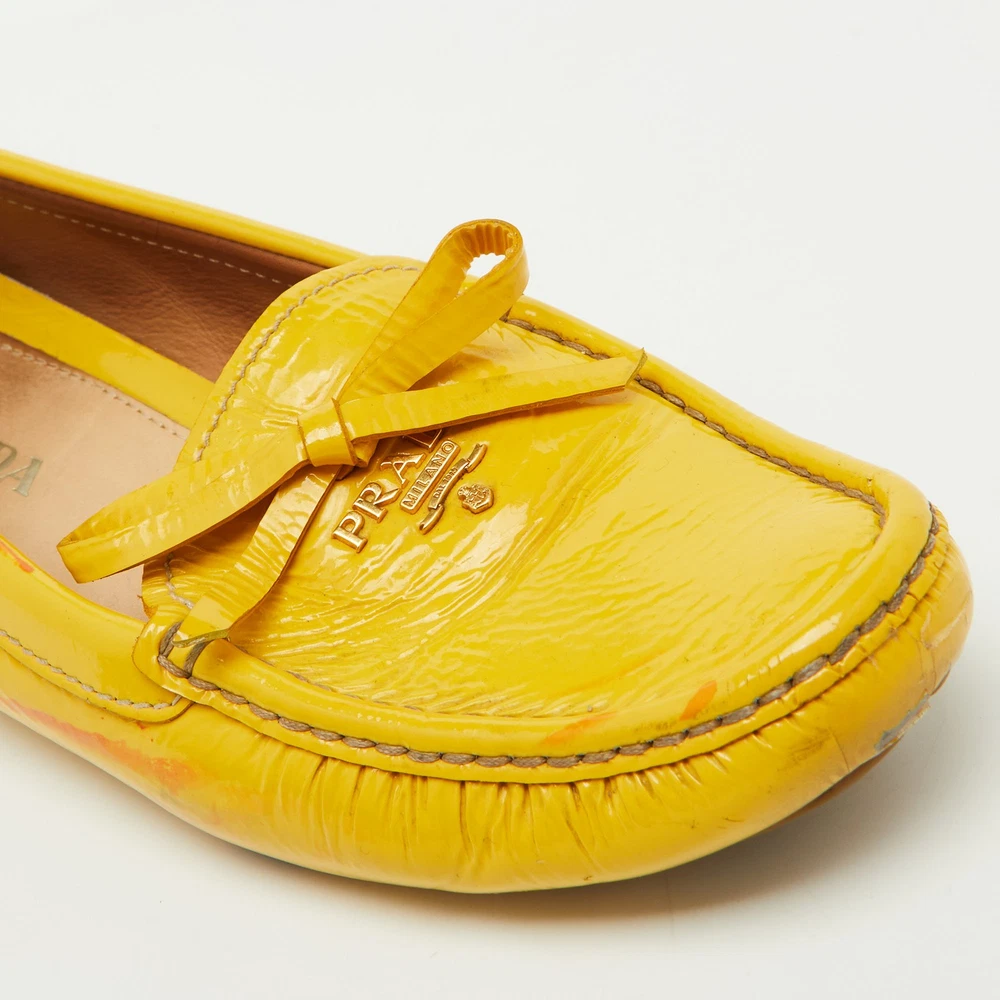 Elevate your shoe collection with these exquisite mustard yellow loafers from a renowned Italian fashion house. Crafted from glossy patent leather, they feature an elegant bow detail that adds a touch of sophistication. Lined with soft leather, these slip ons promise comfort and luxury with every step. The blend of leather and rubber in the sole ensures durability, making them a perfect fusion of style and practicality for the fashion conscious woman. Effortless elegance meets Italian craftsmanship.Certified by The Luxury Closet - This item has gone through a detailed authentication process overseen by our experts. We offer a lifetime guarantee of authenticity on all our items. Import duties, taxes and charges are not included in the item price. These charges are the buyers responsibility. Please check with your country’s customs office to determine what these additional cost will be prior to buying. Our eBay Store About Us Contact Us Add to Favorite Sellers Prada Mustard Yellow Patent Leather Bow Slip On Loafers Size 37.5 $157.3 Elevate your shoe collection with these exquisite mustard yellow loafers from a renowned Italian fashion house. Crafted from glossy patent leather, they feature an elegant bow detail that adds a touch of sophistication. Lined with soft leather, these slip ons promise comfort and luxury with every step. The blend of leather and rubber in the sole ensures durability, making them a perfect fusion of style and practicality for the fashion conscious woman. Effortless elegance meets Italian craftsmanship. Product Details Brand Color Yellow Dimensions Material Patent Leather Size 37.5 Outsole Width 8 cm Outsole Length 24 cm Heel Height Includes The Luxury Closet Packaging Certified by The Luxury Closet This item has gone through a detailed authentication process overseen by our experts. We offer a lifetime guarantee of authenticity on all our items. How We Check The in-house team of experts at The Luxury Closet is highly trained to verify the authenticity and the condition of the luxury products. They ensure that only 100% authentic items are put on sale.The evaluation process is unique with its own mix of assessment criteria and differs according to the category. Each item is evaluated based on the following combination of hallmarks, hardware, stitching, symmetry, material, craftsmanship, stamping, codes, hologram stickers, and packaging. Our authenticators also check if the items have been modified or amended (e.g., aftermarket diamonds, replaced batteries, repaired bags, etc.) International Buyers Import duties, taxes and charges are not included in the item price. These charges are the buyers responsibility. Please check with your country’s customs office to determine what these additional cost will be prior to buying.