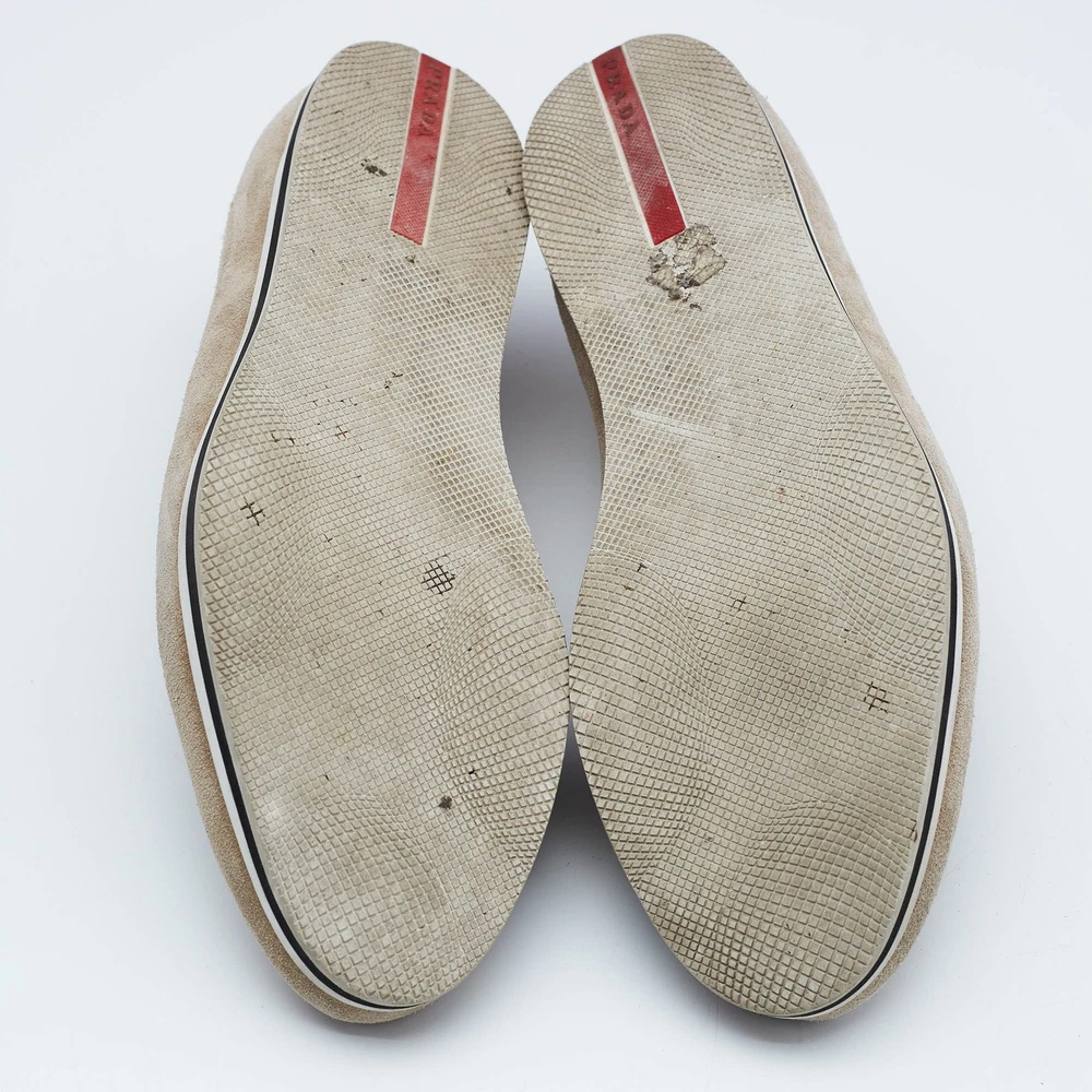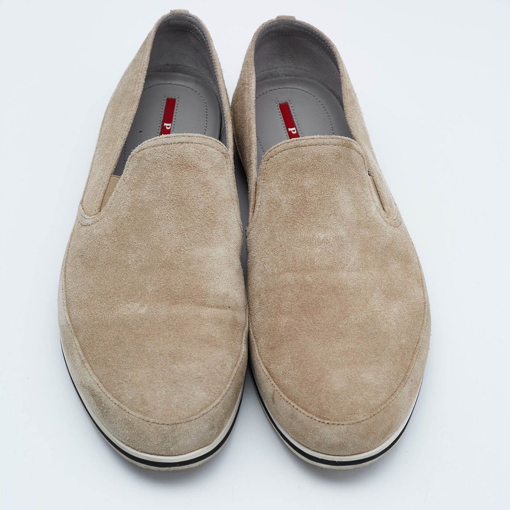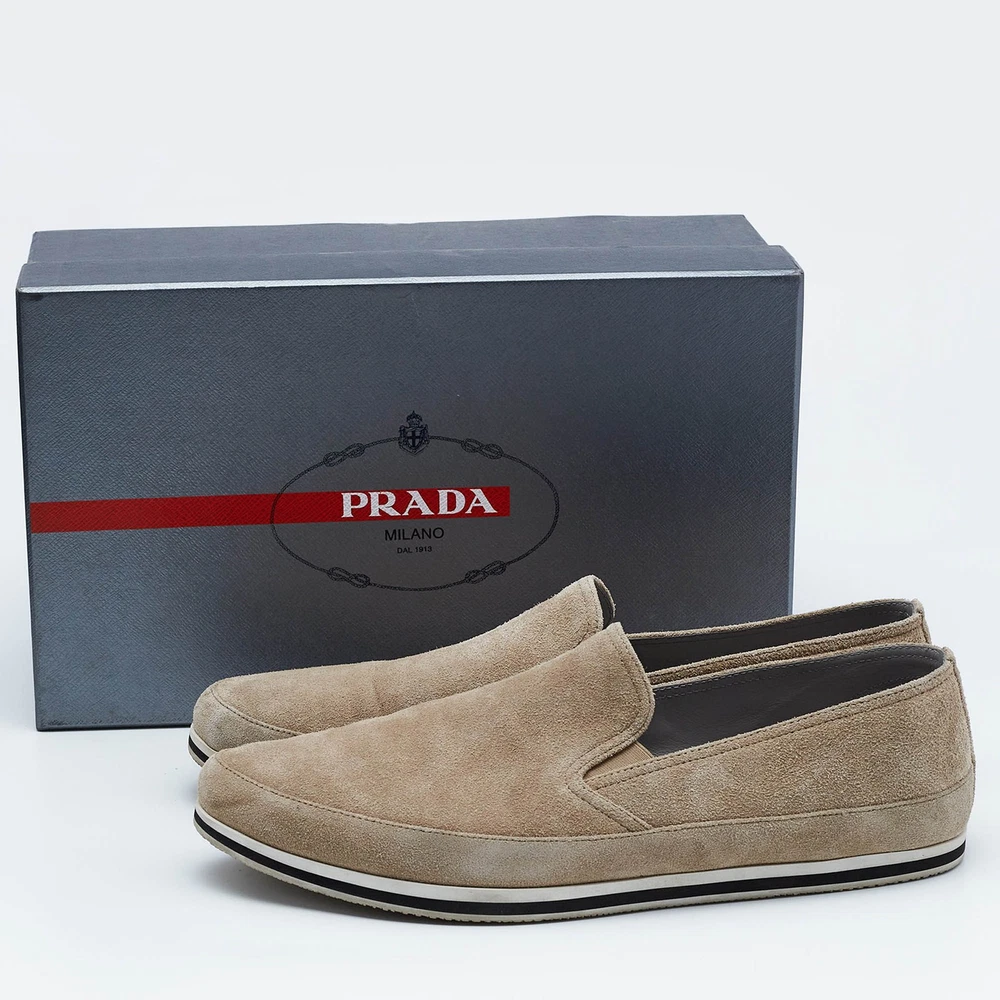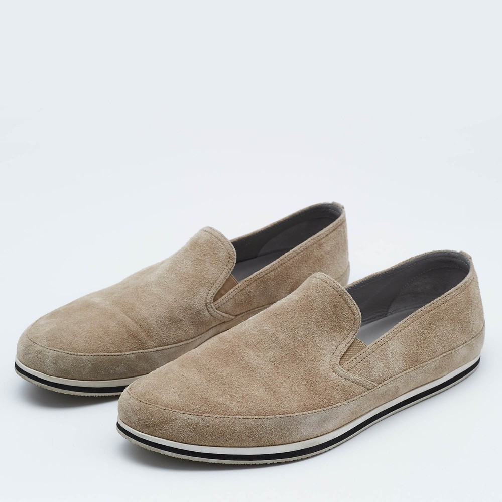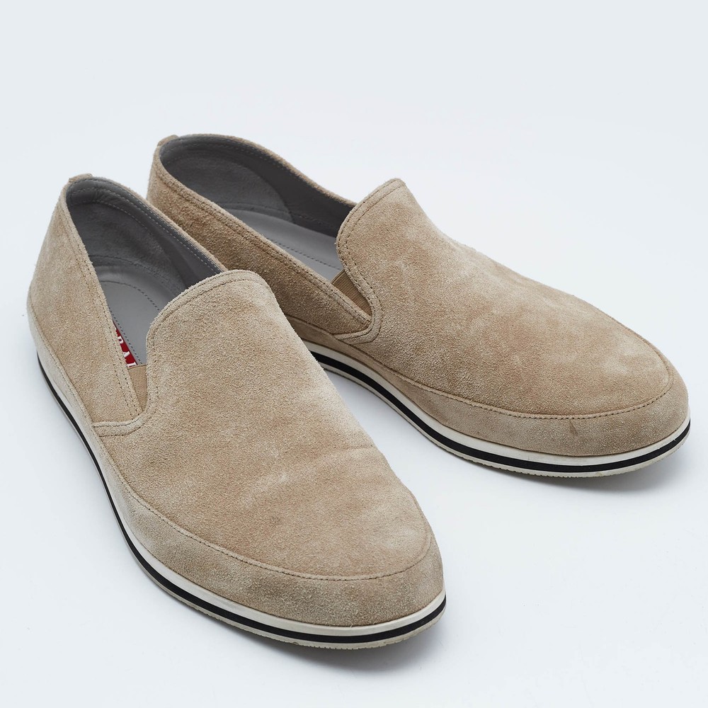 Let this comfortable pair be your first choice when youre out for a long day. These Prada Sport shoes have well sewn uppers beautifully set on durable soles.Certified by The Luxury Closet - This item has gone through a detailed authentication process overseen by our experts. We offer a lifetime guarantee of authenticity on all our items. Import duties, taxes and charges are not included in the item price. These charges are the buyers responsibility. Please check with your country’s customs office to determine what these additional cost will be prior to buying. Our eBay Store About Us Contact Us Add to Favorite Sellers Prada Sport Beige Suede Slip On Sneakers Size 45.5 $151.8 Let this comfortable pair be your first choice when youre out for a long day. These Prada Sport shoes have well sewn uppers beautifully set on durable soles. Product Details Brand Color Beige Dimensions Material Suede Size 45.5 Outsole Width 11 cm Outsole Length 32.5 cm Heel Height Includes Original Box Certified by The Luxury Closet This item has gone through a detailed authentication process overseen by our experts. We offer a lifetime guarantee of authenticity on all our items. How We Check The in-house team of experts at The Luxury Closet is highly trained to verify the authenticity and the condition of the luxury products. They ensure that only 100% authentic items are put on sale.The evaluation process is unique with its own mix of assessment criteria and differs according to the category. Each item is evaluated based on the following combination of hallmarks, hardware, stitching, symmetry, material, craftsmanship, stamping, codes, hologram stickers, and packaging. Our authenticators also check if the items have been modified or amended (e.g., aftermarket diamonds, replaced batteries, repaired bags, etc.) International Buyers Import duties, taxes and charges are not included in the item price. These charges are the buyers responsibility. Please check with your country’s customs office to determine what these additional cost will be prior to buying.