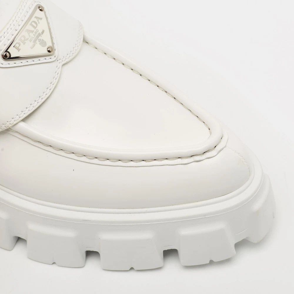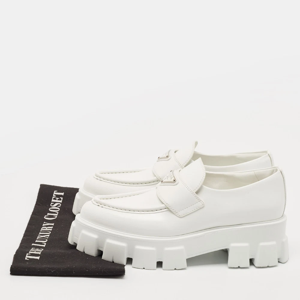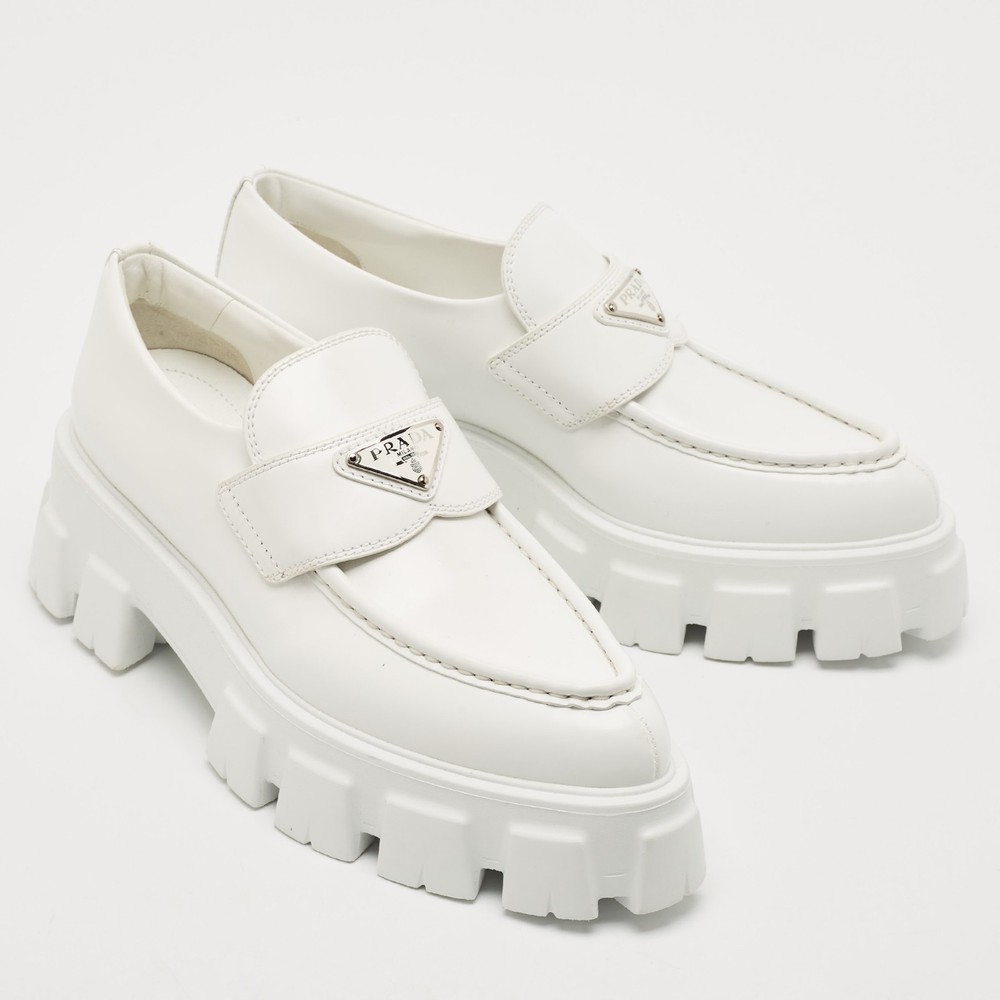 These Prada lafers bring a futuristic edge to classic loafers with their clean white leather design and bold triangle logo detail. on the front The Monolith sole ensures maximum comfort, while the contemporary silhouette keeps the look chic and modern. Perfect for adding a touch of luxury to everyday wear.Certified by The Luxury Closet - This item has gone through a detailed authentication process overseen by our experts. We offer a lifetime guarantee of authenticity on all our items. Import duties, taxes and charges are not included in the item price. These charges are the buyers responsibility. Please check with your country’s customs office to determine what these additional cost will be prior to buying. Our eBay Store About Us Contact Us Add to Favorite Sellers Prada White Leather Monolith Triangle Logo Loafers Size 39 $544.5 These Prada lafers bring a futuristic edge to classic loafers with their clean white leather design and bold triangle logo detail. on the front The Monolith sole ensures maximum comfort, while the contemporary silhouette keeps the look chic and modern. Perfect for adding a touch of luxury to everyday wear. Product Details Brand Color White Dimensions Material Leather Size 39 Outsole Width 11 cm Outsole Length 27 cm Heel Height 6 cm Includes The Luxury Closet Packaging Certified by The Luxury Closet This item has gone through a detailed authentication process overseen by our experts. We offer a lifetime guarantee of authenticity on all our items. How We Check The in-house team of experts at The Luxury Closet is highly trained to verify the authenticity and the condition of the luxury products. They ensure that only 100% authentic items are put on sale.The evaluation process is unique with its own mix of assessment criteria and differs according to the category. Each item is evaluated based on the following combination of hallmarks, hardware, stitching, symmetry, material, craftsmanship, stamping, codes, hologram stickers, and packaging. Our authenticators also check if the items have been modified or amended (e.g., aftermarket diamonds, replaced batteries, repaired bags, etc.) International Buyers Import duties, taxes and charges are not included in the item price. These charges are the buyers responsibility. Please check with your country’s customs office to determine what these additional cost will be prior to buying.