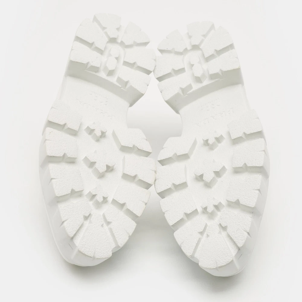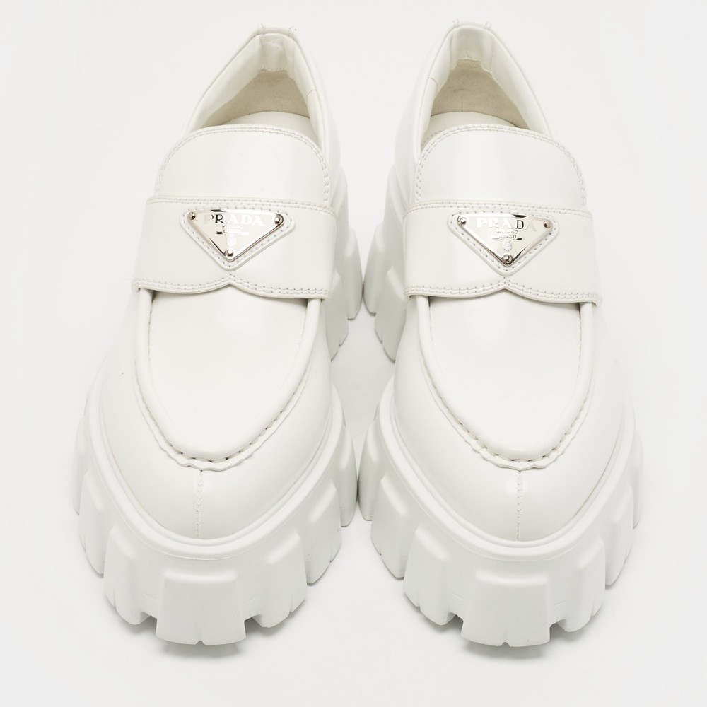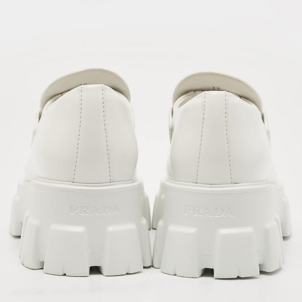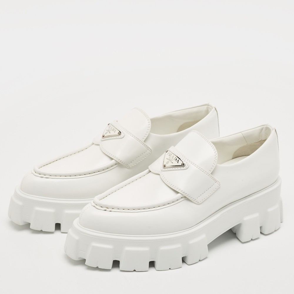 These Prada lafers bring a futuristic edge to classic loafers with their clean white leather design and bold triangle logo detail. on the front The Monolith sole ensures maximum comfort, while the contemporary silhouette keeps the look chic and modern. Perfect for adding a touch of luxury to everyday wear.Certified by The Luxury Closet - This item has gone through a detailed authentication process overseen by our experts. We offer a lifetime guarantee of authenticity on all our items. Import duties, taxes and charges are not included in the item price. These charges are the buyers responsibility. Please check with your country’s customs office to determine what these additional cost will be prior to buying. Our eBay Store About Us Contact Us Add to Favorite Sellers Prada White Leather Monolith Triangle Logo Loafers Size 39 $544.5 These Prada lafers bring a futuristic edge to classic loafers with their clean white leather design and bold triangle logo detail. on the front The Monolith sole ensures maximum comfort, while the contemporary silhouette keeps the look chic and modern. Perfect for adding a touch of luxury to everyday wear. Product Details Brand Color White Dimensions Material Leather Size 39 Outsole Width 11 cm Outsole Length 27 cm Heel Height 6 cm Includes The Luxury Closet Packaging Certified by The Luxury Closet This item has gone through a detailed authentication process overseen by our experts. We offer a lifetime guarantee of authenticity on all our items. How We Check The in-house team of experts at The Luxury Closet is highly trained to verify the authenticity and the condition of the luxury products. They ensure that only 100% authentic items are put on sale.The evaluation process is unique with its own mix of assessment criteria and differs according to the category. Each item is evaluated based on the following combination of hallmarks, hardware, stitching, symmetry, material, craftsmanship, stamping, codes, hologram stickers, and packaging. Our authenticators also check if the items have been modified or amended (e.g., aftermarket diamonds, replaced batteries, repaired bags, etc.) International Buyers Import duties, taxes and charges are not included in the item price. These charges are the buyers responsibility. Please check with your country’s customs office to determine what these additional cost will be prior to buying.