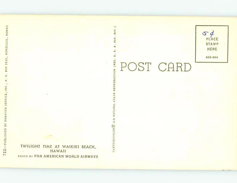 Material: Paper City: Honolulu Type: Printed (Lithograph) Continent: North America Country: USA Unit of Sale: Single Unit Theme: Seascape Features: Chrome Era: see features for era Postage Condition: n/a Original/Licensed Reprint: Original Signed: No Size: Standard (5.5 x 3.5 in) Region: Hawaii Country/Region of Manufacture: United States