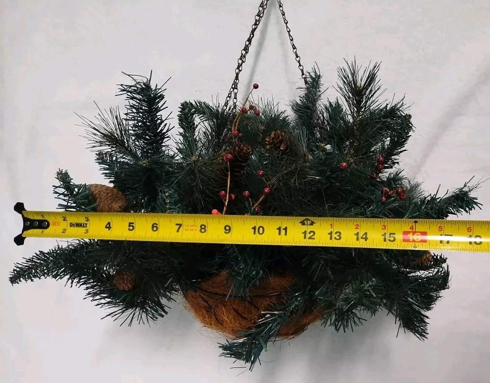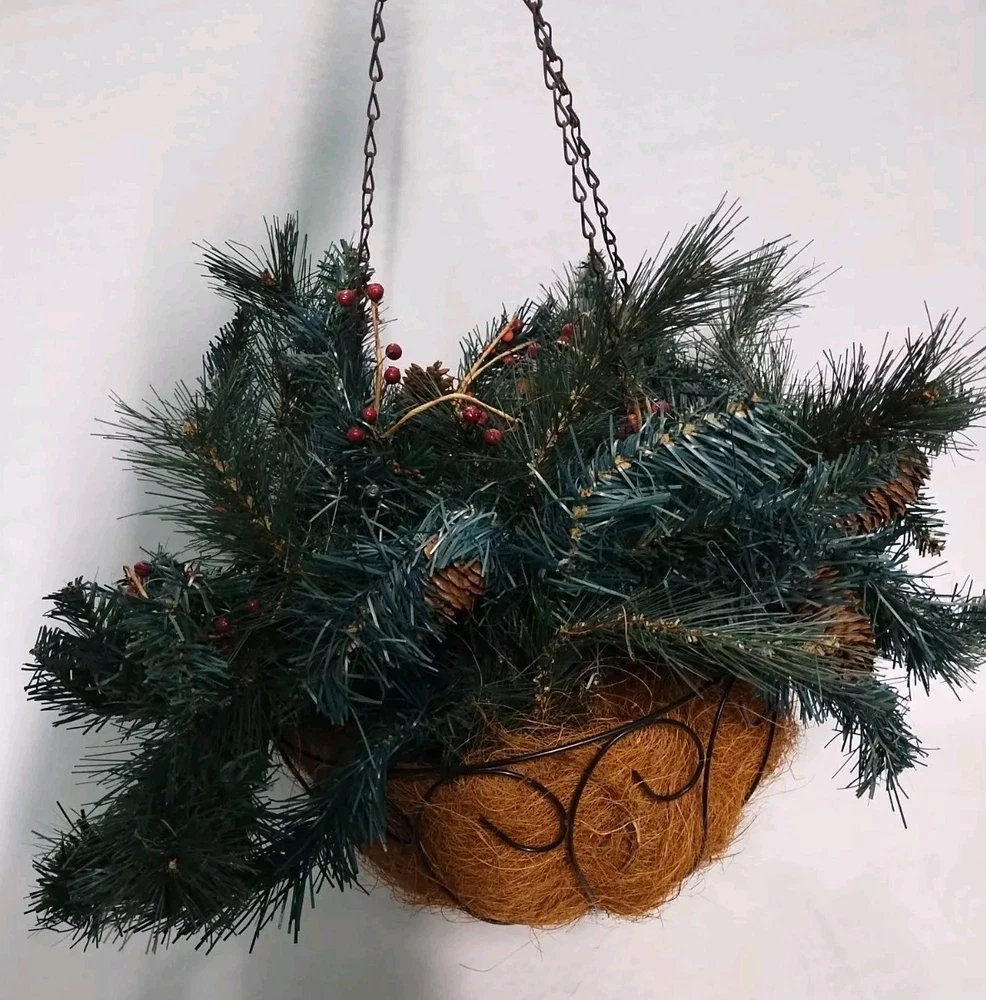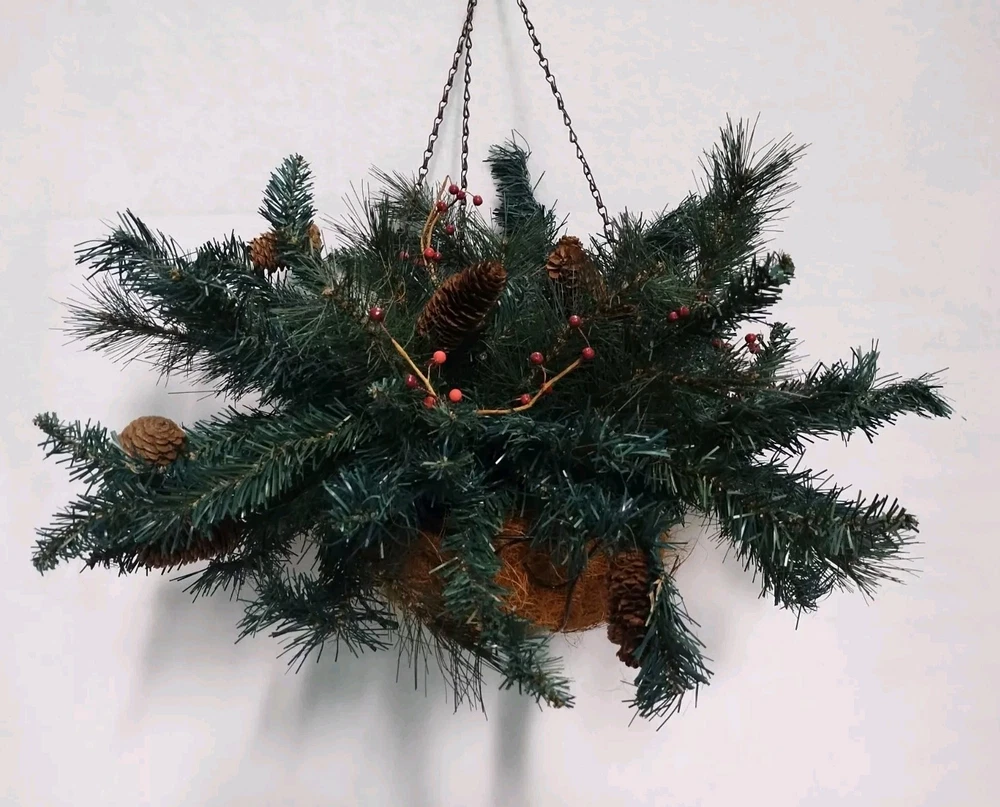 The "Pre-Lit Artificial Christmas Hanging Basket", designed for Christmas decorations. It features a lighted evergreen plant that is battery-operated with a timer function, adding a festive touch to any space. This hanging decoration is perfect for creating a cozy and inviting atmosphere during the holiday season, while eliminating the need for manual operation due to its timer feature.